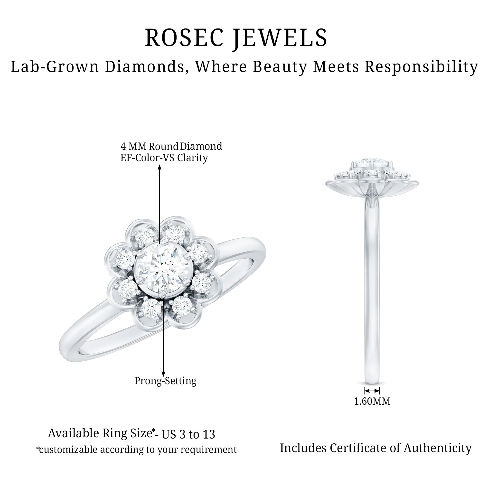 Simply stunning, this Diamond Promise Ring is designed for the woman who loves minimalist pieces of jewelry but with a touch of natures elegance. It is embellished with 4 MM round cut diamond (EF-VS quality), set in prong setting and surrounded with smaller stones. The metal frame adds a touch of floral charm while keeping the Lab Made Diamond Ring lightweight and comfortable for everyday wear. Also, all the gemstones in this Diamond Flower Ring are synthetic and certified and offer the same brilliance and durability as natural ones but are created in an eco-friendly and sustainable way, making this piece a responsible and stylish choice. Presented in a premium box, its the perfect choice for a moment youll cherish forever.