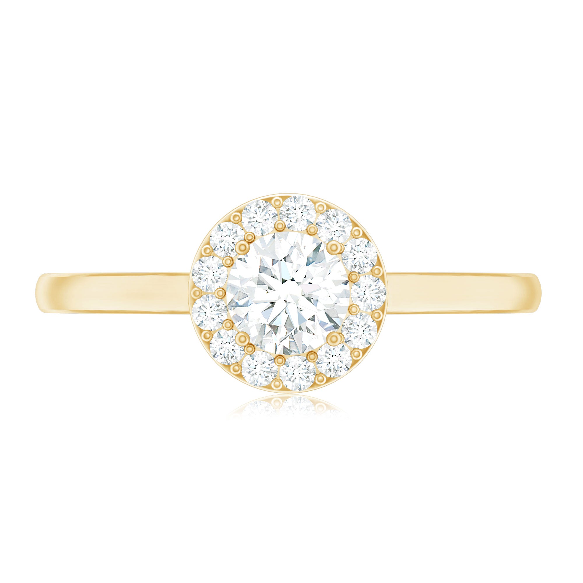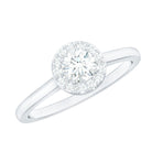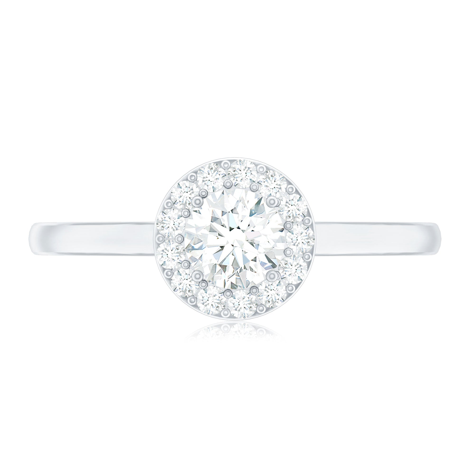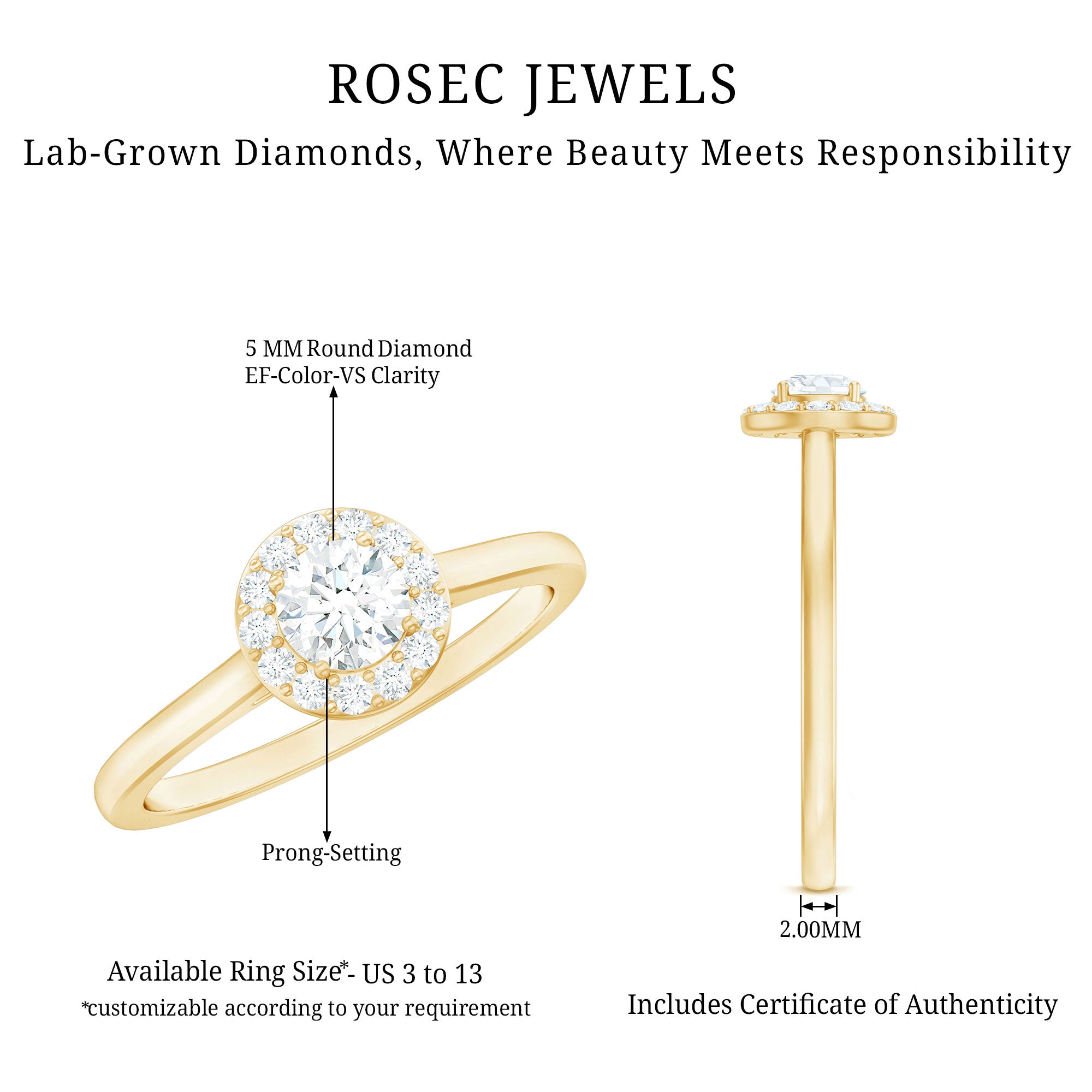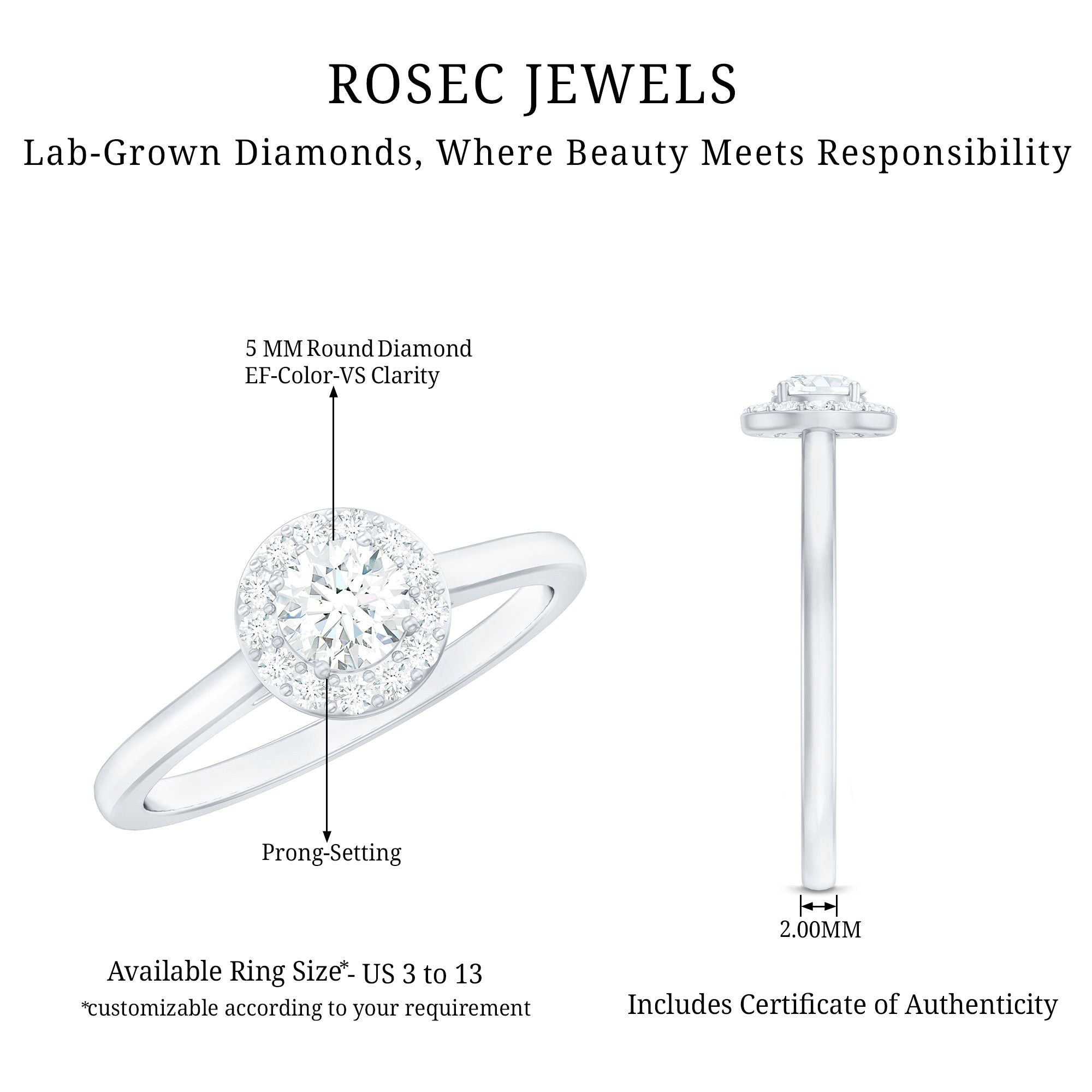 Big moments deserve big sparkle - this Diamond Engagement Ring is here to seal the deal with a flash of unmatched brilliance. This Promise Ring features a 5 MM round cut lab grown diamond set in the center in a secure prong setting encircled by a dazzling halo of dainty round cut stones. The sleek plain metal band of this Halo Engagement Ring allows the EF-VS quality diamonds to shine without distraction, embodying simplicity and sophistication in one. Whether you are planning a proposal or celebrating a milestone, this timeless beauty is designed to make the moment unforgettable. Get your hands on this April Birthstone Ring now and make your forever shine even brighter.