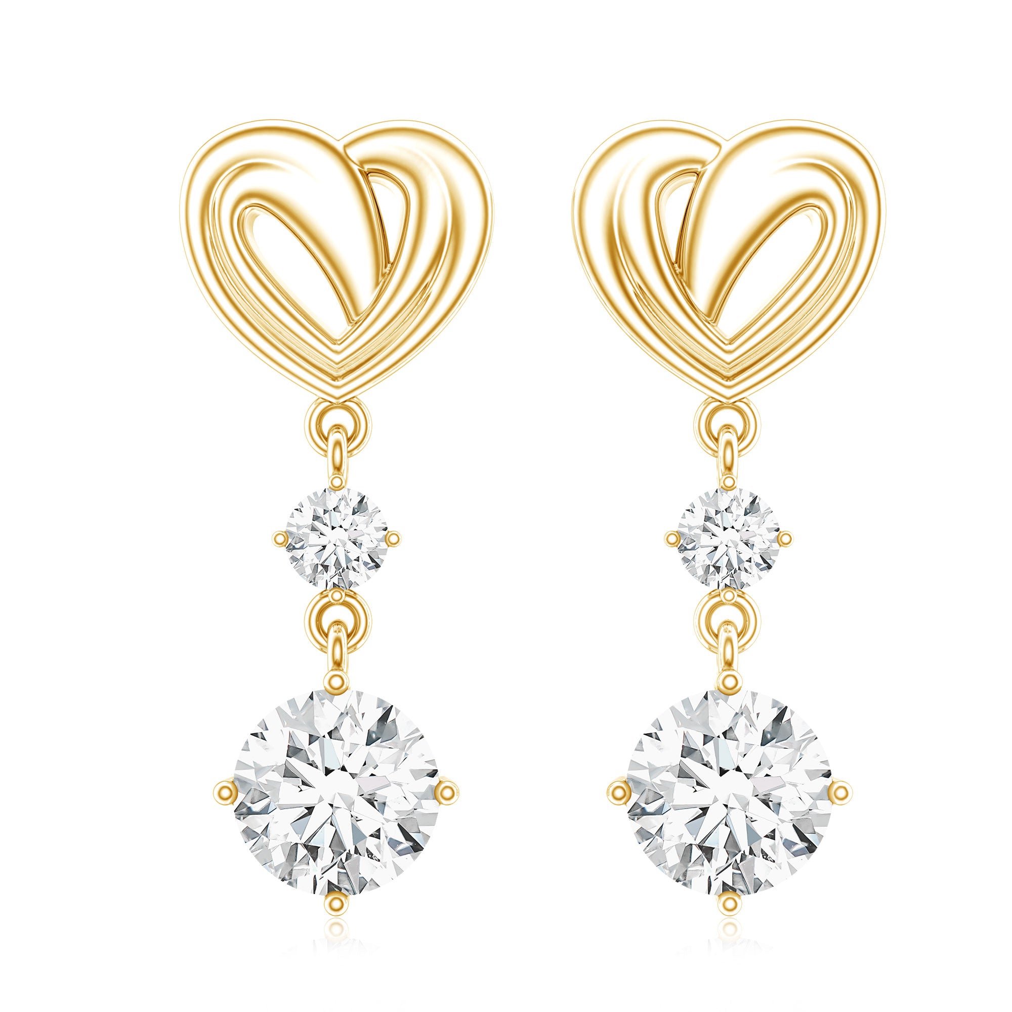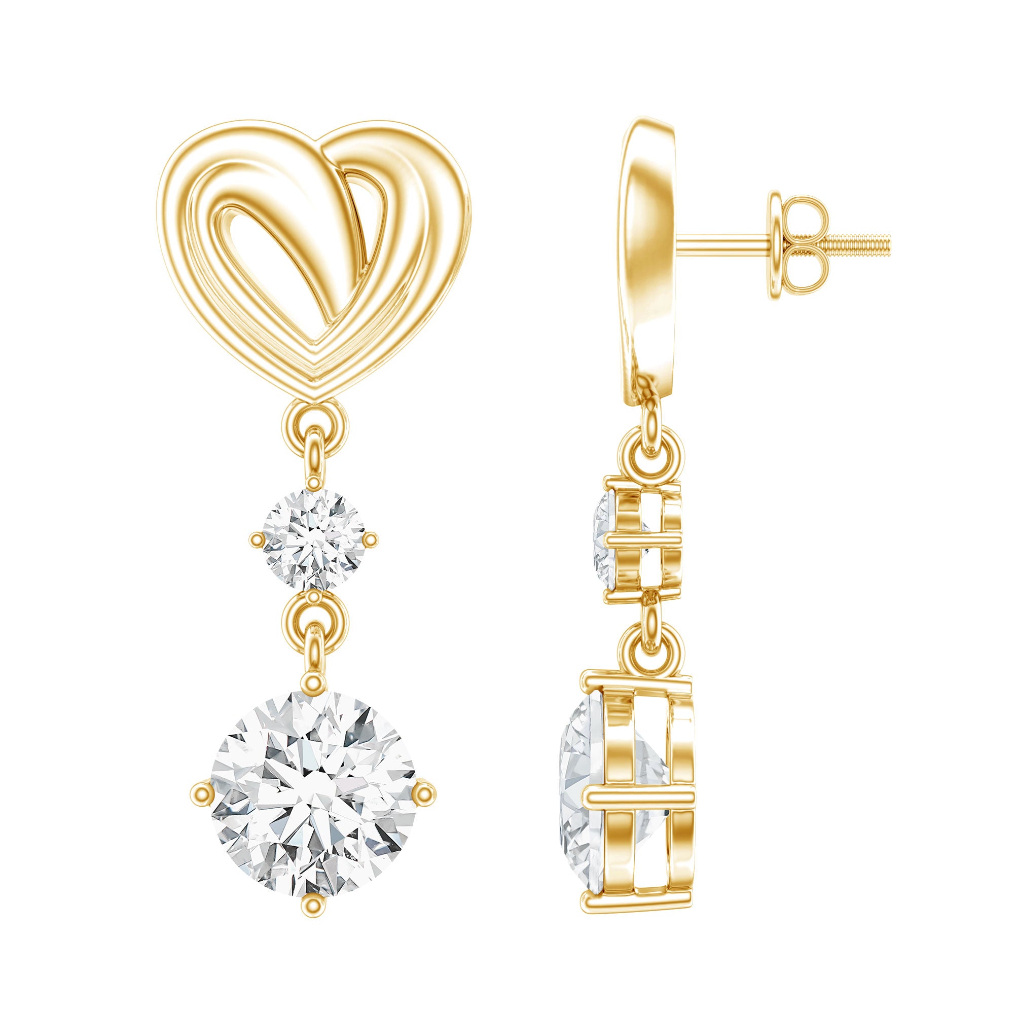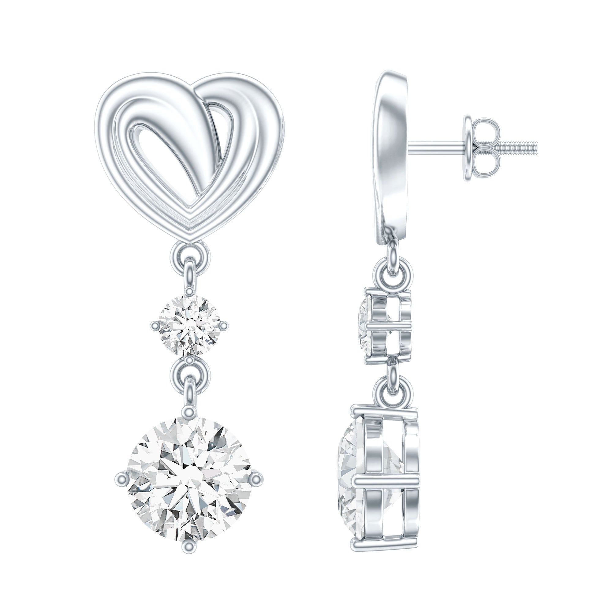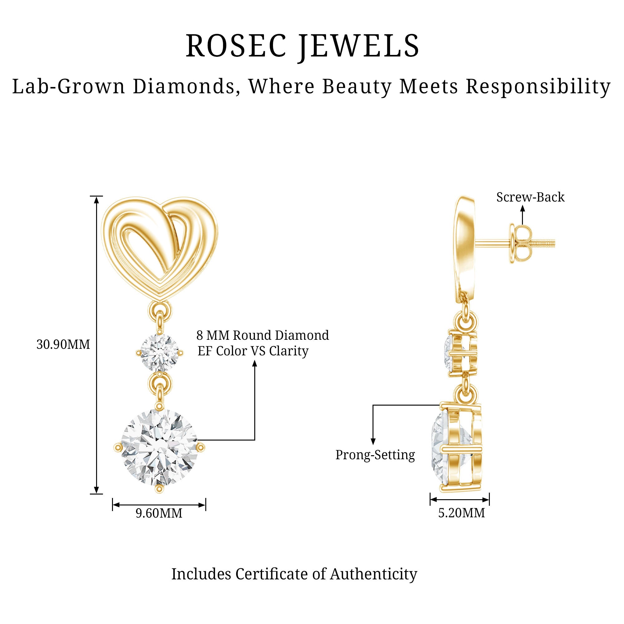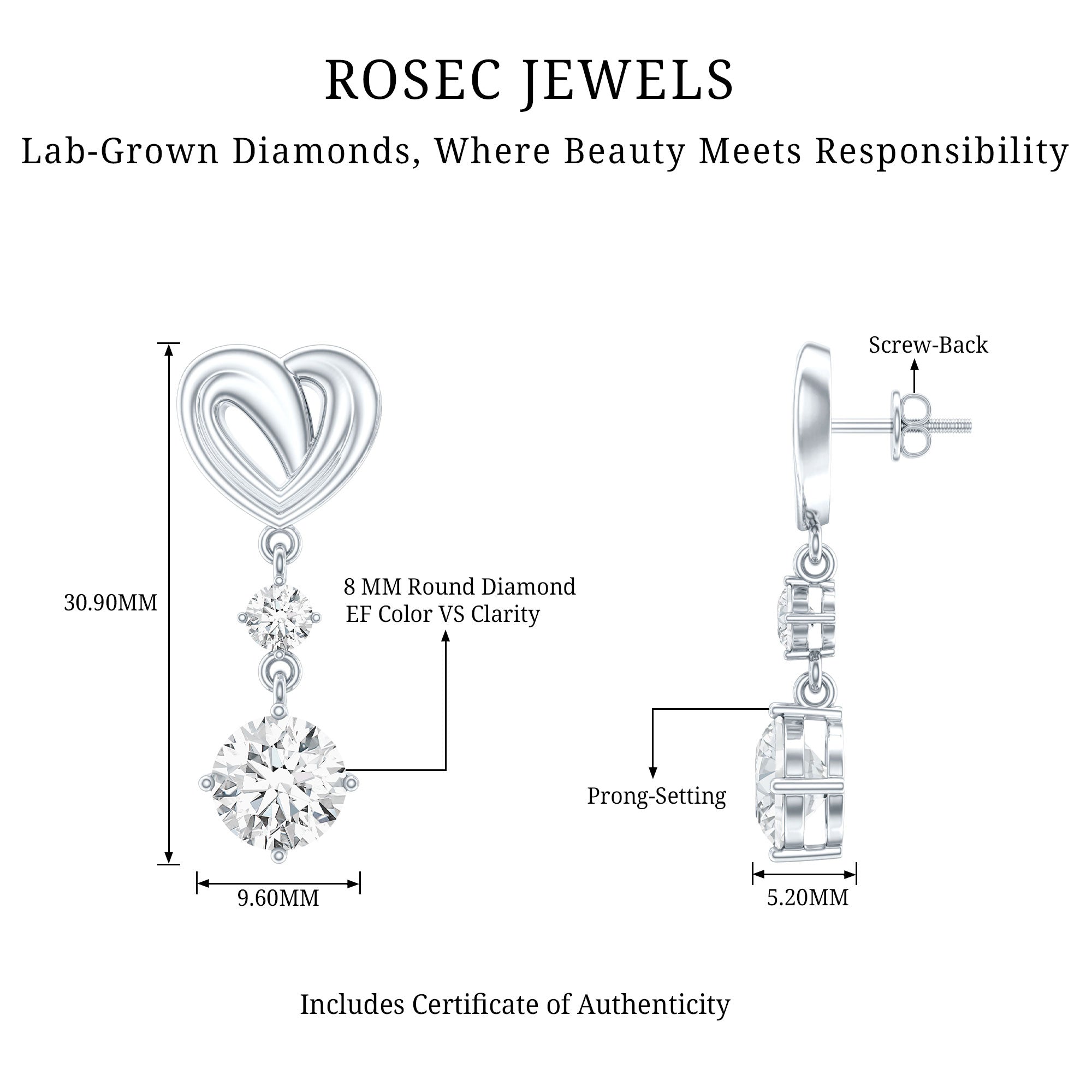 Let your love shine as bright as these dazzling Diamond Drop Earrings. These Heart Earrings feature a romantic and artistic three-layer design, beginning with an elegant metal heart shaped element that adds a touch of sophistication. Suspended below the heart is a stunning 4 MM round stone delicately linked with an 8 MM round cut lab grown diamond of EF-VS quality set in prong setting. Thoughtfully crafted for both comfort and security, these Diamond Hanging Earrings come with screw back closure, ensuring a perfect fit for all day wear. Whether you are celebrating a milestone, adding a special touch to your bridal look, or searching for the ultimate gift, these Dangle Drop Earrings are a timeless symbol of love and elegance.
