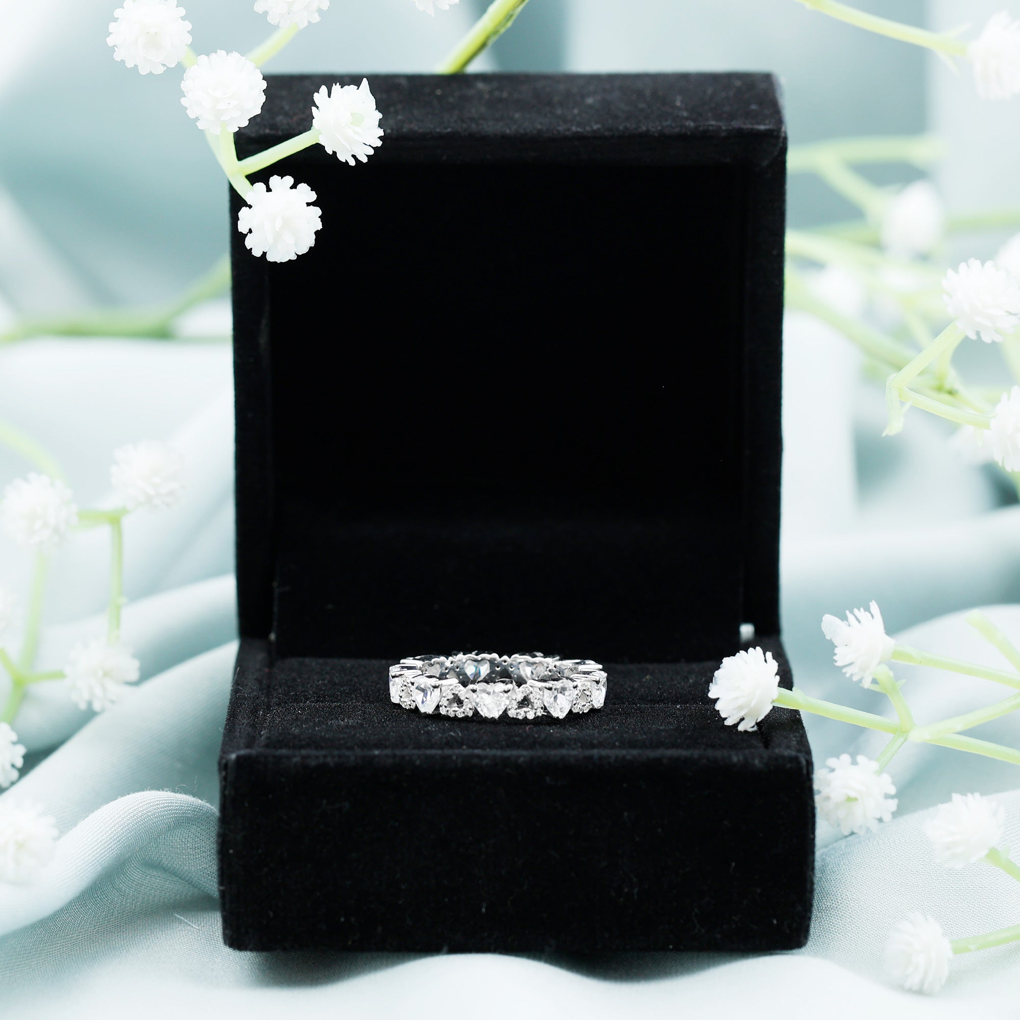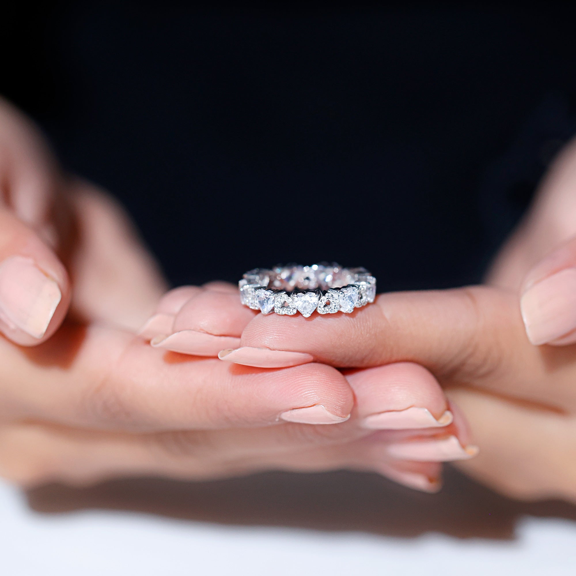 This Diamond Eternity Band Ring is curated to symbolize eternal love, where every heart and gemstone tells a story of forever. The design features heart shaped lab made diamonds and open heart shaped motifs adorned with small round cut diamonds, both the elements are set in an alternating pattern which adds a unique contrast of sparkle and elegance. This Full Eternity Ring ensures a seamless circle of beauty, making it a timeless treasure that radiates grace from every angle. This Heart Wedding band is a versatile statement piece that can be worn solo for a sophisticated and elegant look or stacked with another ring to create a personalized and stylish stack.