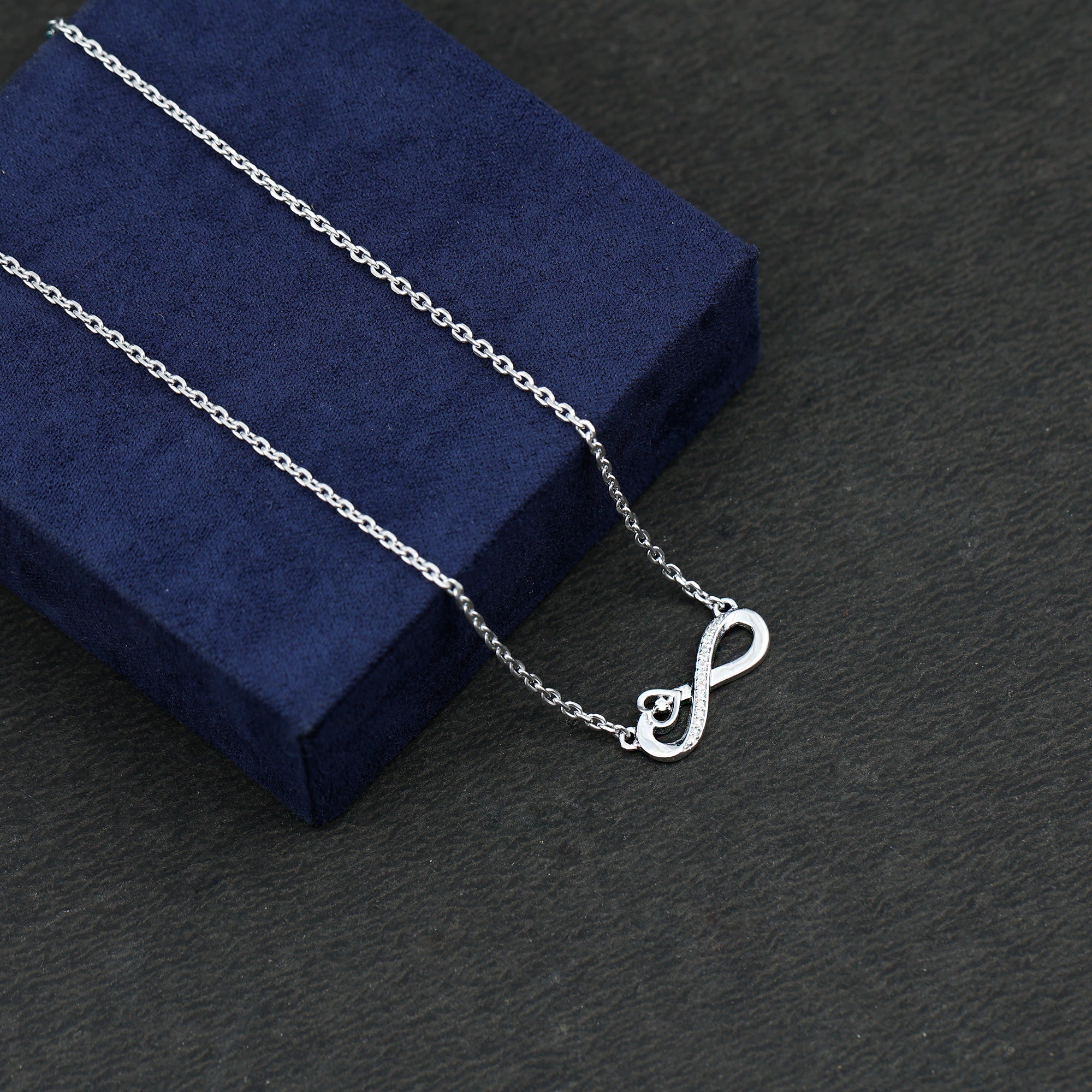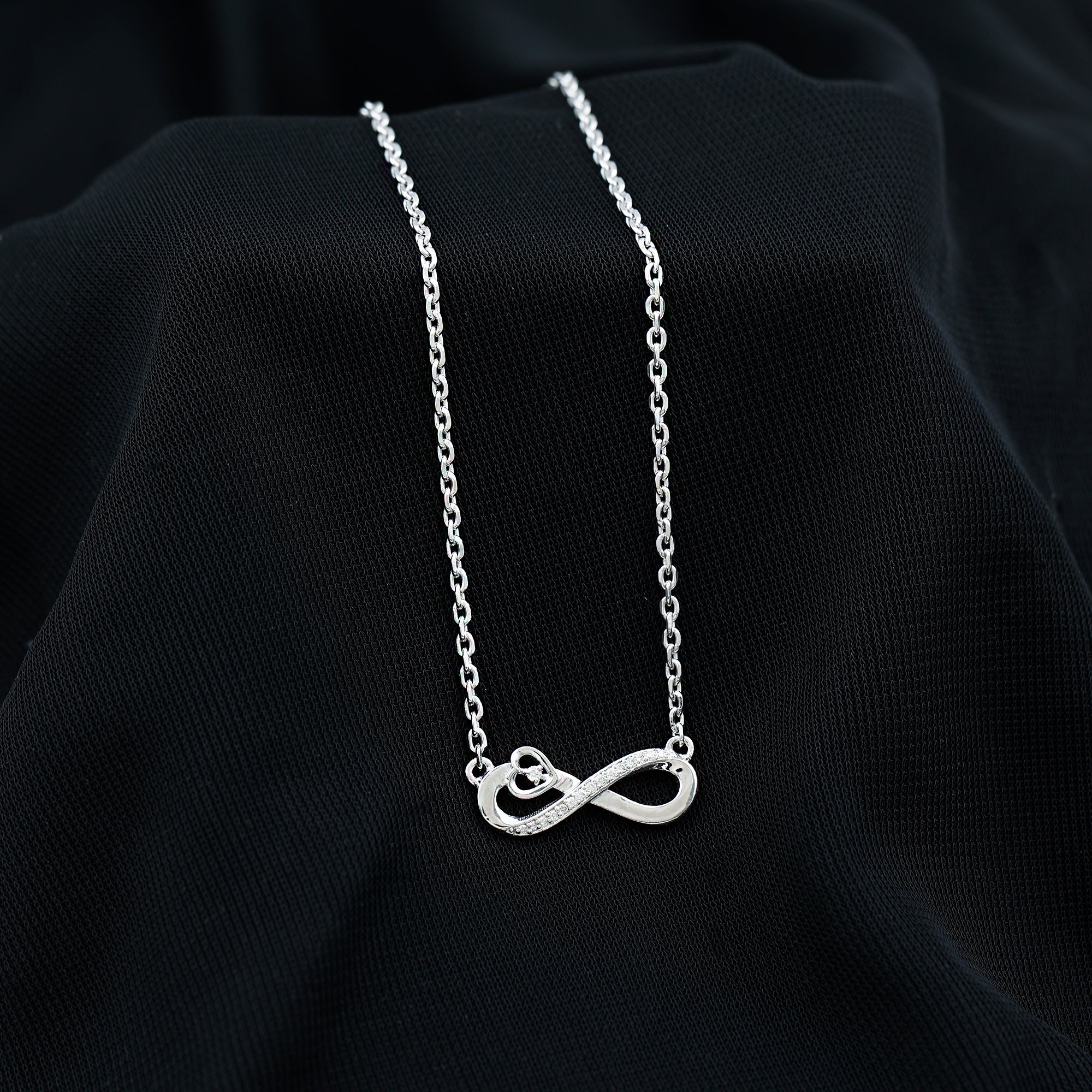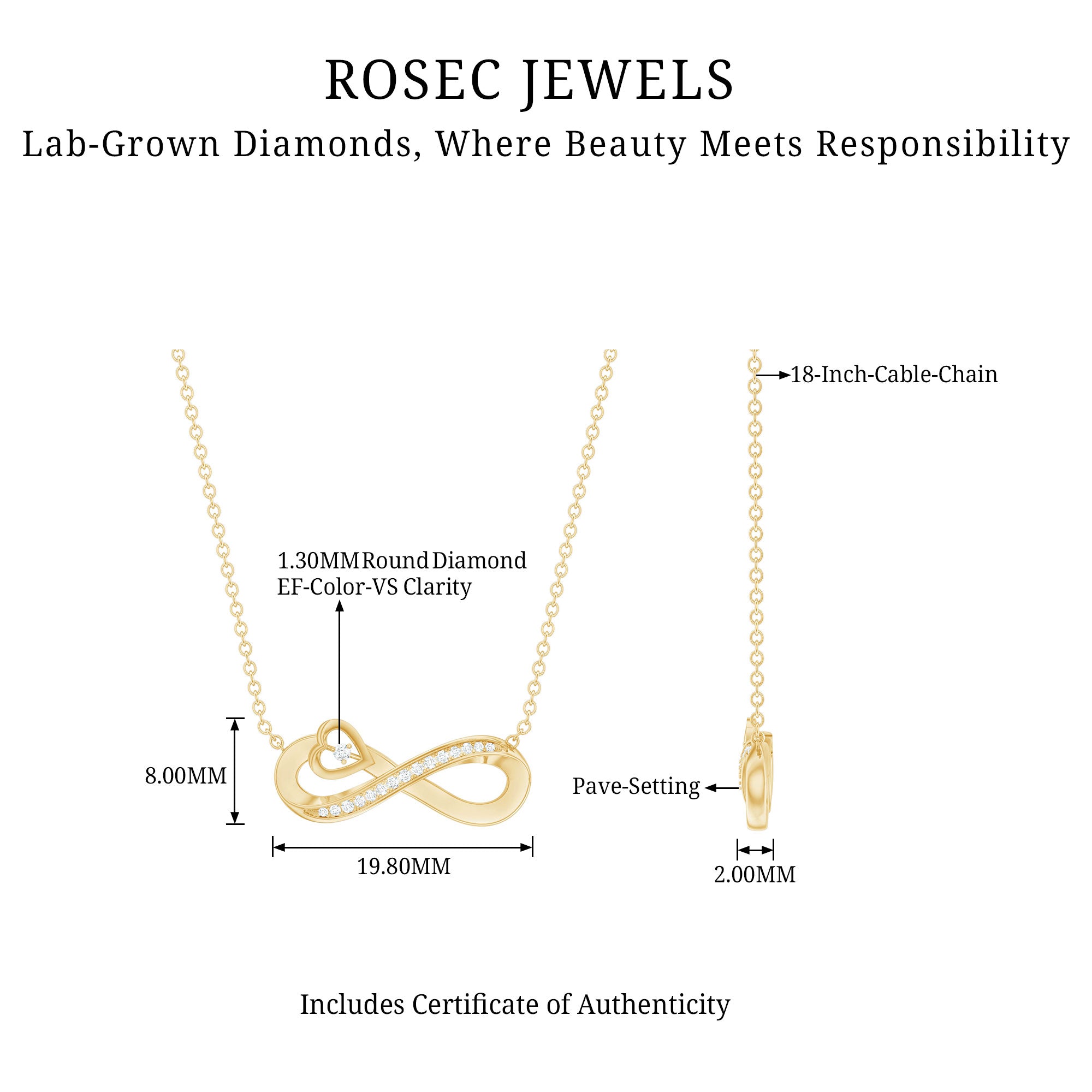 Rosec Jewelers Infinity Heart Necklace reflects the beauty of eternity and a love that never ends. The design of this Diamond Infinity Necklace features a flowing ribbon-like smoothness that gracefully curves into the shape of an infinity and open heart shape, nestled with round petite diamonds of EF-VS quality in pave setting. Perfect for everyday wear elegance or special occasions, this Lab Grown Diamond Pendant is a meaningful gift for anniversaries, birthdays, Valentines Day, or any moment when you want to remind someone of your everlasting love and devotion.
