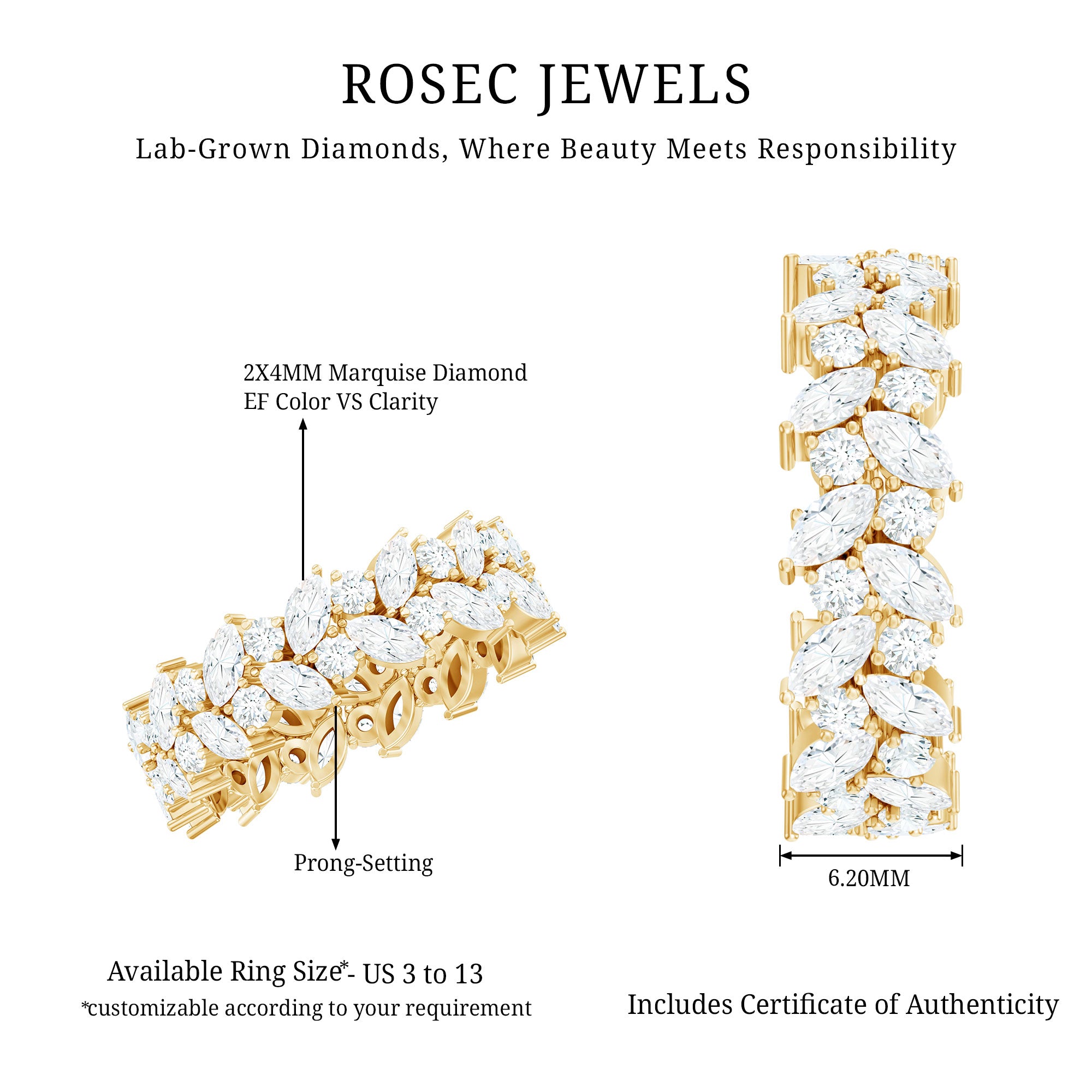 Treat the one you love with this captivating Diamond Wedding Band Ring, it is sure to make her heart skip a beat. A perfect addition to her Jewelry Collection, this Leaf Eternity Ring complements all her favorite looks with unmatched sparkle. It features two rows of alternating marquise and round shaped lab grown diamonds, carefully arranged and set in secure prong setting. The diamonds are lab grown and boost EF-VS quality, so you can get the same sparkle and durability as the mined ones but in a more affordable way. Whether it is your wedding or anniversary, or you are attending a formal party or casual dinner, this Diamond Eternity Band brings a perfect balance of nature-inspired beauty and timeless sophistication.