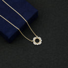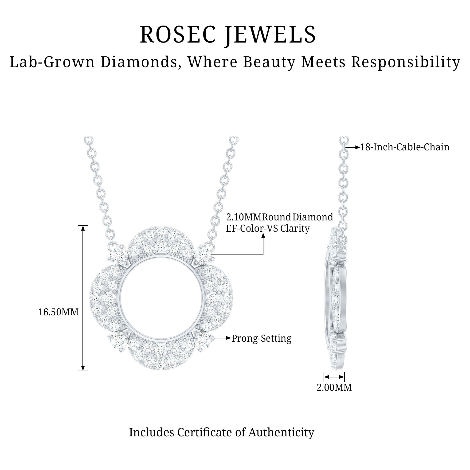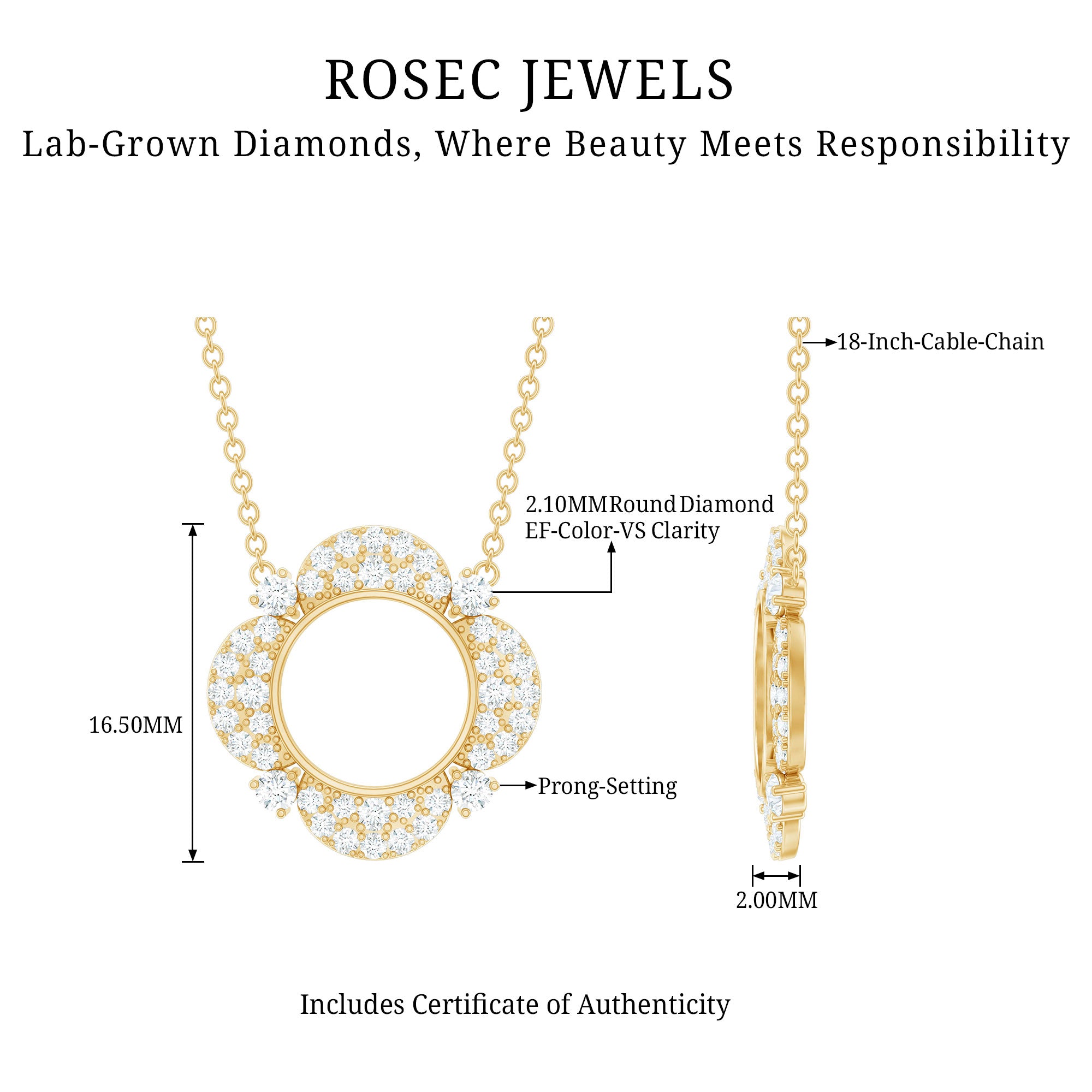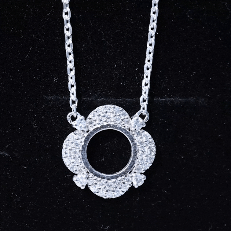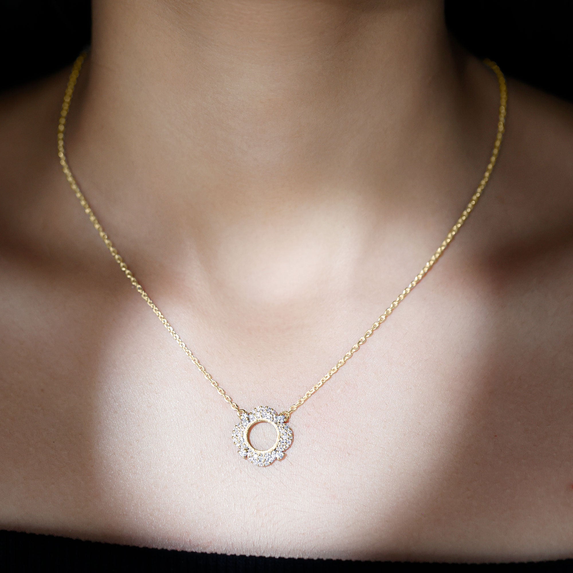 Shine bright and make a statement with this Diamond Eternity Necklace, it features a classic open circle design, symbolizing infinity and endless possibilities. But what makes it stand out is the gorgeous floral-inspired pattern around the edges. Clusters of shimmering round cut diamonds (unnatural) are set in a way that gives the Designer Necklace a petal-like effect. The Diamond Flower Necklace is as versatile as it is stunning, perfect to upgrade any casual and formal look. The gemstones in this necklace are lab grown providing the same sparkle and durability as natural stones but in a more eco-friendly and budget-friendly way.