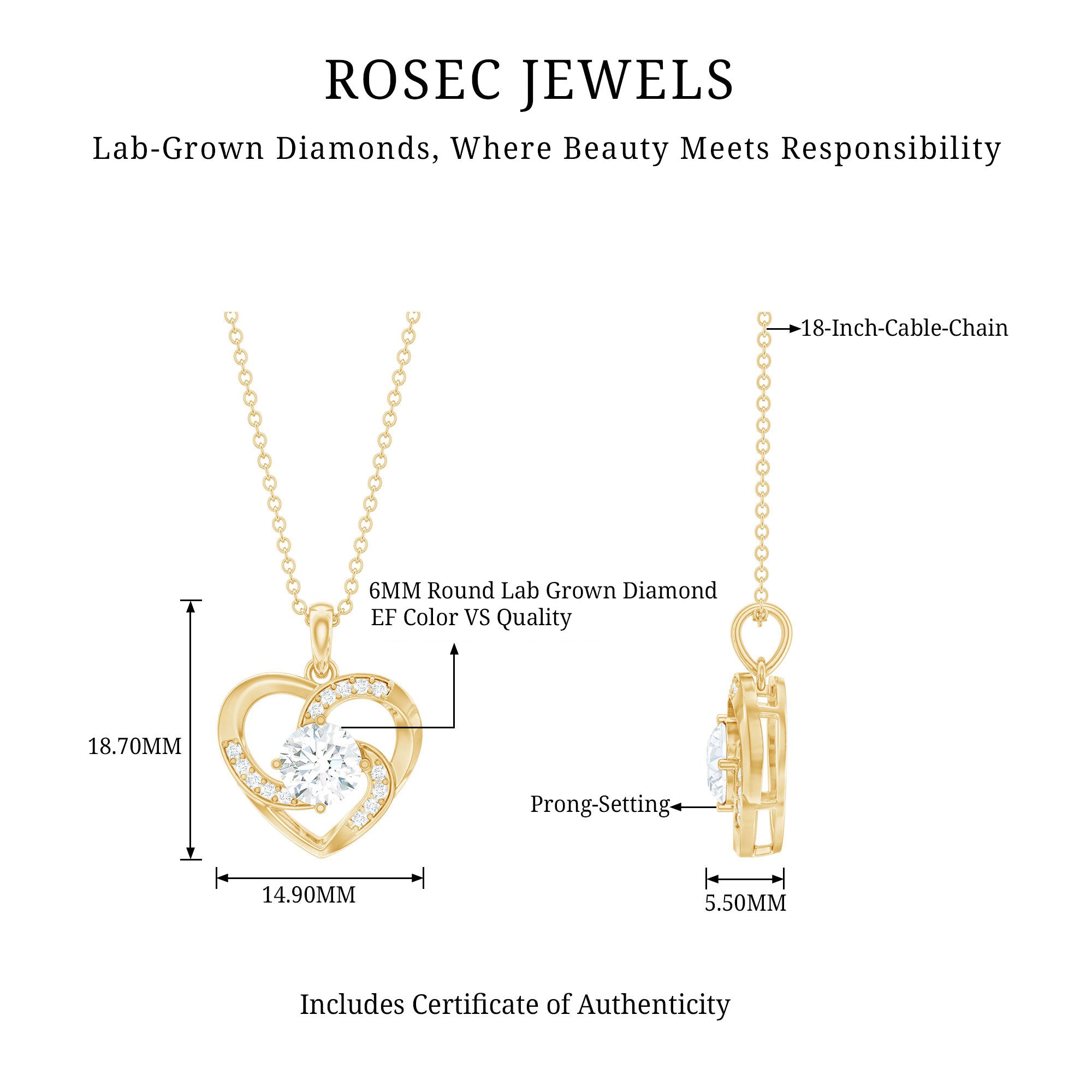 Surprise her with elegance embodied in this unique Lab Grown Diamond Necklace. This Heart Pendant features a 6 MM Round Shape Diamond (Lab Grown) as a centerpiece set in a prong setting, the open heart shape is accentuated by delicate gemstones. This EF-VS quality Diamond Heart Necklace reflects timeless beauty while aligning with Rosec Jewels commitment to environmental responsibility. It comes packaged in a premium storage box, making it ideal for gifting on special occasions like anniversaries, birthdays, Mothers Day, or Valentines Day. A gift as unique and radiant as your loved one.