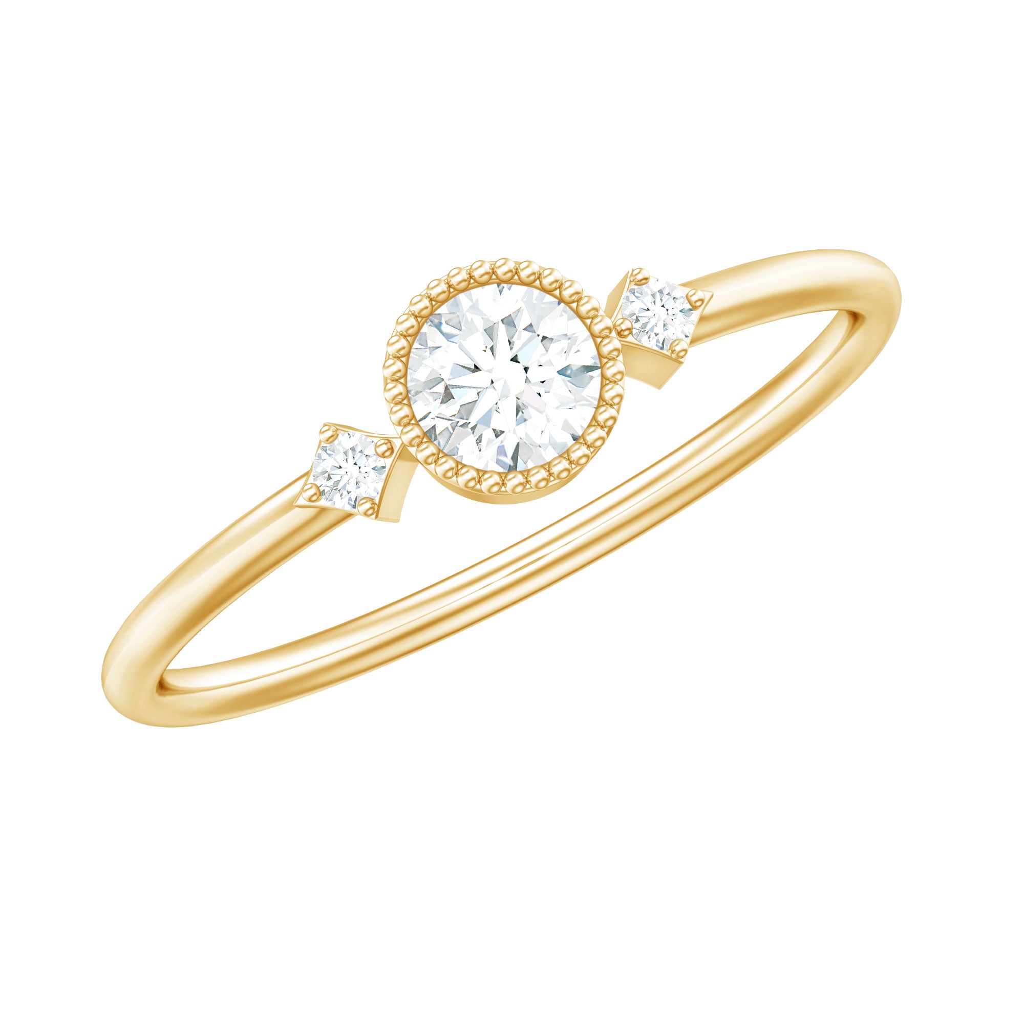 Your partner will be mesmerized by this stunning Diamond Promise Ring, designed by Rosec Jewels. This gorgeous Minimalist Ring features a 4 MM round diamond (lab grown) in the center with a small stone on each side. The focal EF-VS Quality Diamond is set in a secure bezel setting and framed with bead work detailing, adding a touch of texture. The simple yet stunning design makes this Diamond Ring for Women a versatile choice, whether as a declaration of love or a promise of forever, this Solitaire Ring is a timeless treasure meant to be cherished for a lifetime.