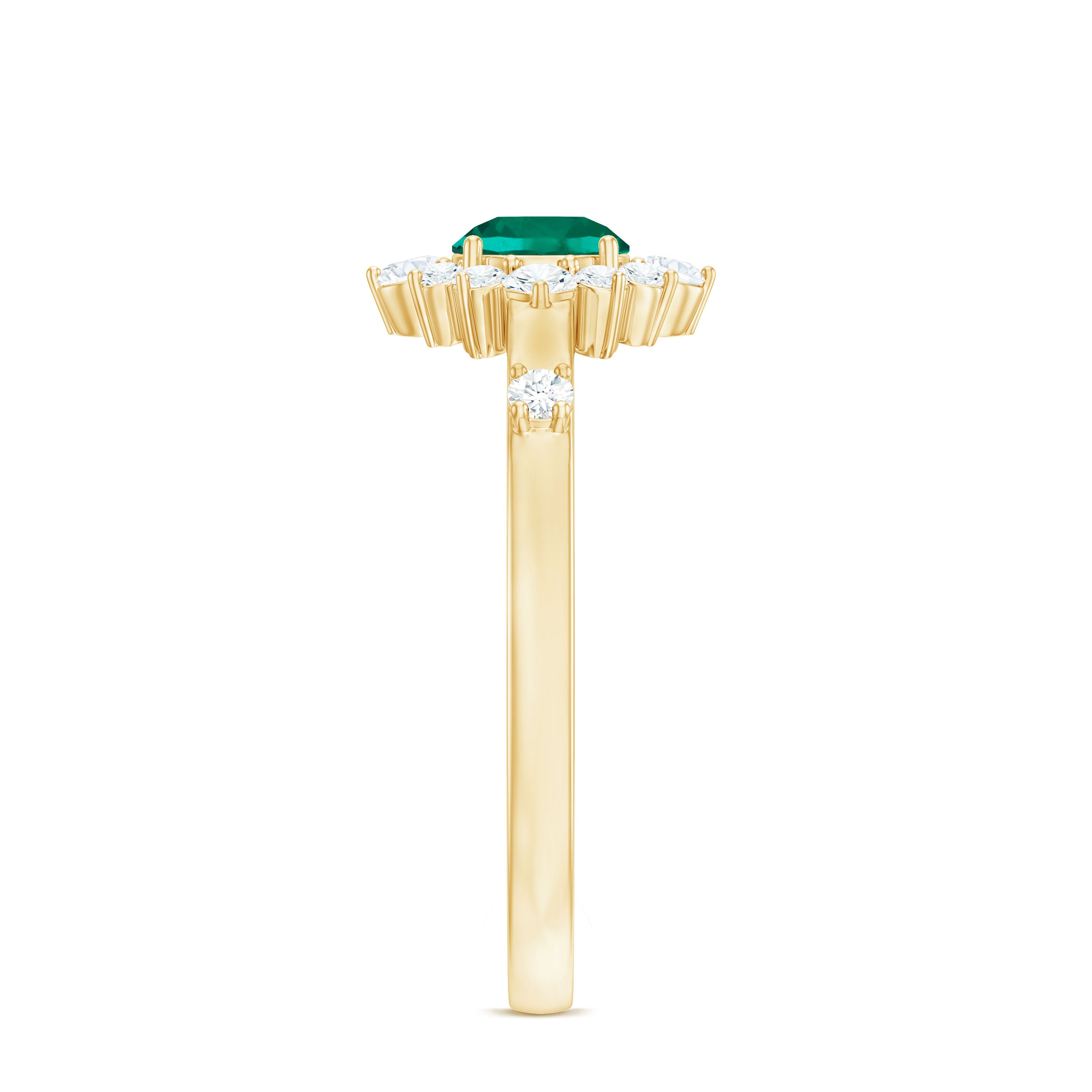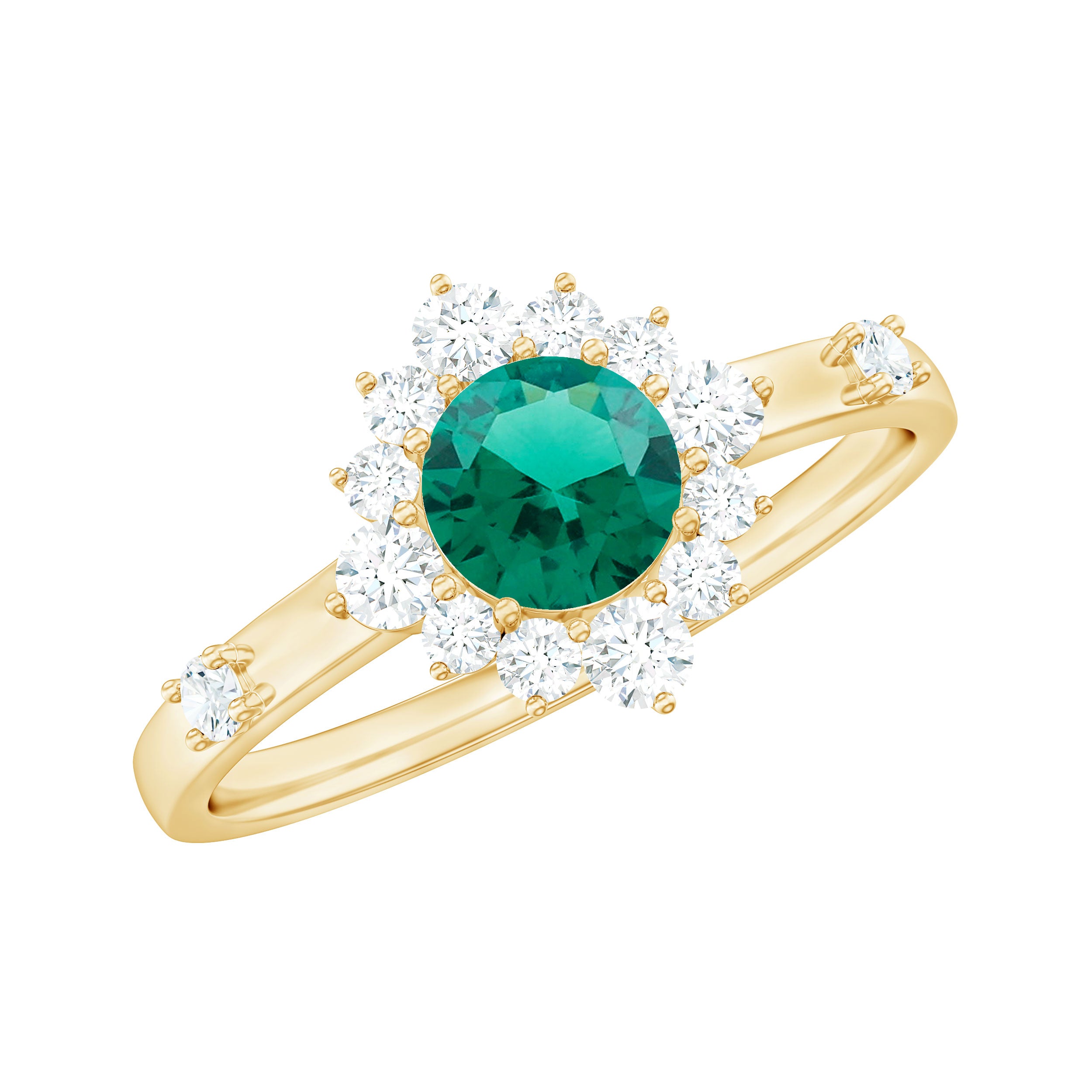 Timeless elegance meets fresh design in this Classic Engagement Ring with a twist. At its center is a 6 mm Round Shape Lab Created Emerald set in Prong Setting, rich in color, full of life and sustainably created for the modern appeal. Framed by a sparkling Diamond Halo, this centerpiece glows with effortless charm and sophistication. What sets this Lab Grown Emerald Ring apart is a carefully placed Diamond stone on either side of the Band, set just far enough from the center to create a balanced look. It is a subtle detail that makes a big impact, giving this Halo Engagement Ring with Emerald a graceful, contemporary edge. Perfect for the minimalist who still loves a touch of drama, this Lab Emerald Diamond Engagement Ring delivers all the sparkle without going over the top. Whether you are planning a proposal or marking a special moment, this Timeless Engagement Ring is perfect for the one who values beauty with meaning. Presented in a signature jewelry box, it is ready to be unboxed, adored, and worn every day.