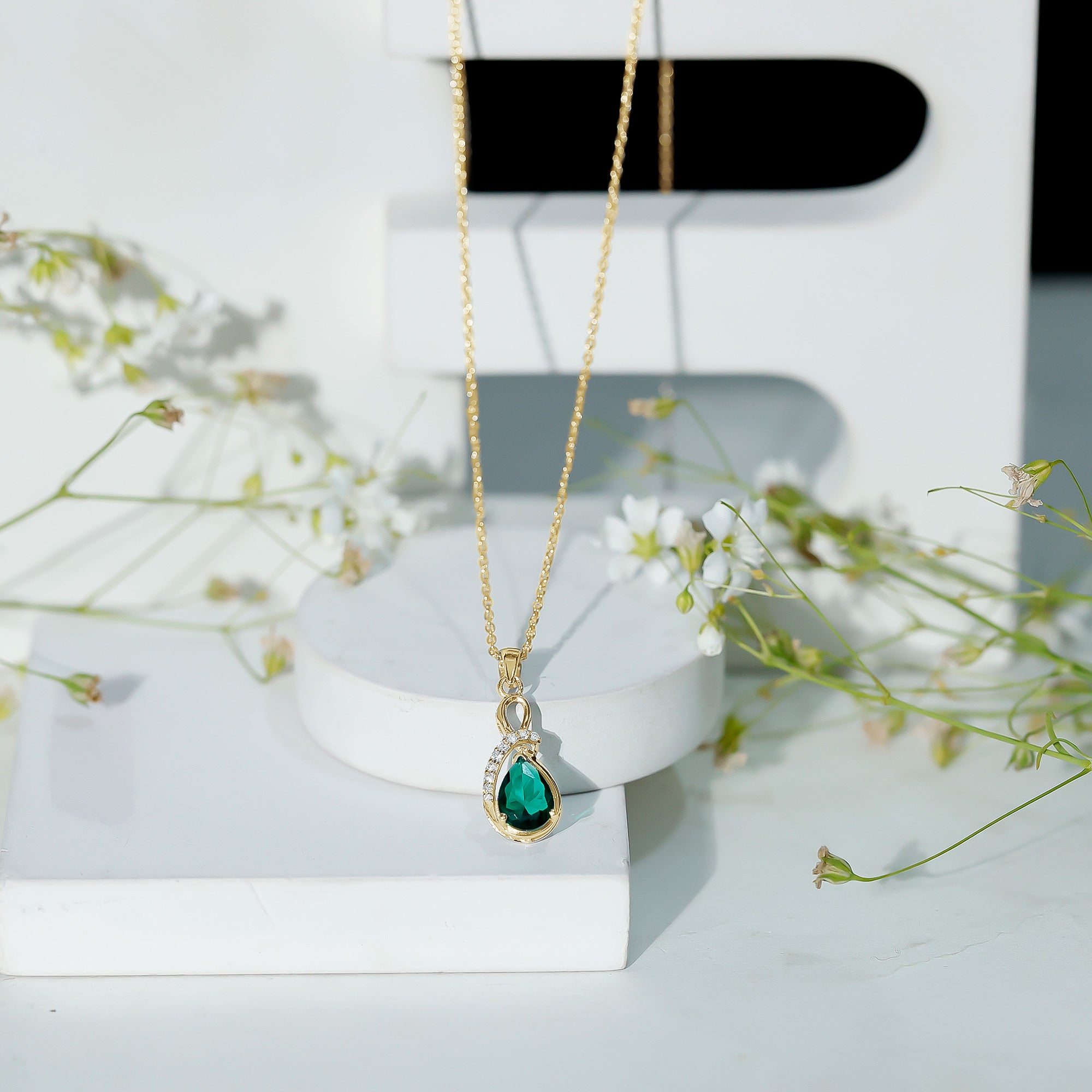 The combination of emerald and diamond elements produces a design that blends color with reflective brilliance, resulting in a refined necklace silhouette.