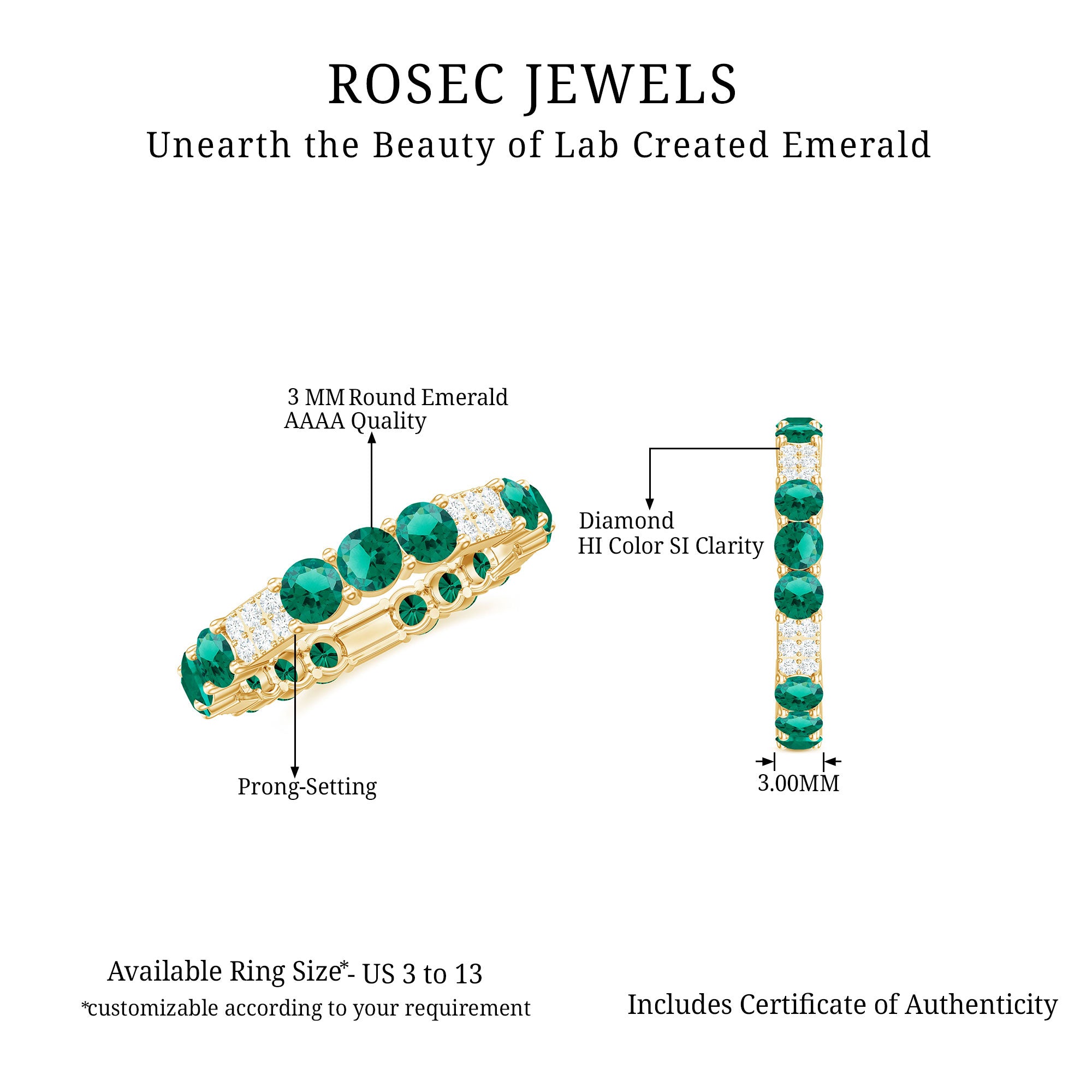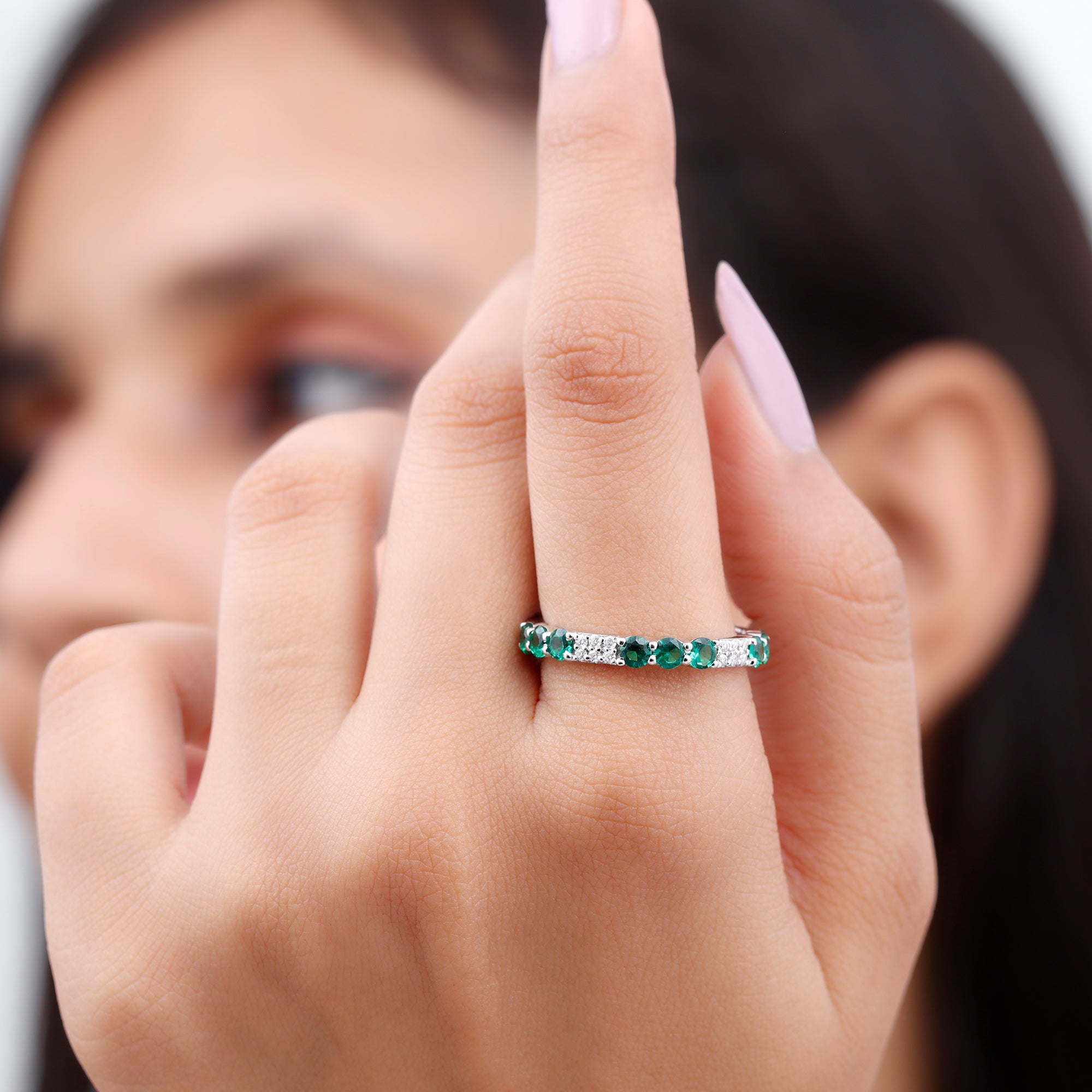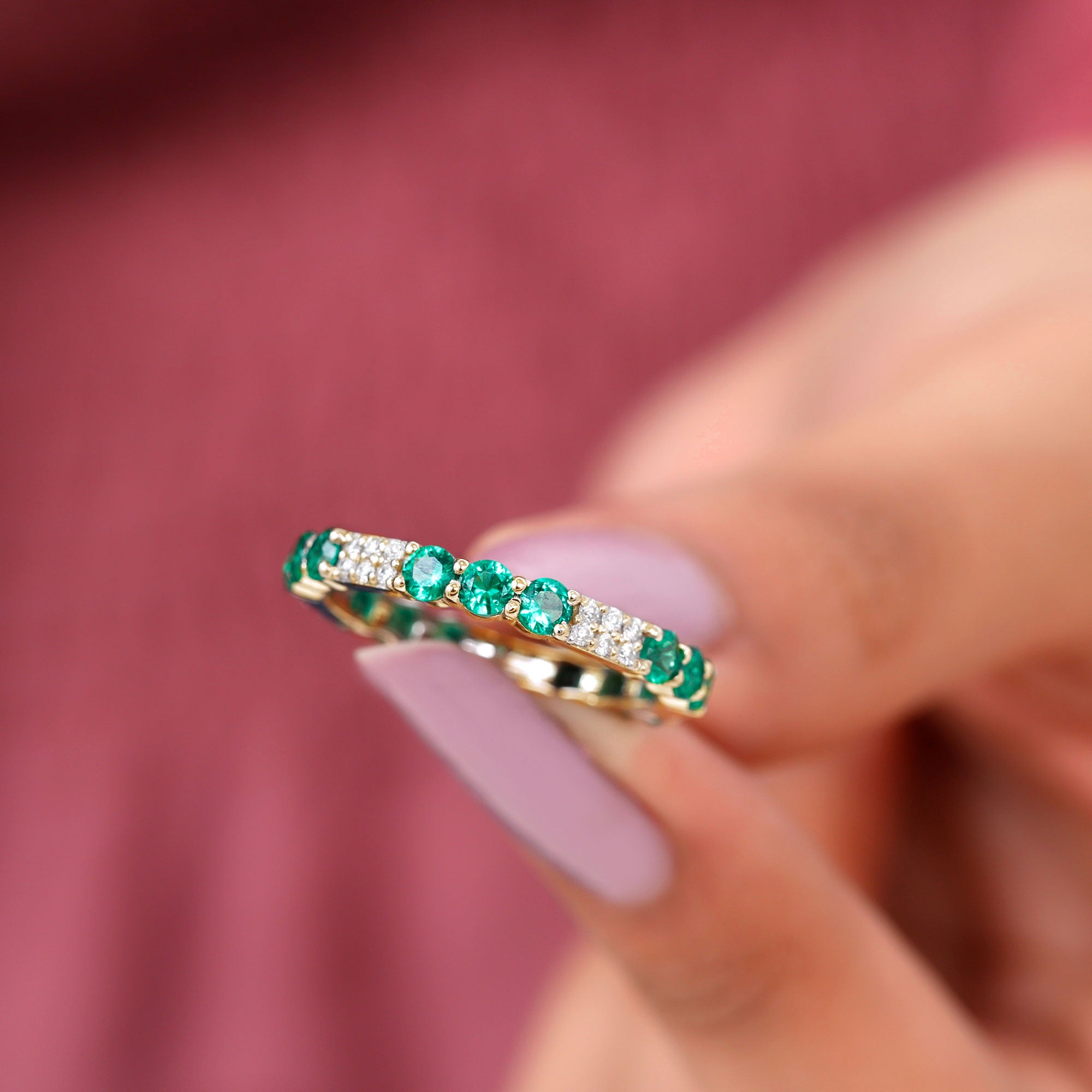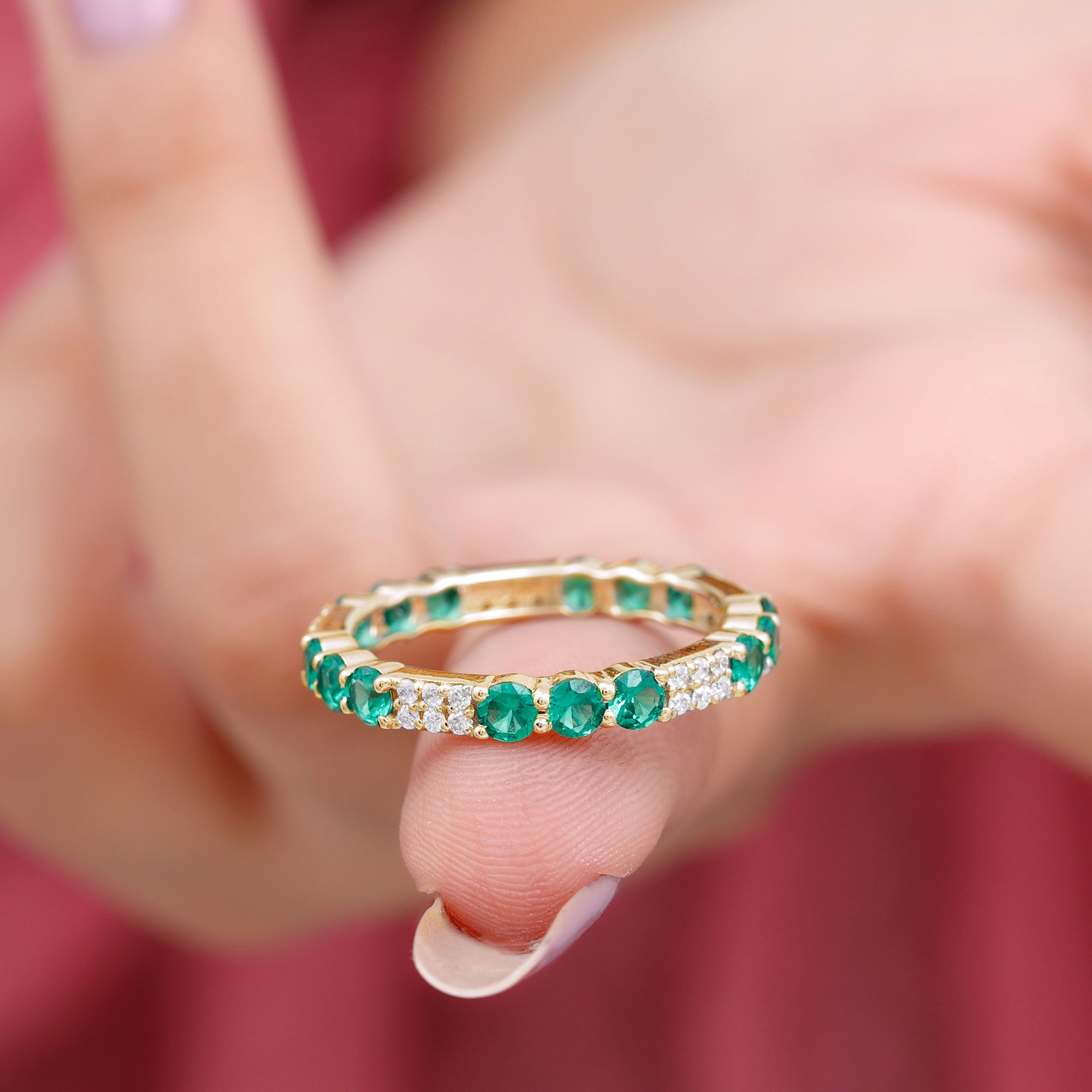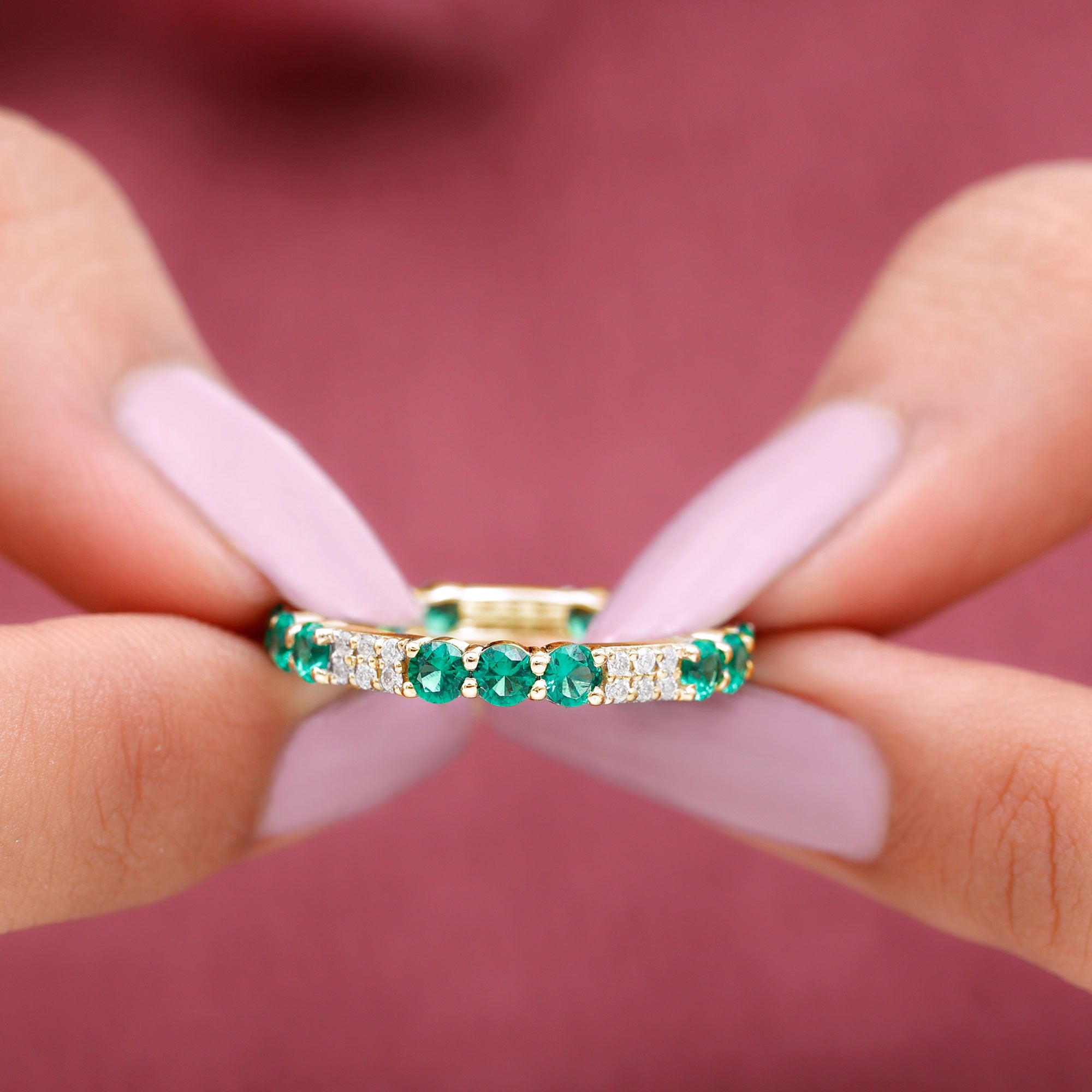 Commemorate your everlasting love with this Eternity Wedding Band, designed to create a perfect contrast of color and sparkle. This elegant Full Eternity Ring is adorned alternating Round Shape AAAA Quality Lab Created Emerald and HI-SI Diamond stones, set in a continuous pattern around the ring. The rich green of the Lab Emerald beautifully complements the bright Diamond, creating a striking balance between color and light that catches attention from every angle. Handcrafted with care and attention to detail, this Lab Grown Emerald Ring is a symbol of infinite love and commitment. Available in various ring sizes, this Lab Emerald Eternity Band is ideal for everyday wear, symbolizing unbroken and eternal affection. Whether worn alone or paired with an engagement ring, this Lab Emerald Diamond Ring adds a graceful and meaningful touch to any jewelry collection. Packaged in an elegant jewelry box, this Emerald Wedding Band is perfect for celebrating special moments of life.