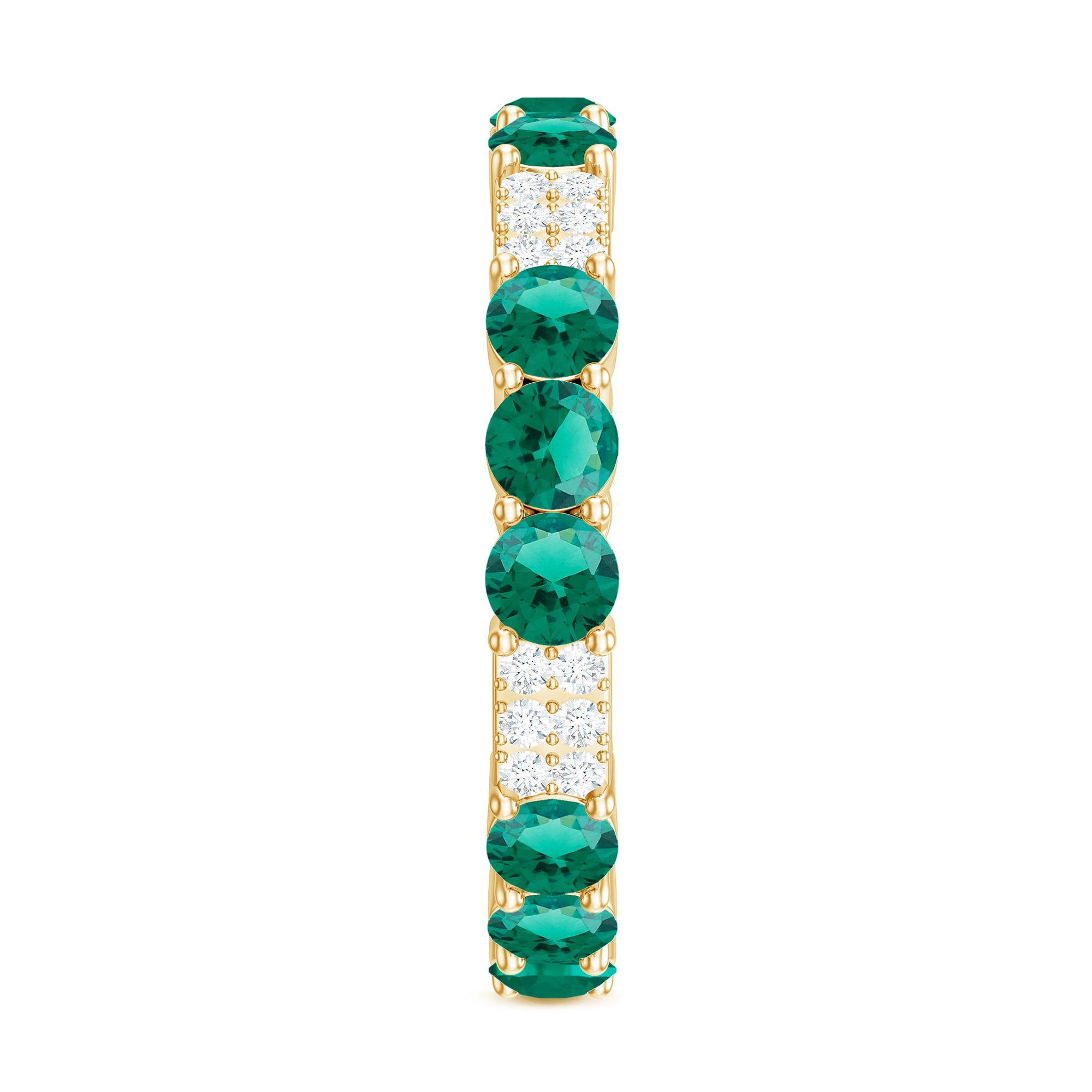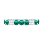This wedding band features alternating lab grown emeralds and diamonds arranged in a continuous eternity design. The combination of vivid green gemstones and bright diamond accents creates a balanced band that highlights both color and brilliance.