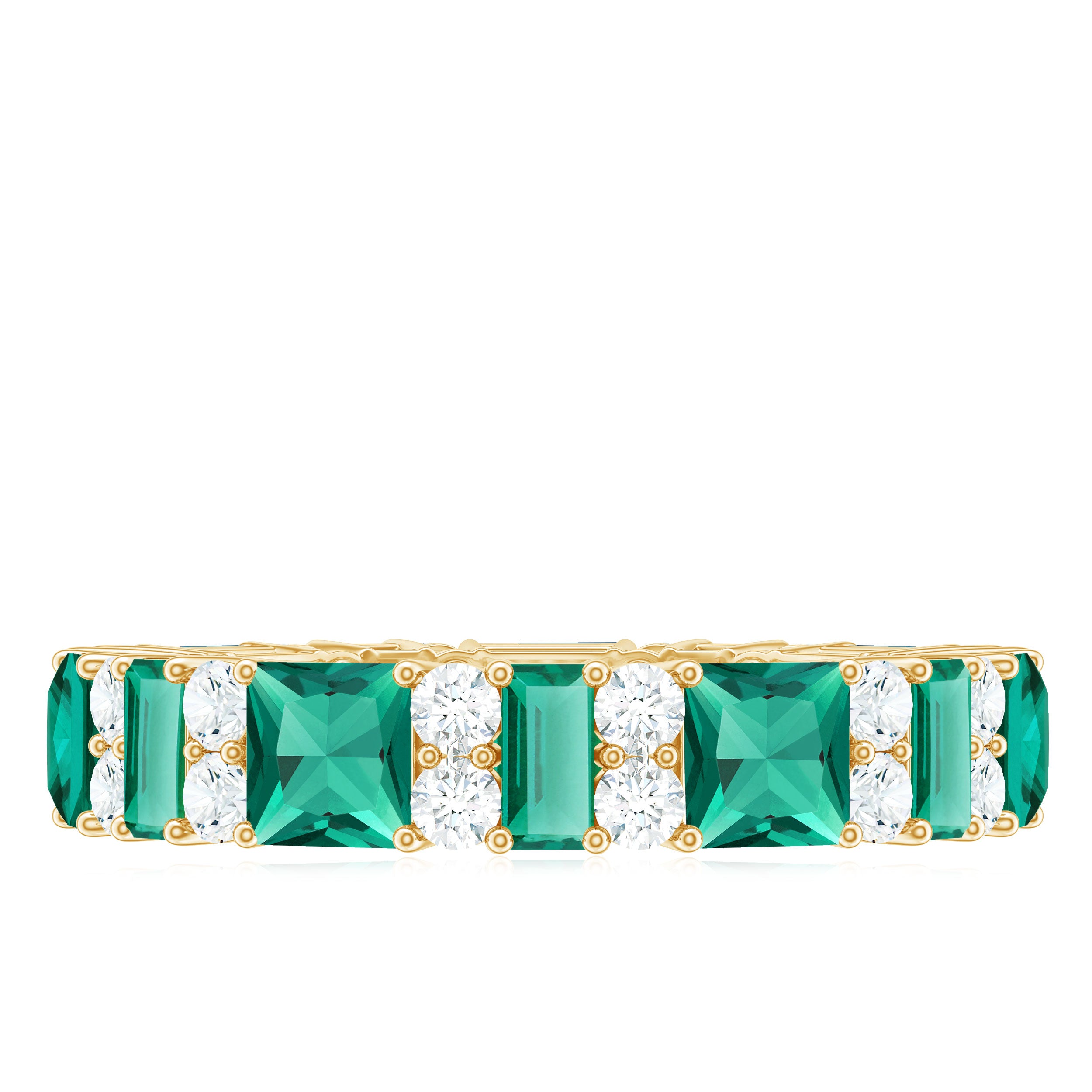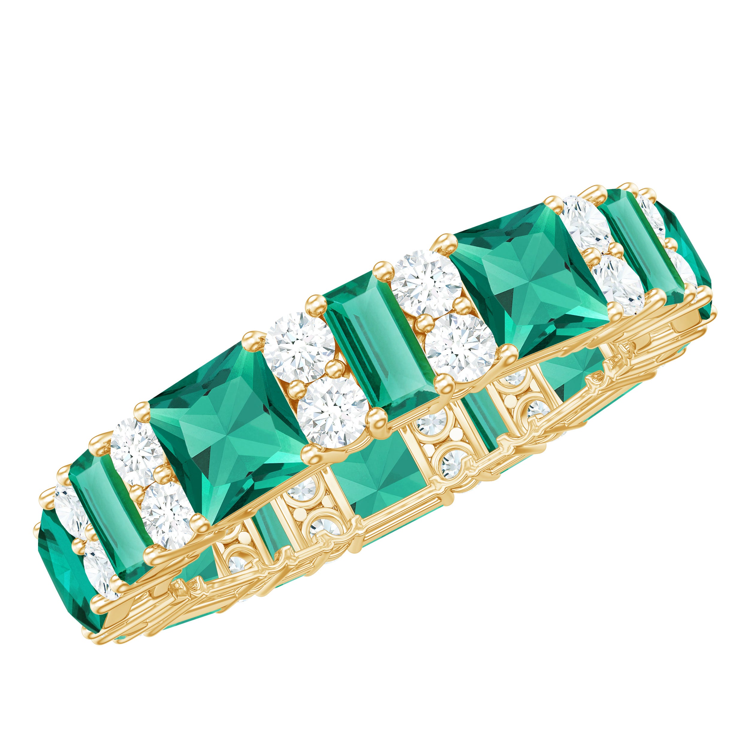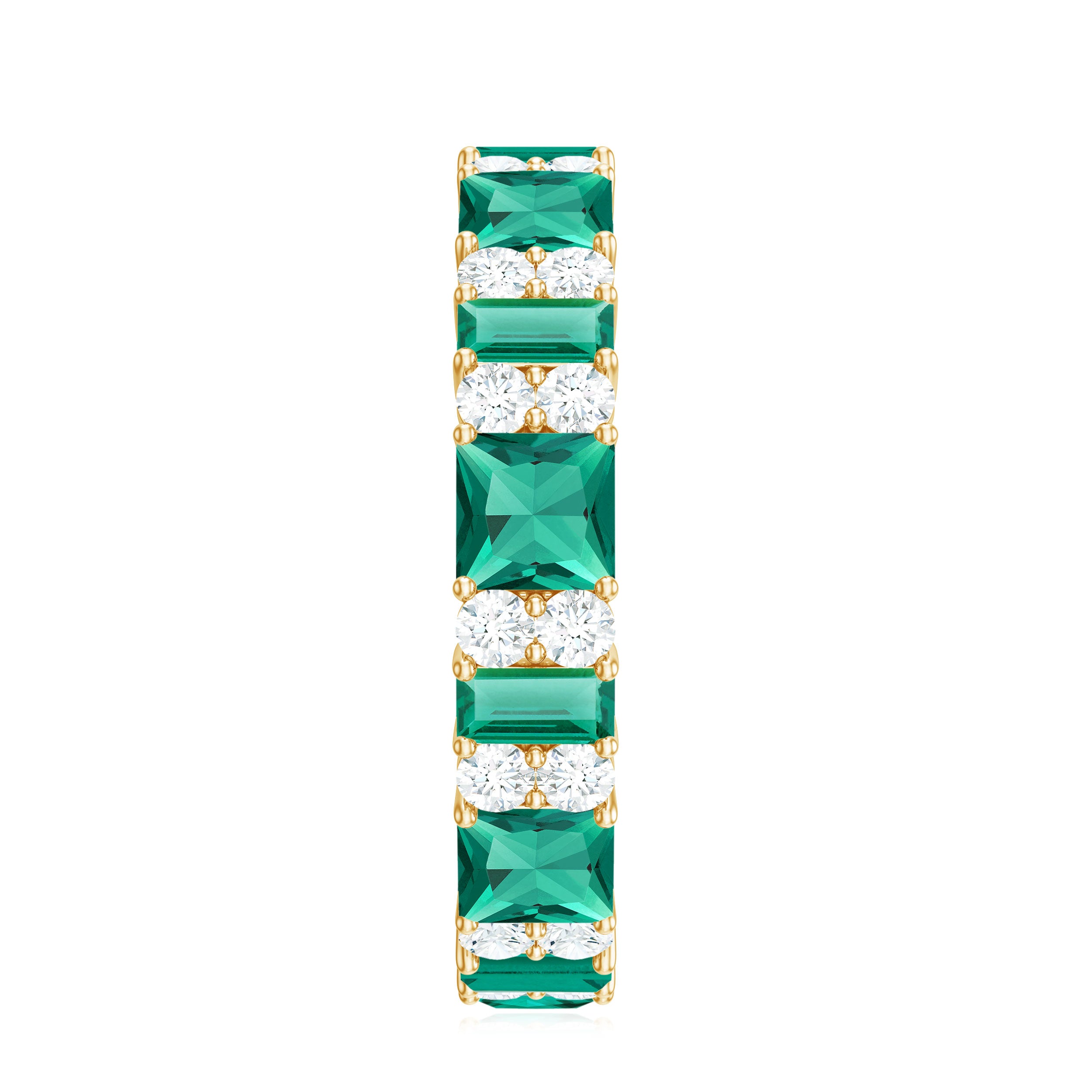 Step into a world of refined elegance with this Eternity Wedding Band, a distinctive celebration of love, craftsmanship and sustainability. This Full Eternity Ring is a masterful arrangement of AAAA Quality Lab Created Emerald stones in alternating Baguette and Princess Cut shapes, creating a rhythm of geometric precision and vivid green allure. Each Lab Emerald radiates a lush, deep color, perfectly paired with sparkling HI-SI Diamond that punctuates the design with shimmering light. The continuous line of gemstones around the band symbolizes an unbroken circle of commitment, making this Lab Emerald Wedding Band an exceptional choice for weddings, anniversaries or personal milestones. Whether worn alone for a statement of individuality or stacked for layered elegance, this Lab Emerald Diamond Eternity Band is designed to be as versatile as it is timeless. Presented in a luxury jewelry box and available in multiple US standard sizes, the Lab Emerald Diamond Wedding Band redefines sophistication for the modern couple.