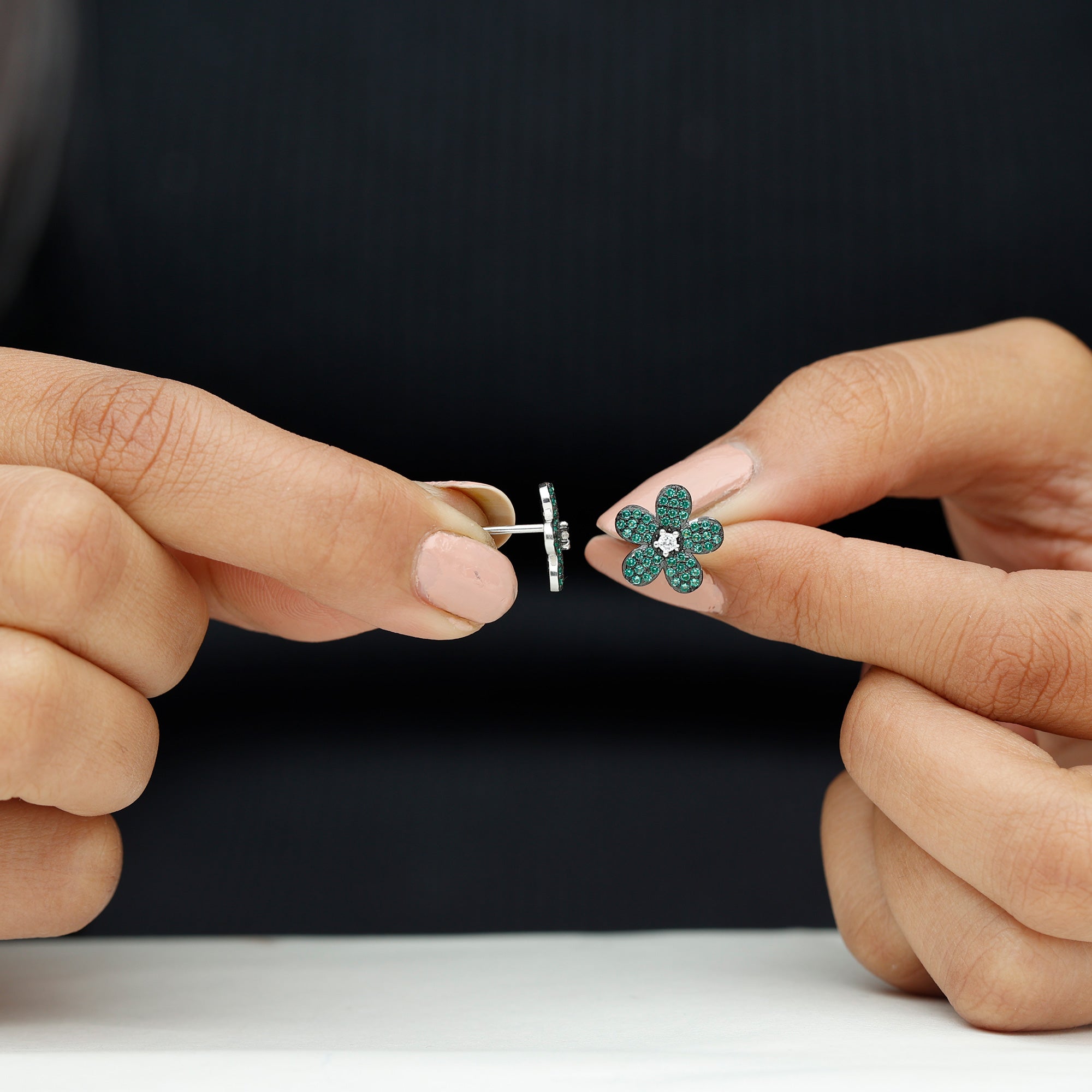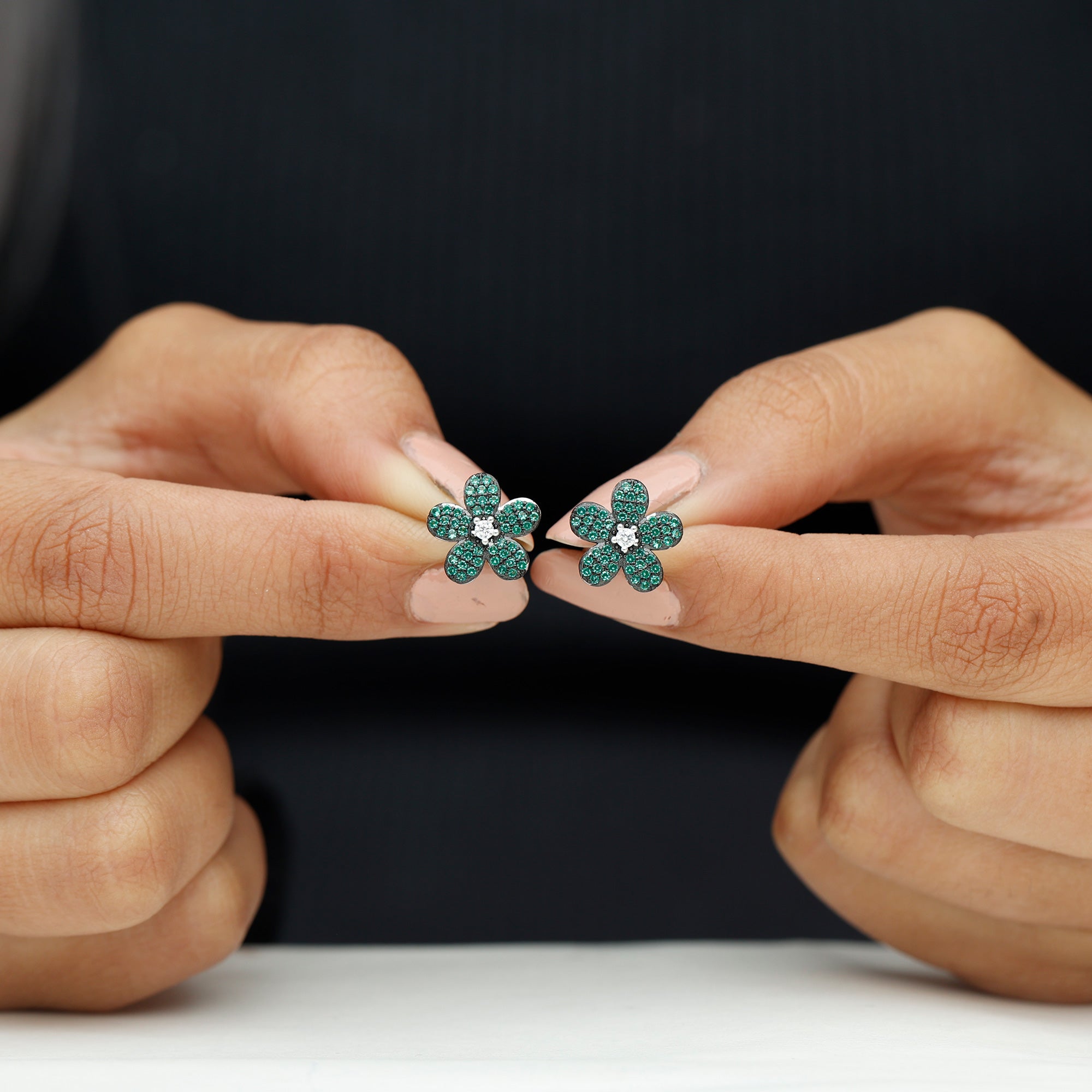 Certified Lab Grown Emerald Flower Earrings with Screw Back