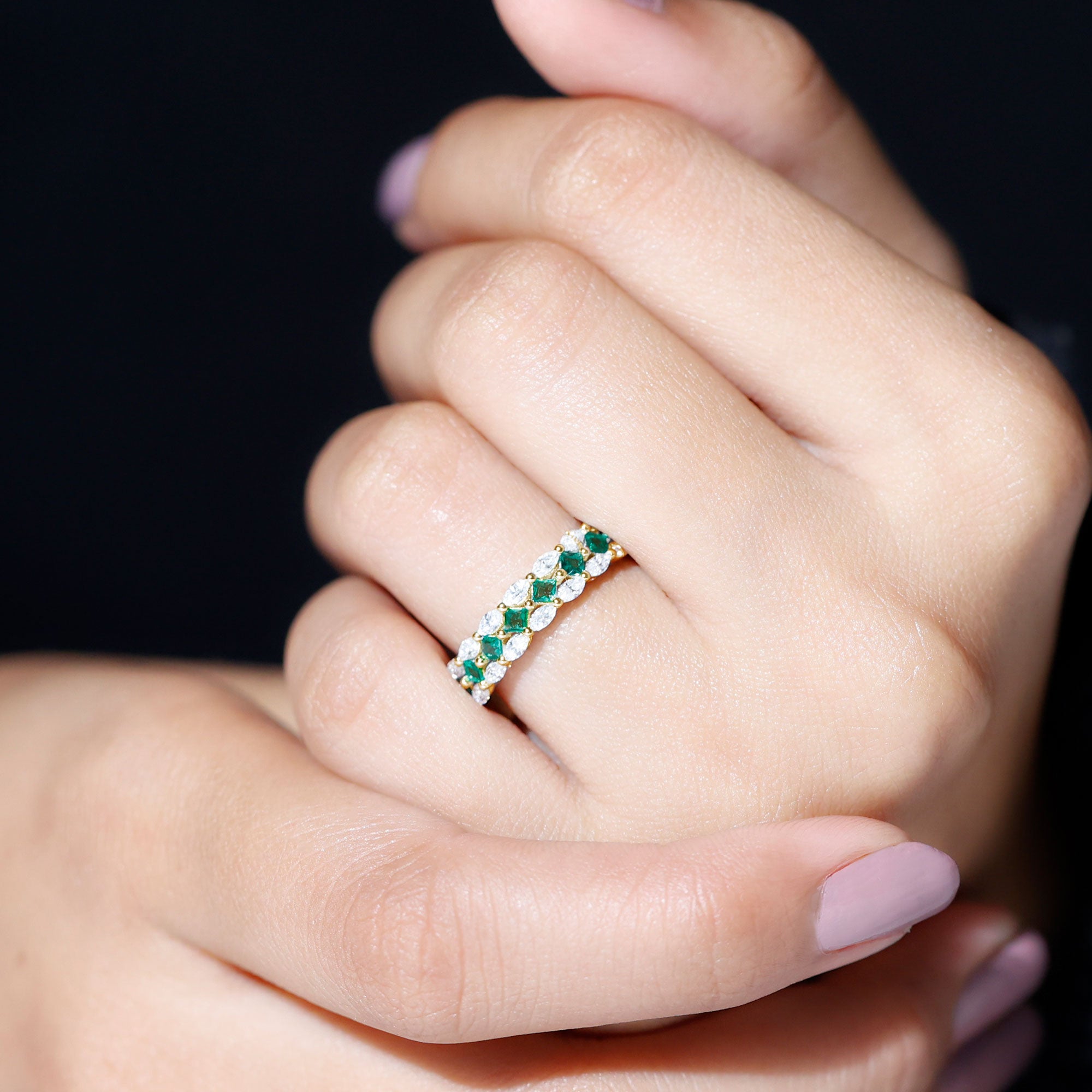 Captivate hearts on your special day with the stunning Half Eternity Wedding Band, a perfect blend of elegance, meaning, and brilliance. The design features a beautiful center row of 3 mm Princess Cut Lab Created Emerald stones, set diagonally in Prong Setting to create a unique and eye-catching pattern. On either side of the Lab Emerald row, Marquise Shape Moissanite stones are placed horizontally, adding extra sparkle and a touch of sophistication. The combination of Lab Grown Emerald and Moissanite creates a stunning contrast of color and light, making the Half Eternity Band stand out with graceful charm. Available in various ring sizes from 3 to 13, this Lab Grown Emerald Ring is designed to fit comfortably and complement your engagement ring perfectly or stand beautifully on its own. This Princess Cut Emerald Ring comes elegantly packaged in a jewelry box, ready to be gifted as a treasured keepsake. Whether exchanged on your wedding day or given as a symbol of everlasting love, this Emerald Wedding Band will surely be the perfect choice for her, a radiant reminder of your shared journey and the promise of forever.
