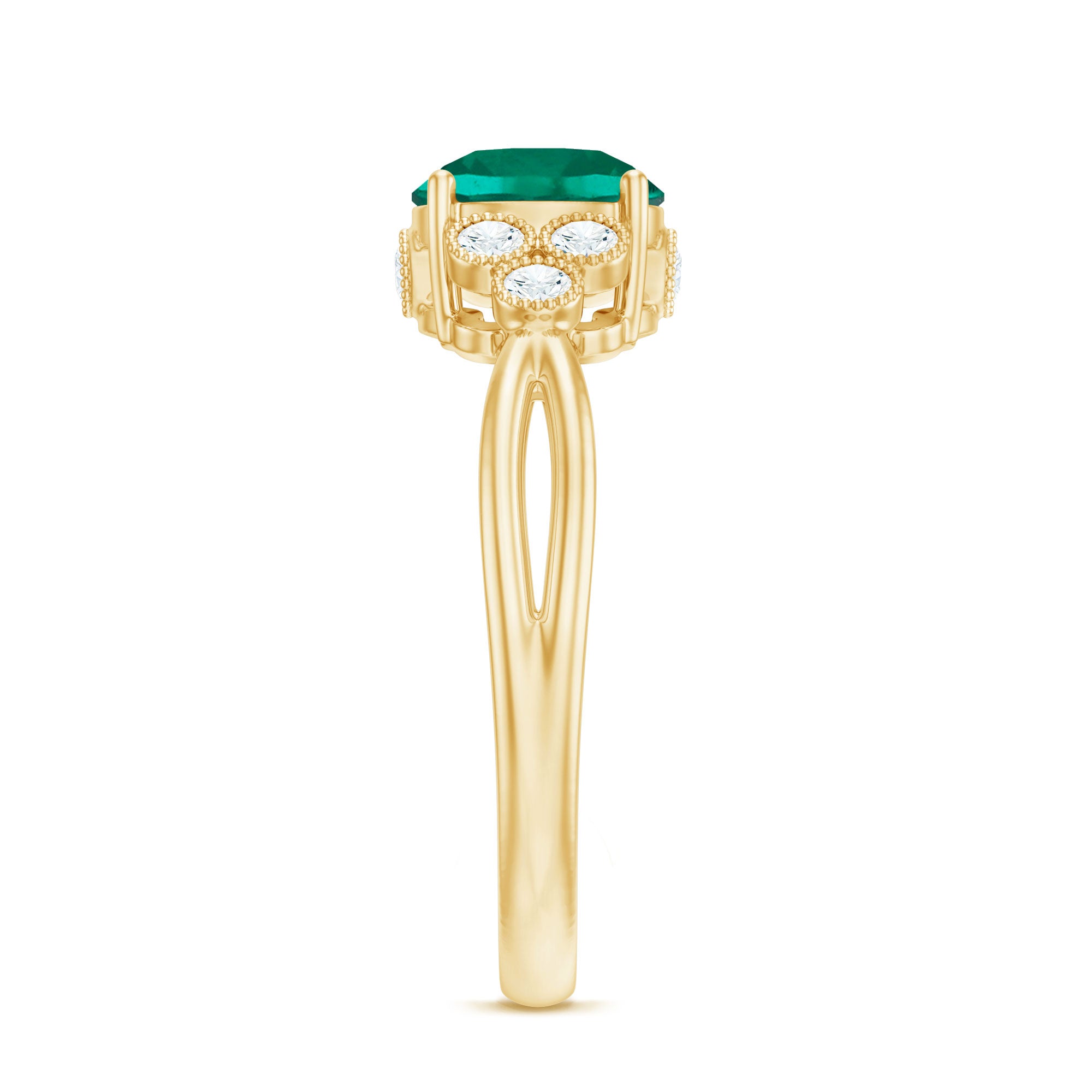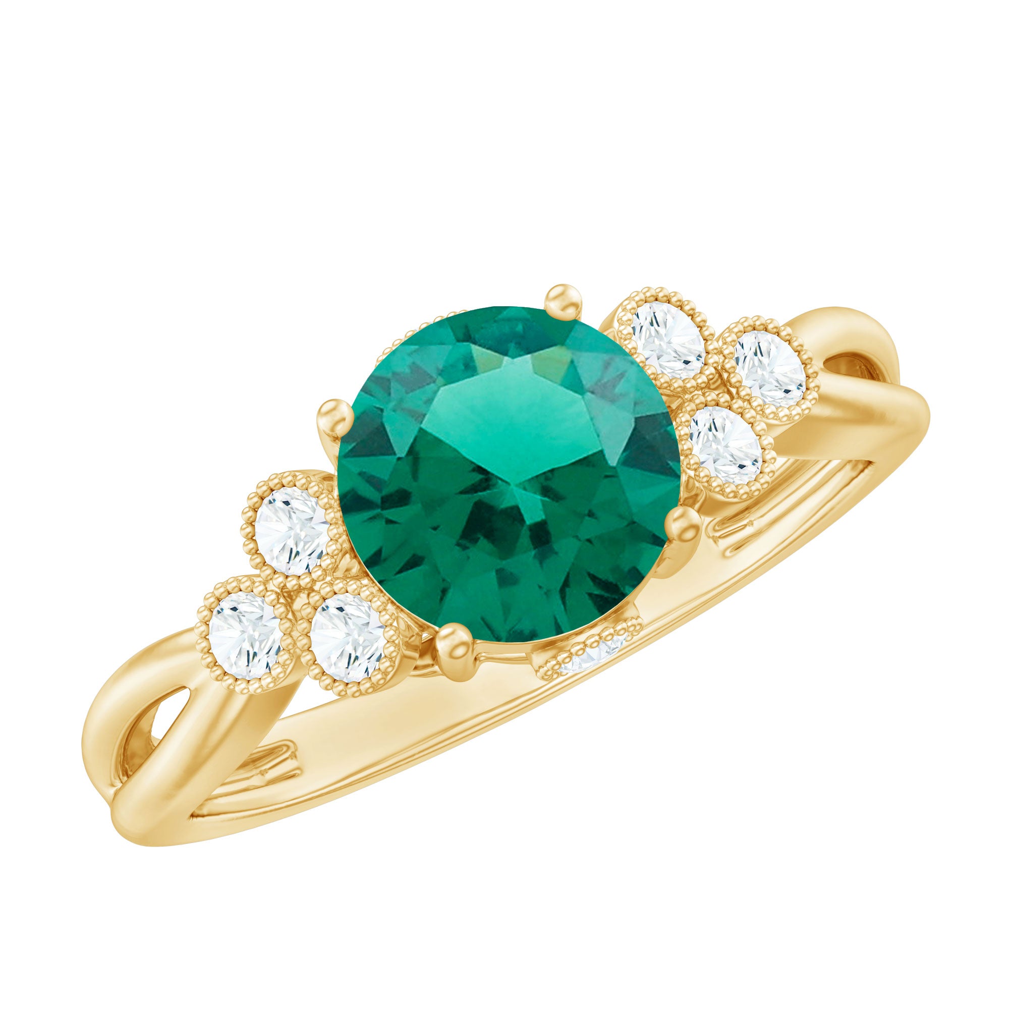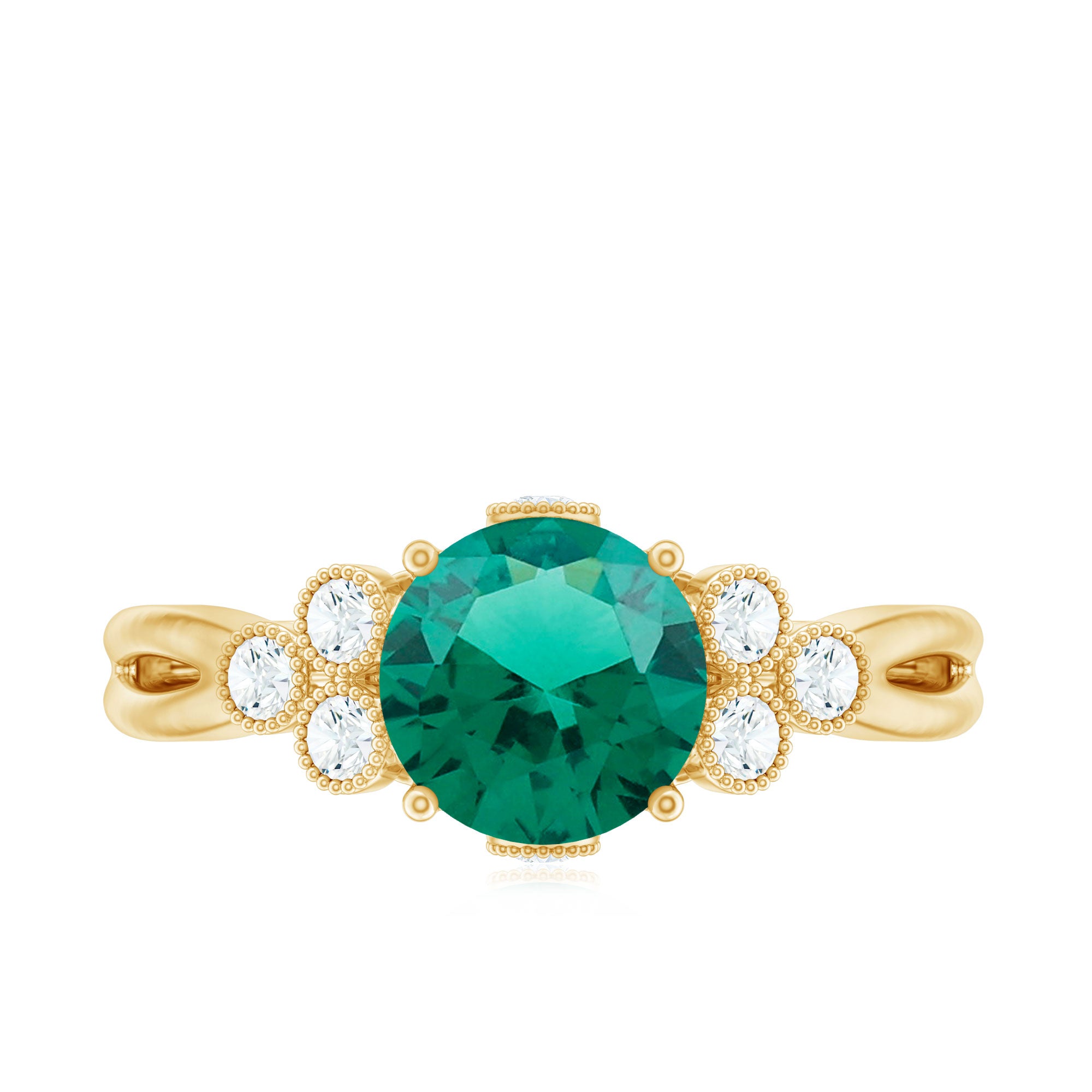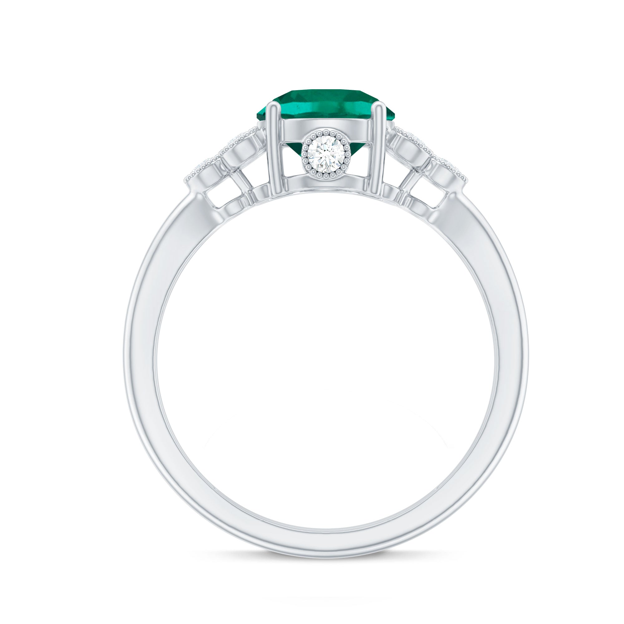 Dazzle up your love story with this Designer Engagement Ring showcasing a 8 mm Round Shape Lab Created Emerald that takes center stage, complemented by a Trio of Lab Grown Diamond gemstones in the Emerald Diamond Ring set on either side with Beaded Embellishment. Elevate your commitment with a symbol as timeless as your love that sparkle with Aaaa Quality Emerald and Ef-Vs Quality Diamonds. Trust Rosec Jewels for unparalleled craftsmanship and ethical sourcing, making every moment sparkle with this Classic Ring.