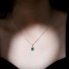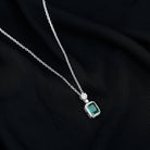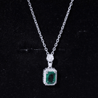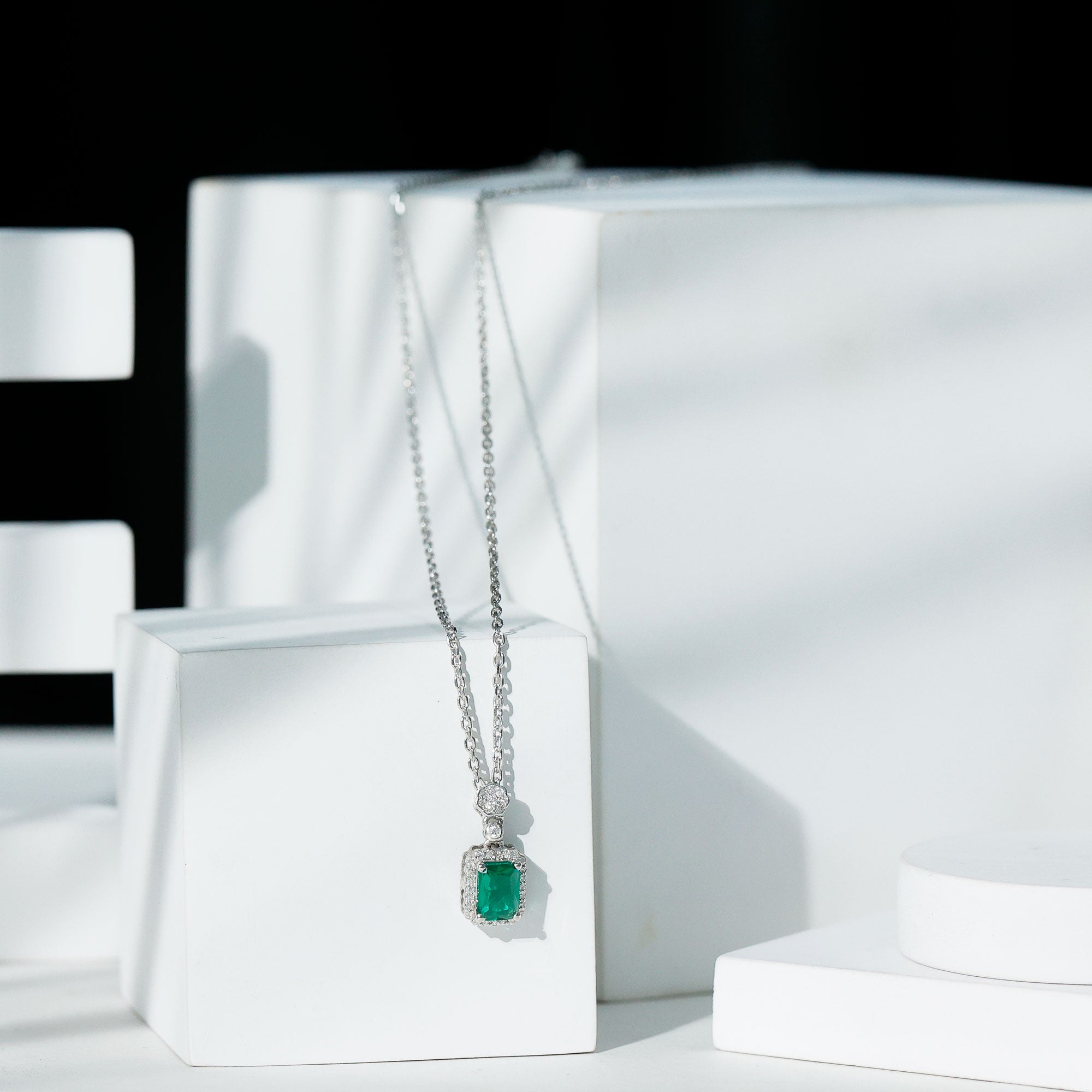 This gorgeous Lab Grown Emerald Necklace showcases a stunning blend of color, shine, and vintage appeal that exudes classic elegance. When you wear this bold and beautiful Emerald Cut Necklace, you will look fantastic with any outfit. It is embellished with a 6X8 MM emerald cut lab grown emerald set in prongs, dangling from a bezel set round cut moissanite that sparkles above and more stones surround the hanging gem in a halo. A flower of brilliant cut moissanite stones is set at the top, adding a touch of extra detail to elevate your special day. Expertly crafted from 14K White Gold Plated Silver, this Emerald Wedding Necklace enhances your look with timeless beauty and understated sophistication, making it perfect for special occasions. This Dangling Pendant is just what you need for cocktail parties, helping you shine with its unmatched brilliance. The Vintage Bridal Necklace will come in premium packaging along with a certificate of authenticity.