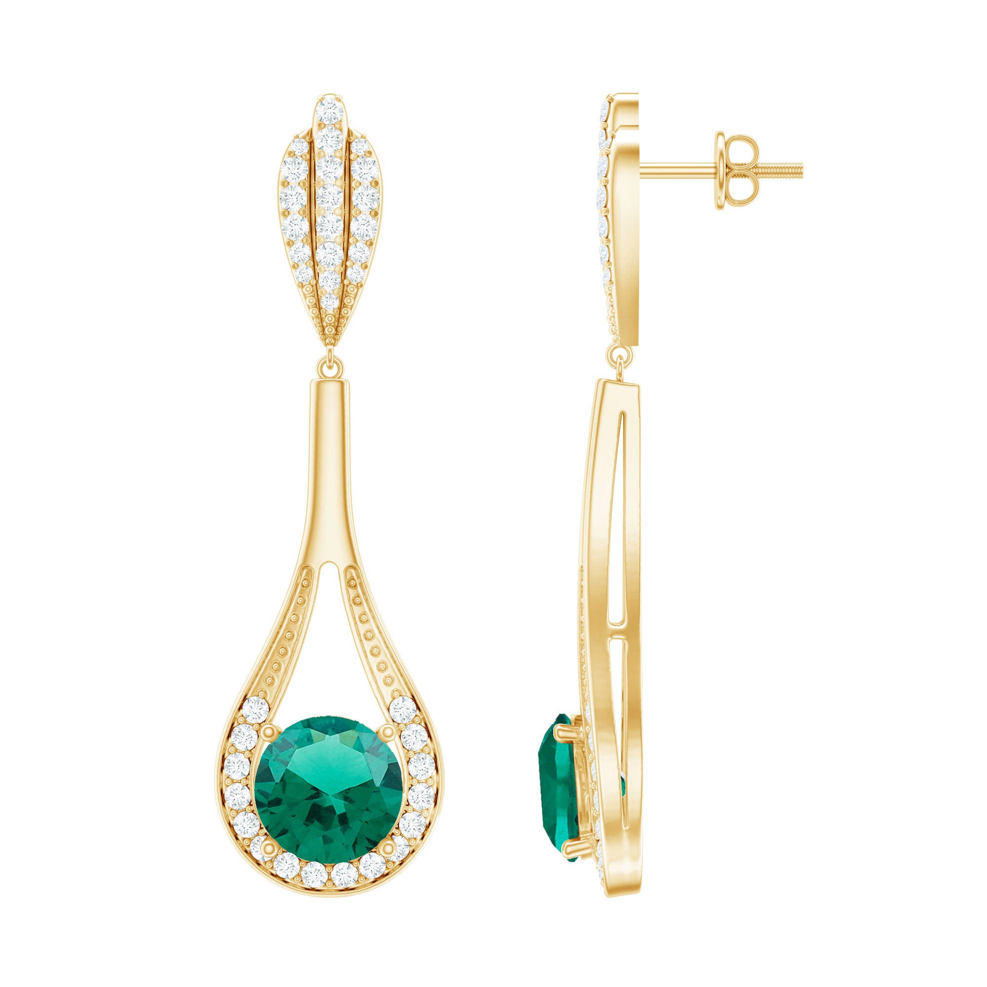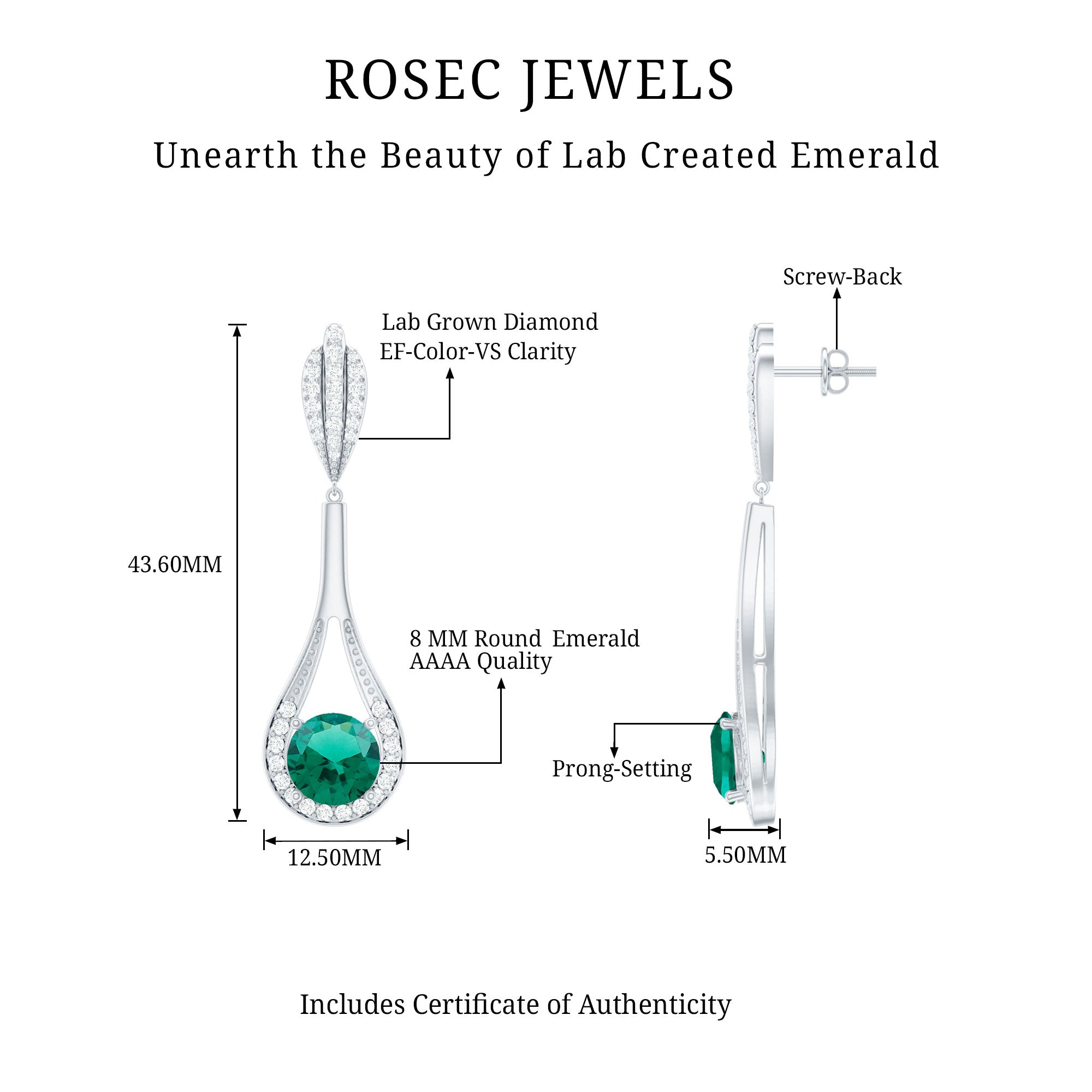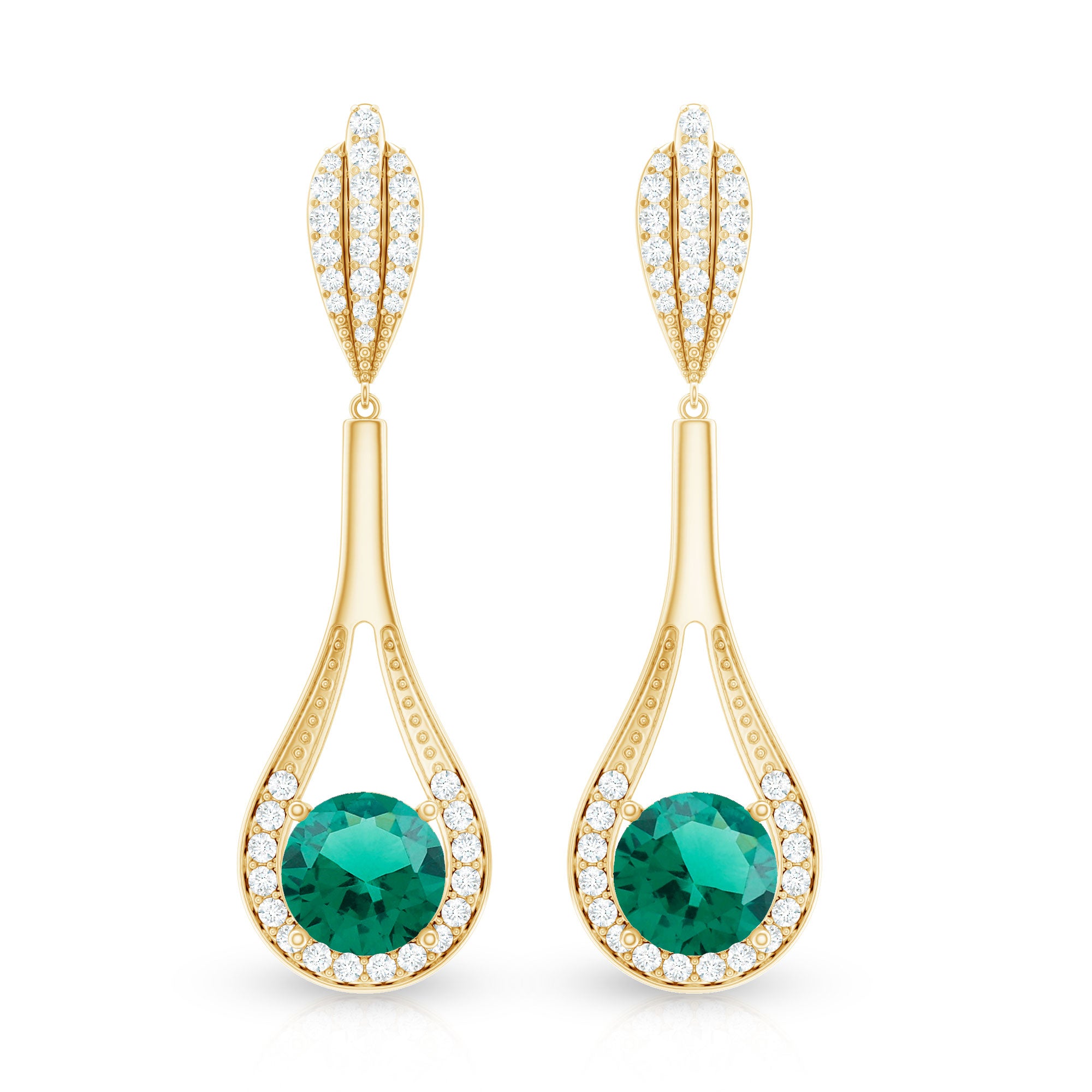 Highlight your elegance with these lab created Emerald and Diamond Earrings. Crafted with perfection and attention to detail, these Teardrop Earrings showcase the mesmerizing allure of 8 mm Round Shape Emerald of Aaaa quality, accentuated by shimmering Lab Grown Diamond gemstones of Ef-Vs quality, capturing the essence of timeless beauty. The Screw Back Closure ensures a secure and comfortable fit, allowing you to shine with confidence. These lab grown Emerald Earrings carries a total 5 carat weight gemstones, whether as a gift for bride to be or a Valentines Day gift for your lady love these Dangle Earrings will sure to capture their heart. Elevate your style with these stunning Emerald Drop Earrings from Rosec Jewels, where craftsmanship meets luxury.