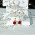 Make a stylish appearance with our Orange Sapphire Drop Earrings and transform your look completely. The 8X10 MM Created Orange Sapphire elegantly hangs down, while the Round Moissanite shimmers at the top to add an extra touch of sparkle to the overall design. Illuminate your look without any hustle as these sapphire earrings are crafted with lever back closures that ensure your comfort and security. Embrace your evening outfits when you wear these dangle earrings and make every moment special with their captivating allure.