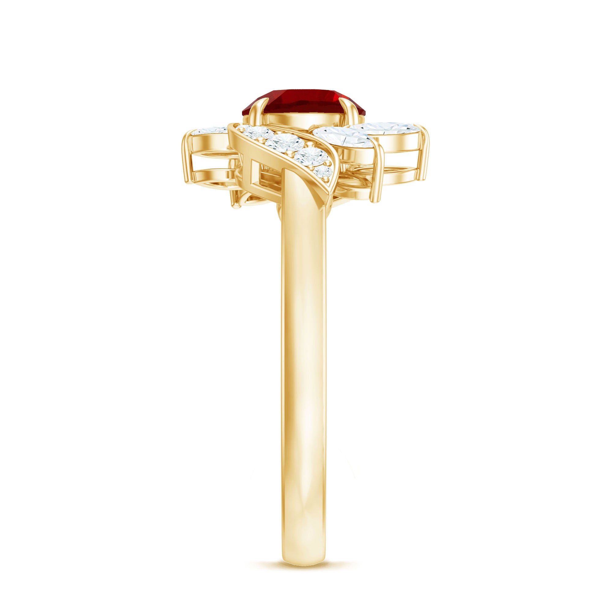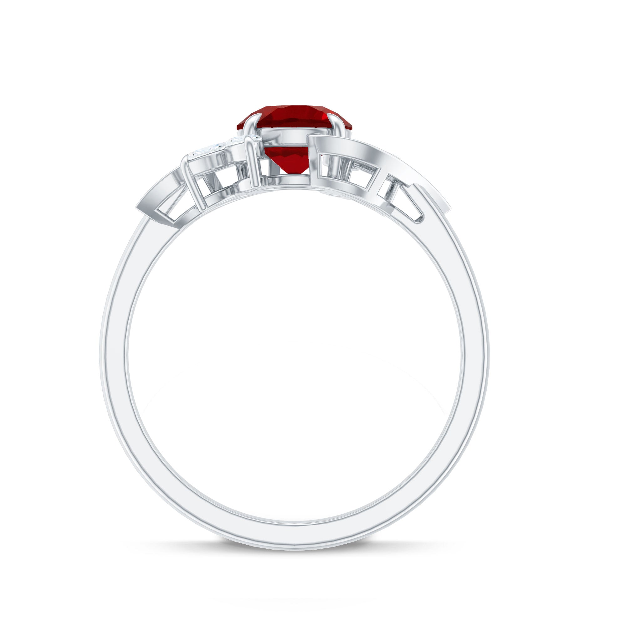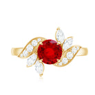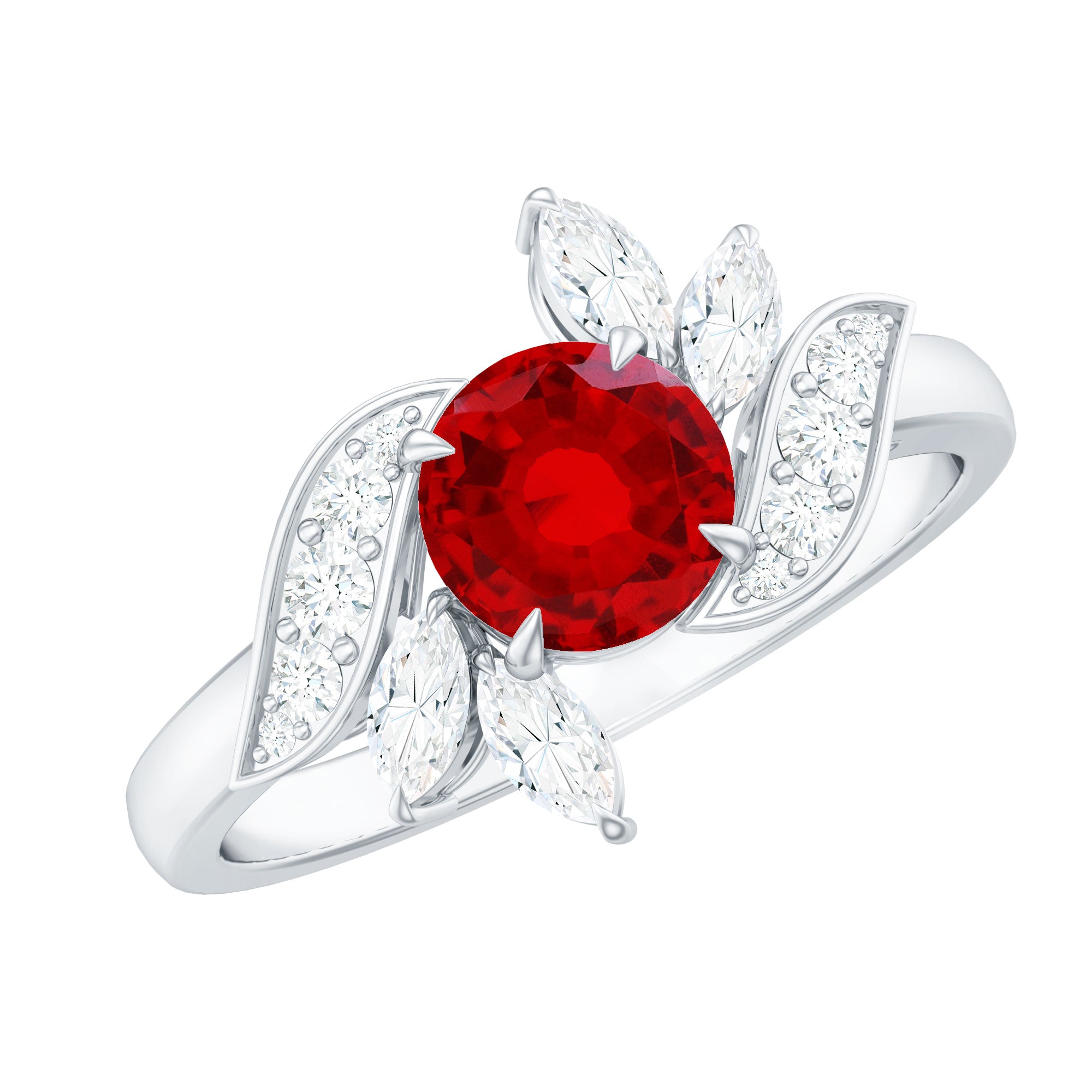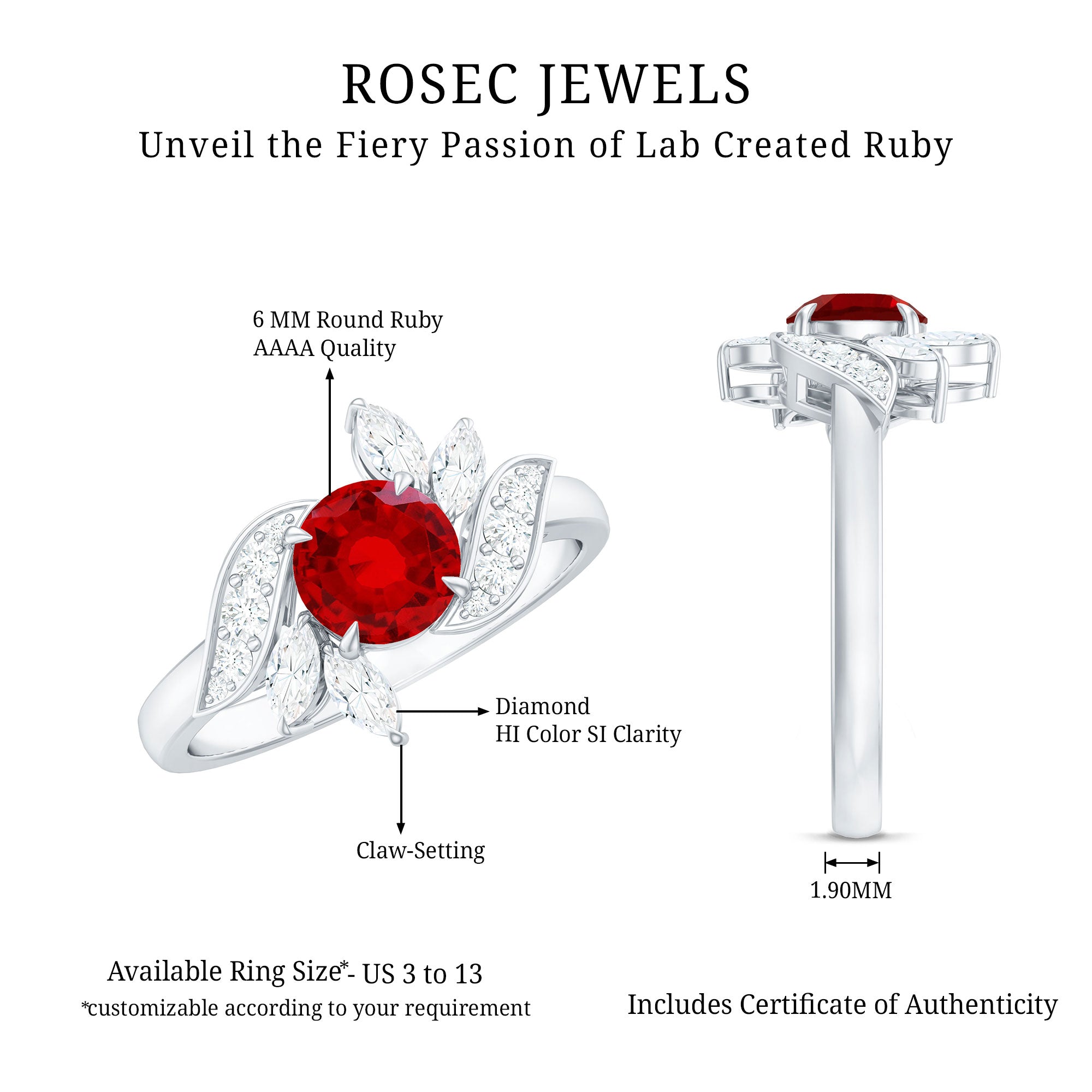 Inspired by the beauty of nature, this Lab Created Ruby Engagement Ring feels truly special and full of meaning. It is embellished with a glowing 6 MM round shaped lab created ruby, set in claw setting that lets its rich red color shine brightly. Surrounding the ruby are delicate leaf-inspired designs that wrap softly around the center stone, each leaf sparkling with small round and marquise shaped diamonds that add a gentle shimmer and bring the whole look to life. This Ruby and Diamond Engagement Ring is the perfect mix of natural beauty and timeless sparkle, made for someone who sees love as a wonderful journey filled with adventure and magic. It is a little whimsical, a little elegant, and totally unique, just like the person who wears it. Whether she is someone who follows her own path or believes in love stories with a special twist, this Floral Engagement Ring fits perfectly. It comes beautifully packed in a lovely jewelry box and is available in different sizes to make sure it fits just right. More than just a piece of jewelry, this Ruby Flower Ring is a symbol of forever, a reminder of the beautiful moments and memories that make your love story one of a kind.