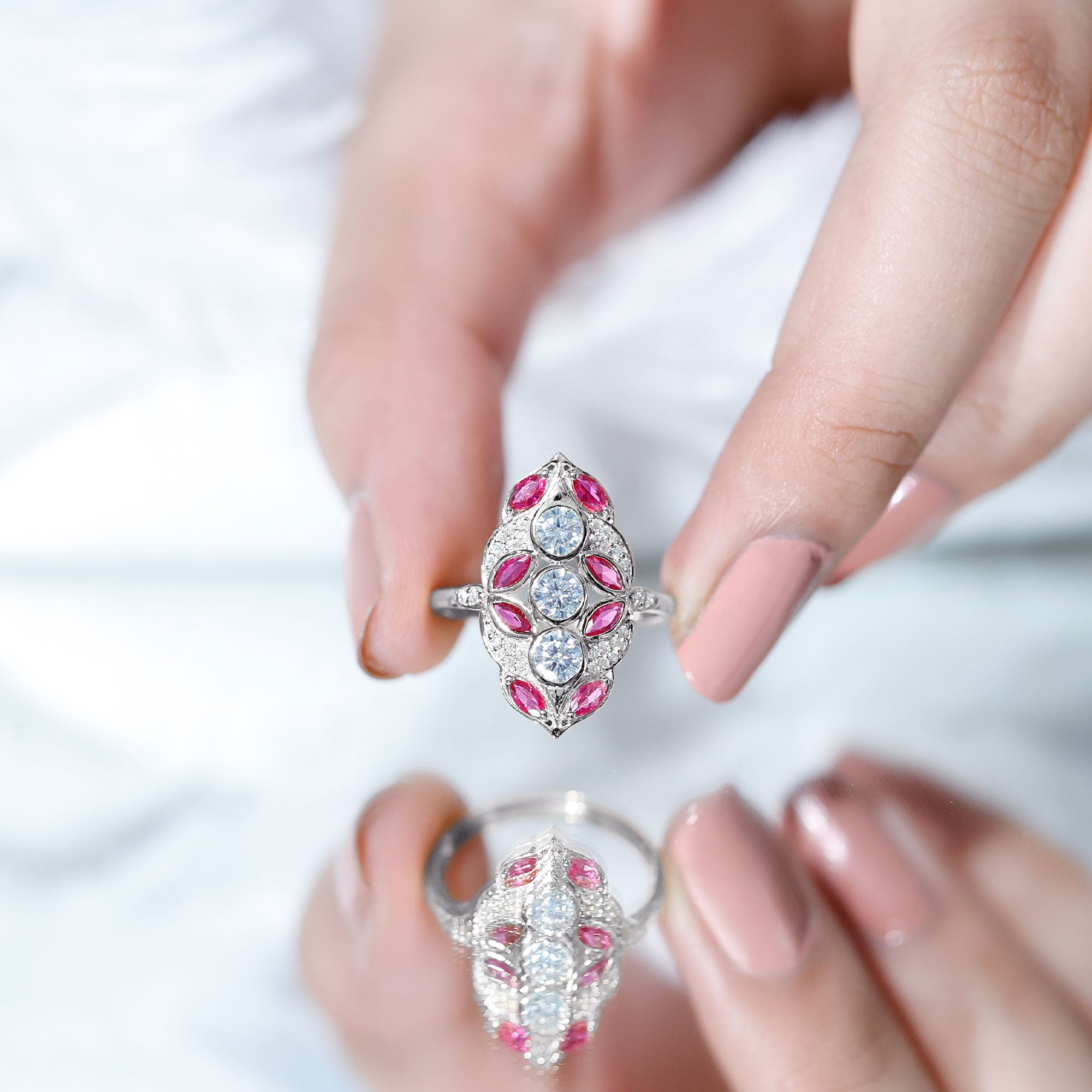 As a dazzling Lab Grown Ruby Ring is a spectacular fusion of modern elegance and vibrant luxury. The striking combination of Lab Grown Ruby and Moissanite creates a striking statement. Its art deco style has a rich red hue of AAAA Quality Lab Grown Ruby and D-VS1 Quality Moissanite symbolizing passion and love. Embraced by an intricate halo of sparkling Moissanite gemstones are renowned for their incredible brilliance and fire, creates a captivating frame that enhances the Rubys radiant beauty. Crafted with precision to detail this Vintage Art Deco Ring makes a bold statement and also reflects a commitment. Its cocktail design adds playful yet sophisticated details making it perfect for the bride who dares to be different and desires a ring as unique as her love story. Celebrate your forever with this exquisite Cocktail Engagement Ring as a striking piece that embodies individuality and timeless romance, destined to be cherished for generations to come.