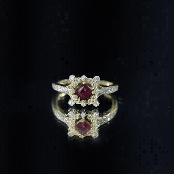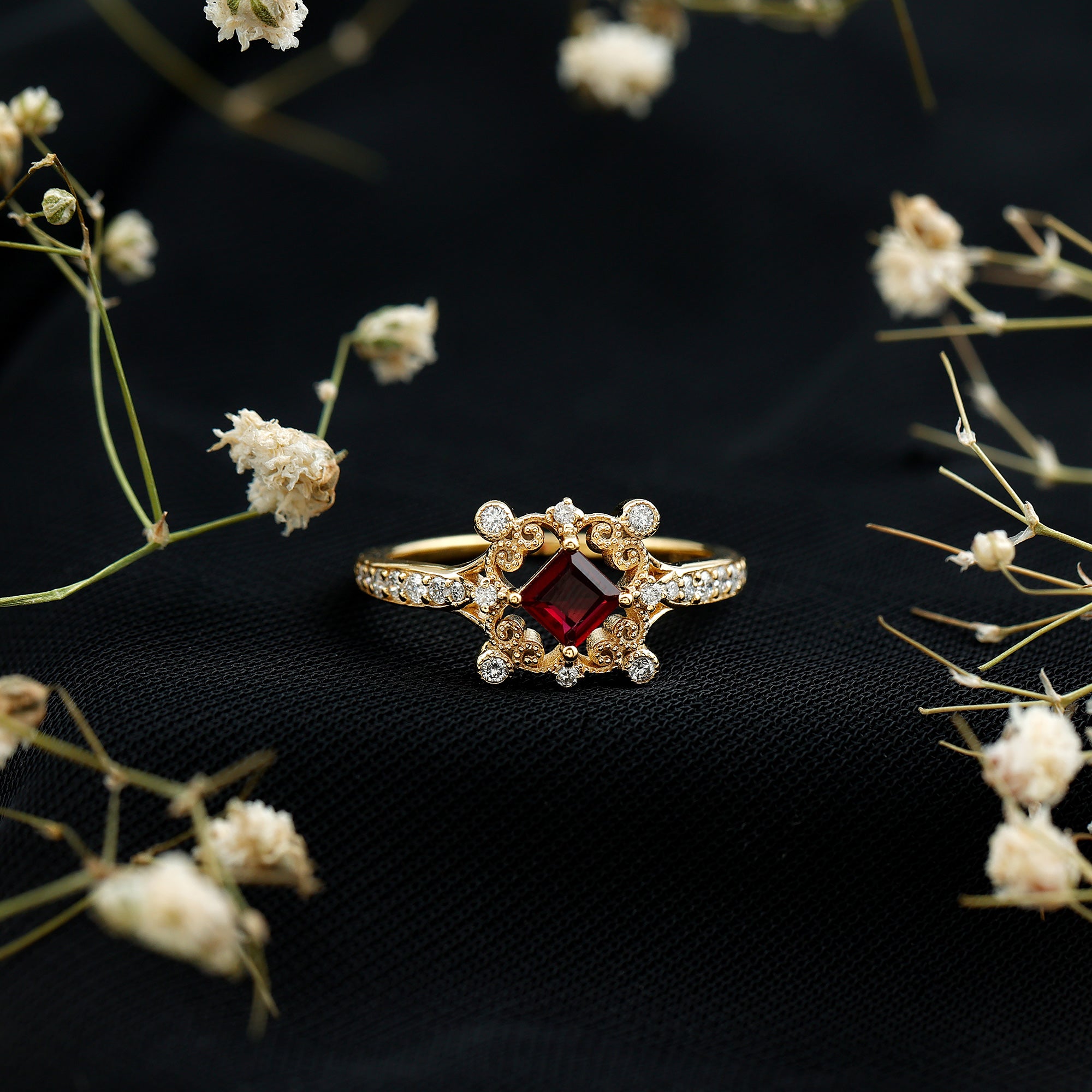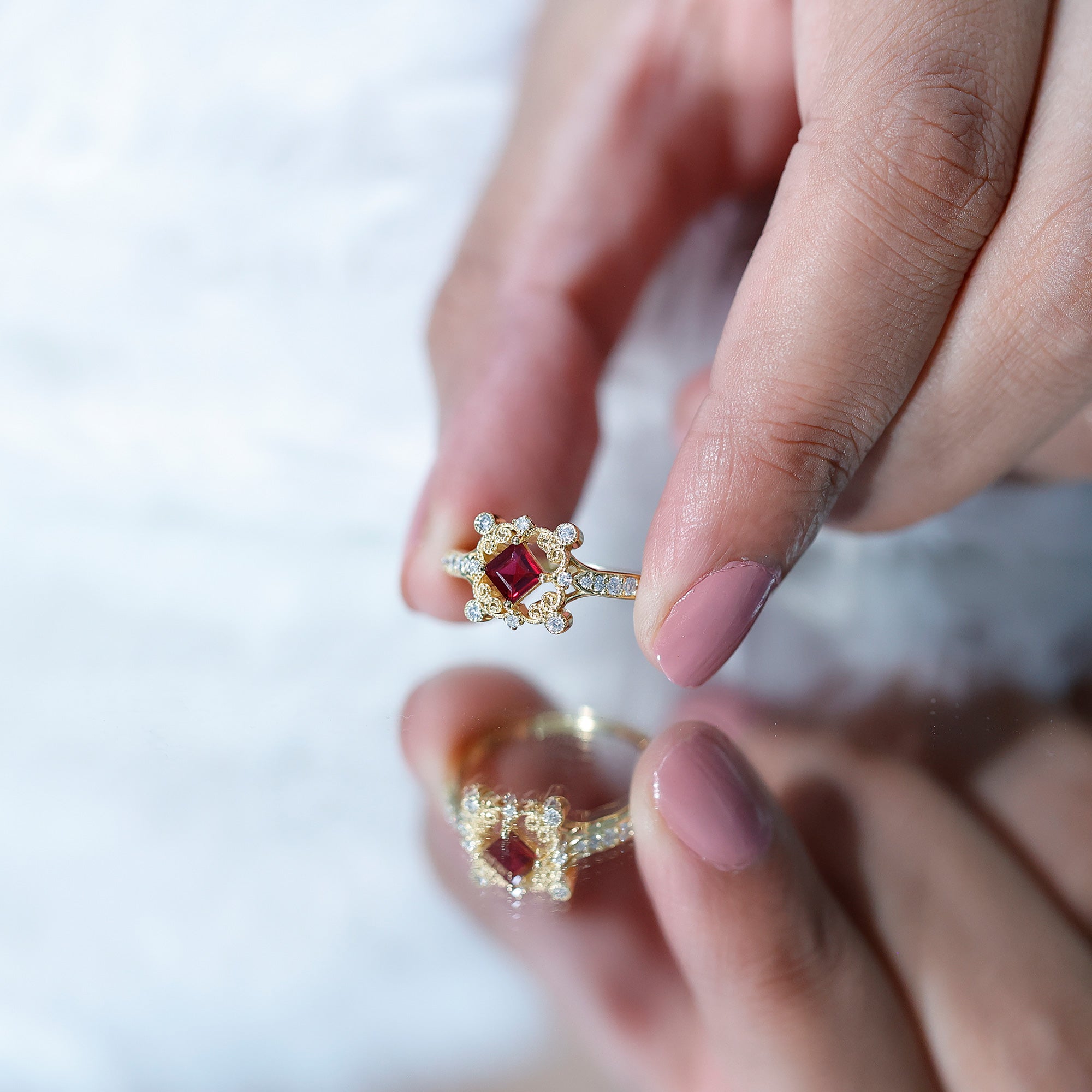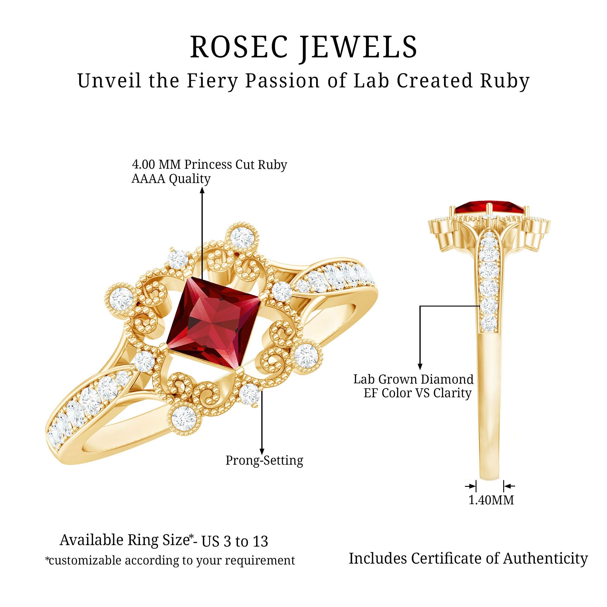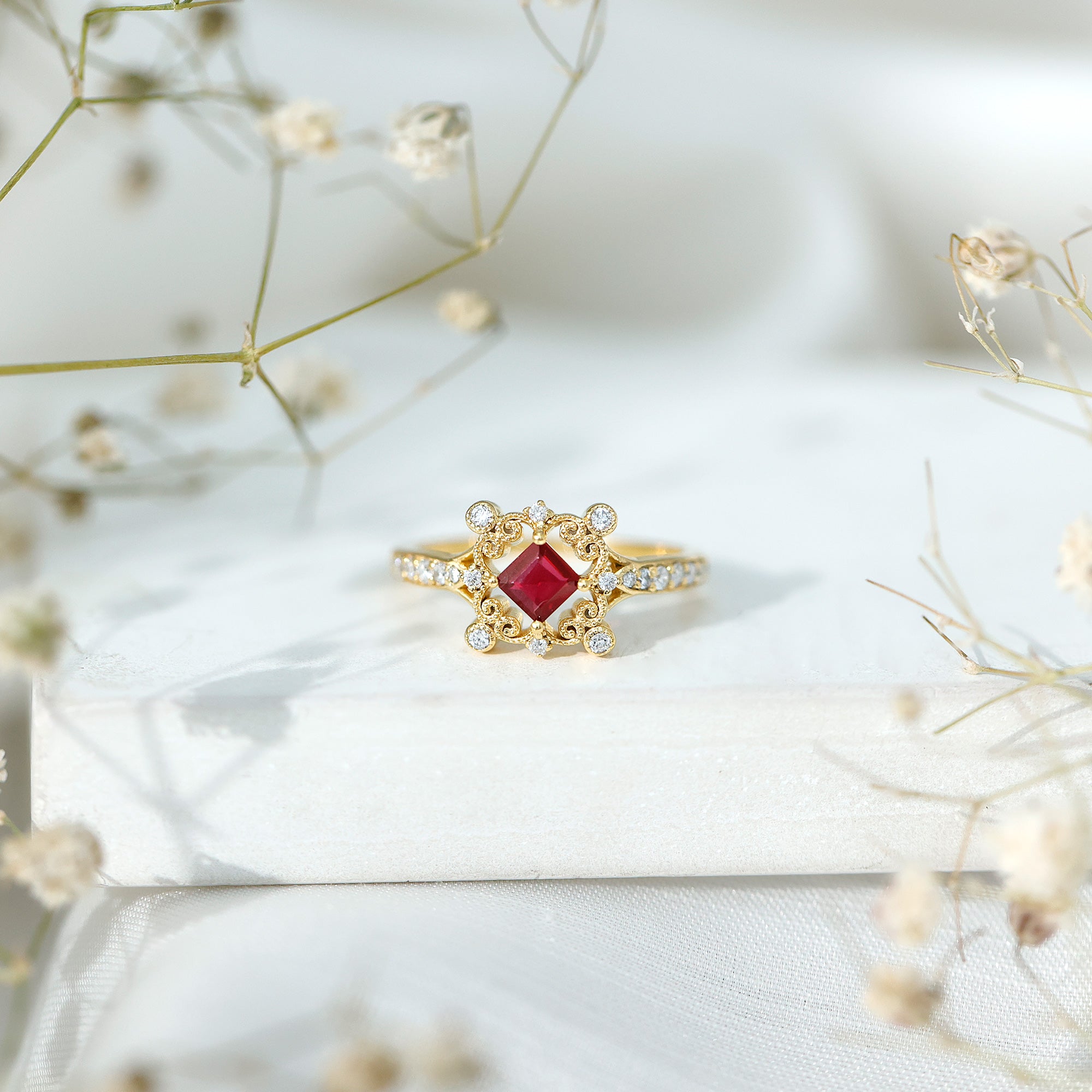 Capture the essence of timeless romance with this Art Deco Engagement Ring, a perfect symbol of enduring love and passion. At its center lies a striking 4 mm Princess Cut Lab Created Ruby, diagonally set in Prong Setting to create a unique and eye-catching focal point. The deep, vibrant red of the Lab Ruby represents love, courage, and passion, making this AAAA Quality Lab Grown Ruby Ring a meaningful choice to celebrate your lifelong commitment. Surrounding the Lab Ruby is a Vintage Inspired design, complete with delicate Beaded Detailing that reflects the elegance of a bygone era, adding a nostalgic charm to the piece. Adding to its brilliance, sparkling Lab Grown Diamond stones are beautifully set around the center and continue along the band, providing exceptional shimmer to the design. Ethically created and carefully crafted with Yellow Gold Plated Sterling Silver, this Ruby Diamond Engagement Ring blends sustainability with luxury, offering a modern yet vintage inspired alternative to traditional Ruby Engagement Ring. Whether for a proposal or an anniversary, this Princess Cut Engagement Ring speaks to the depth of your love story, making every glance a reminder of passion, elegance, and everlasting devotion.