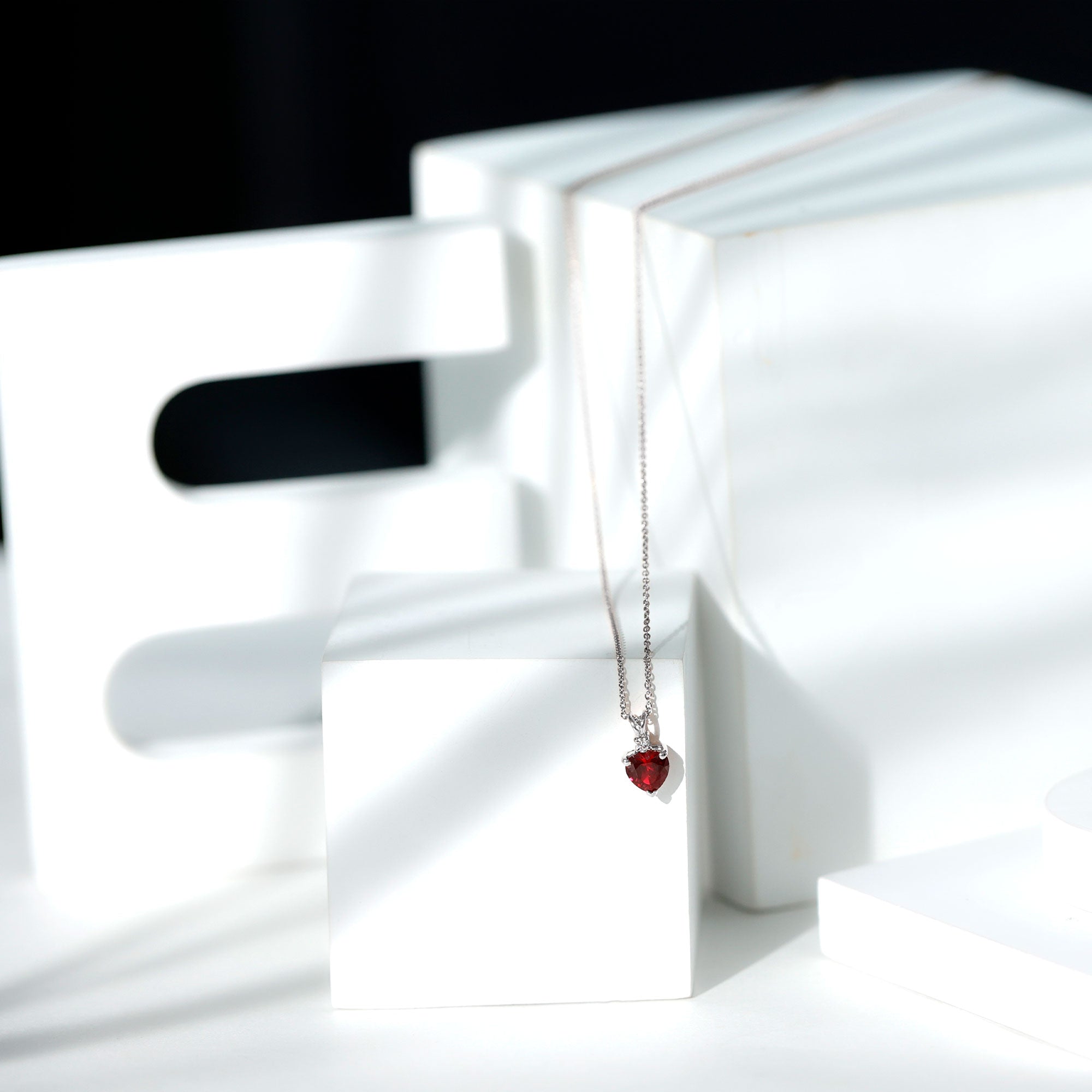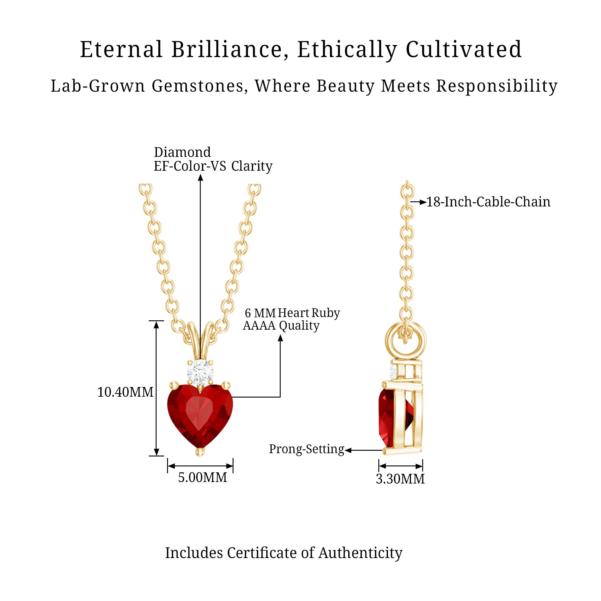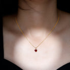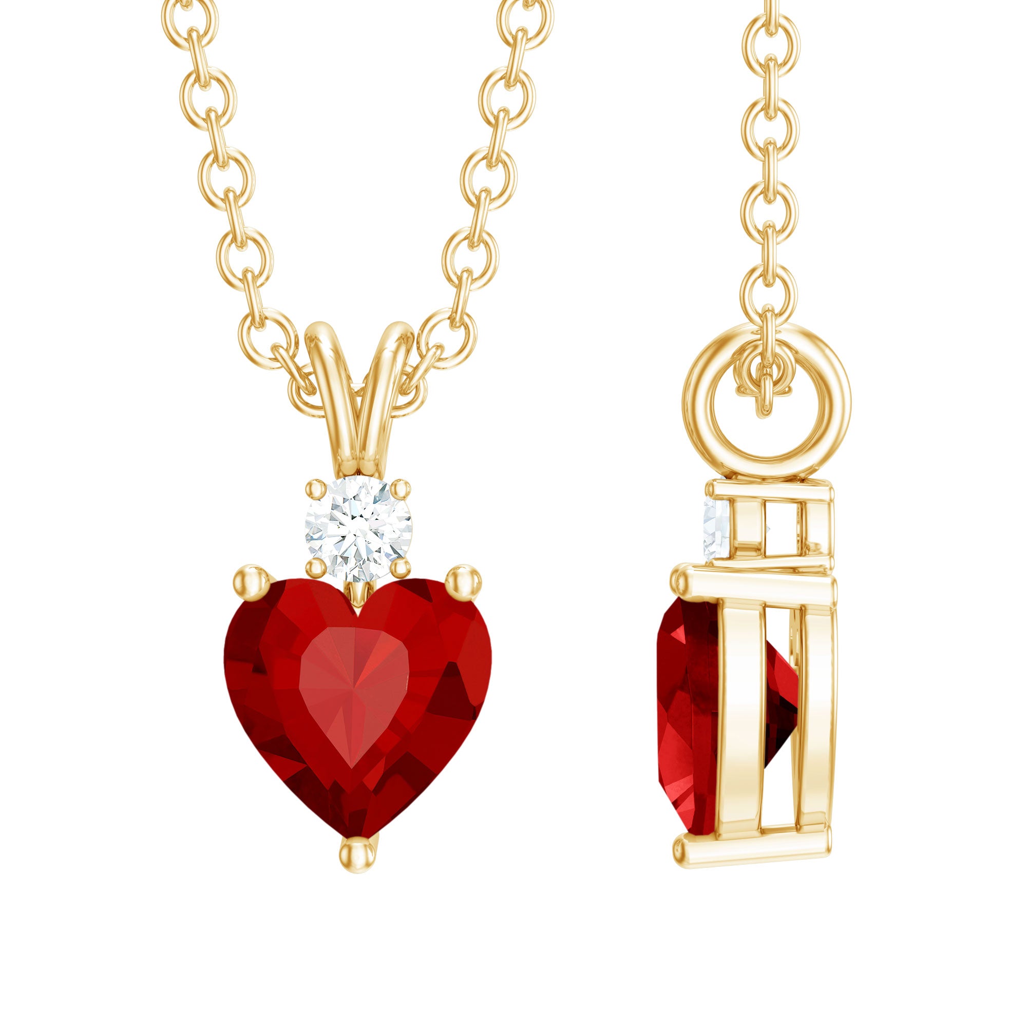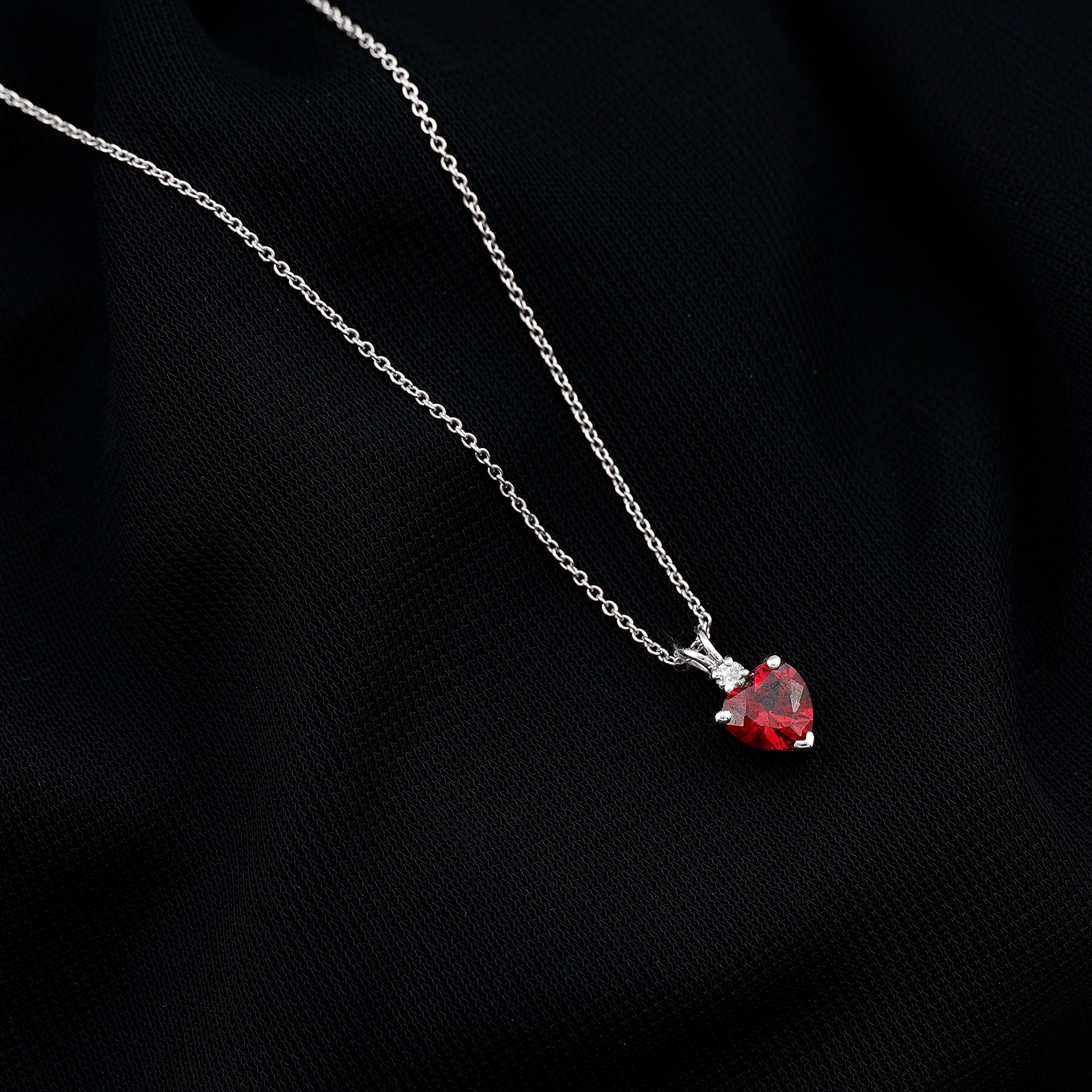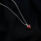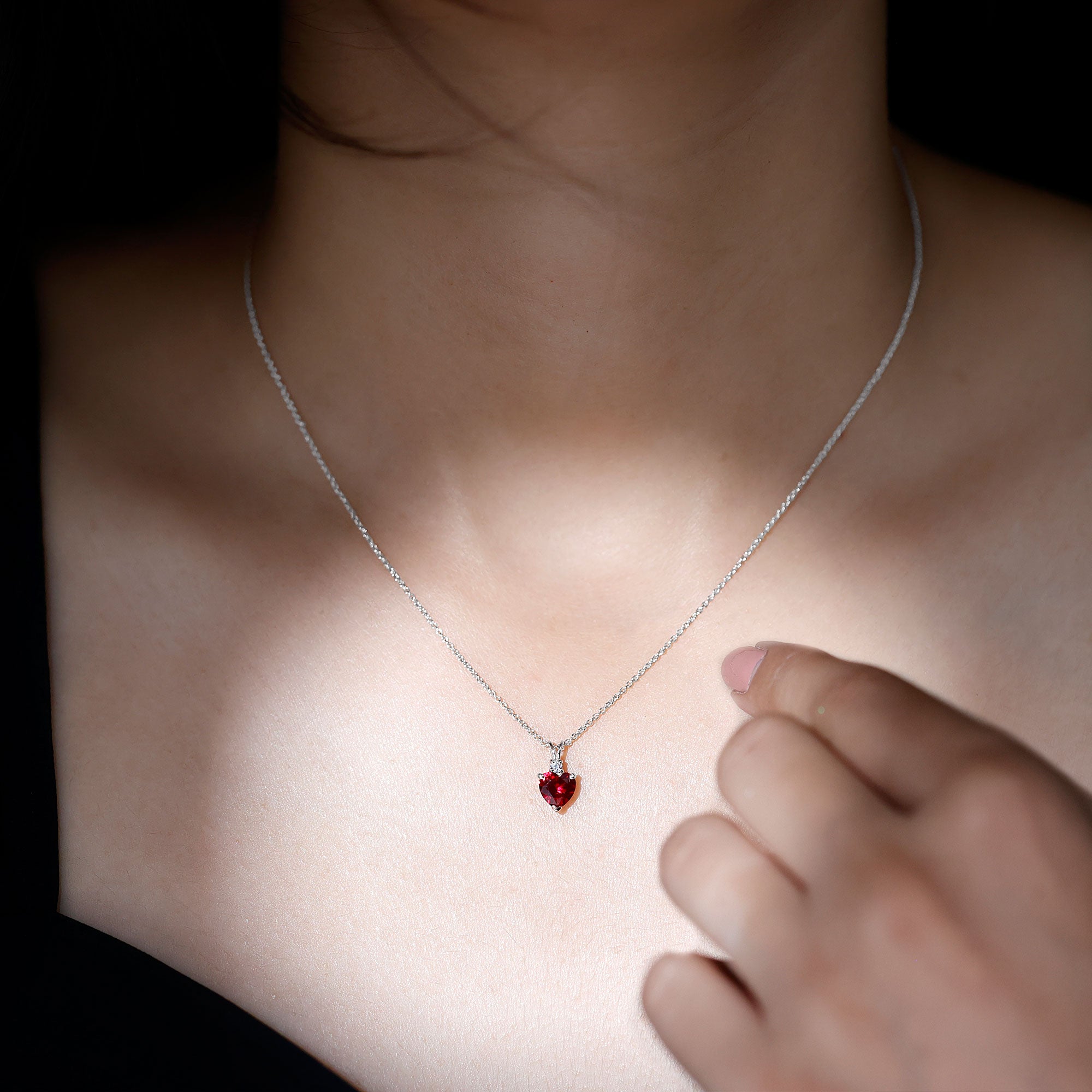 Grace your neckline with this Aaaa quality Ruby Heart Necklace a piece of jewelry that defines love and compassion. The 6 MM Heart Shaped Lab Grown Ruby is meticulously set in a prong setting and connected with a cute rabbit ear bail, exhibiting a touch of grace. This Solitaire Pendant is amplified by the sparkle of round shaped Lab Grown Diamond. This Ruby and Diamond Pendant is ideal for gifting to your beloved. Rosec Jewels offers sustainable jewelry crafted with perfection to satisfy every womans need. Our July Birthstone Necklace is packed in a Signature Jewelry Box.