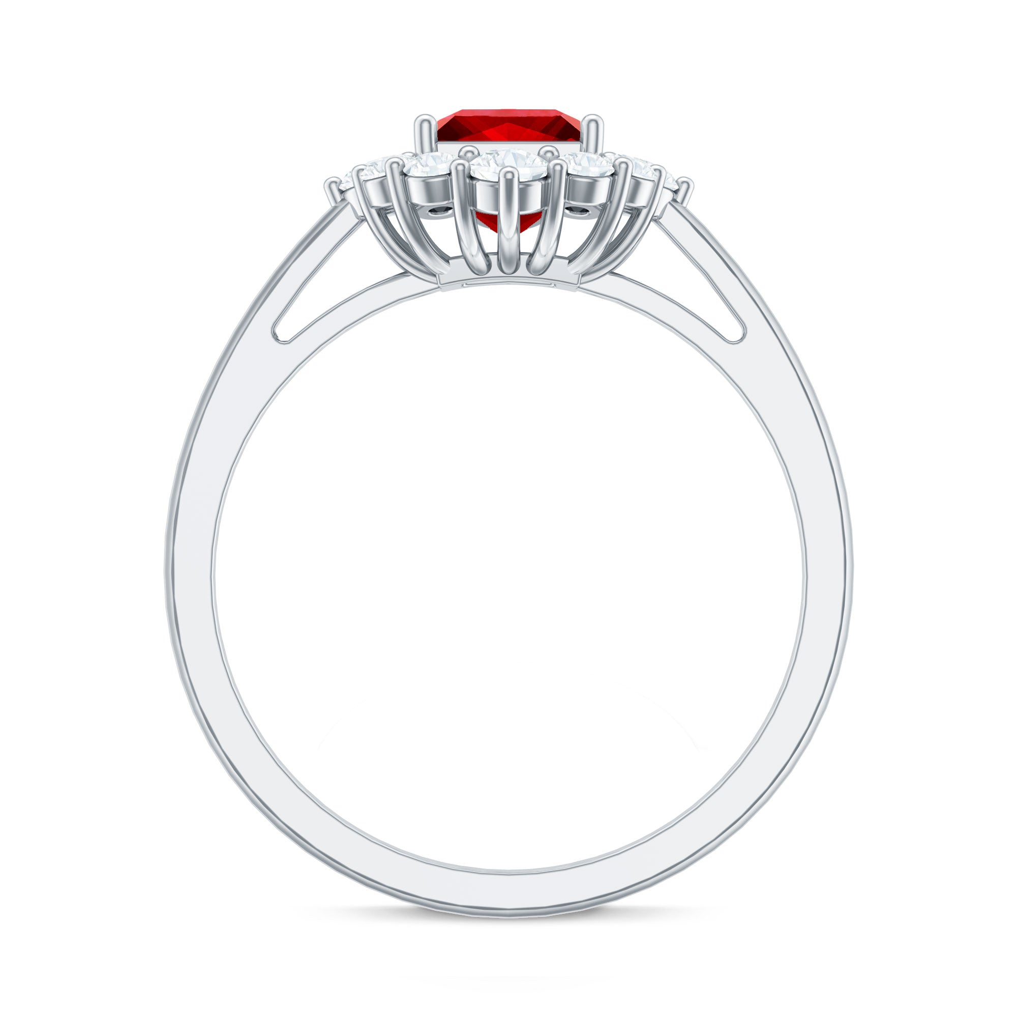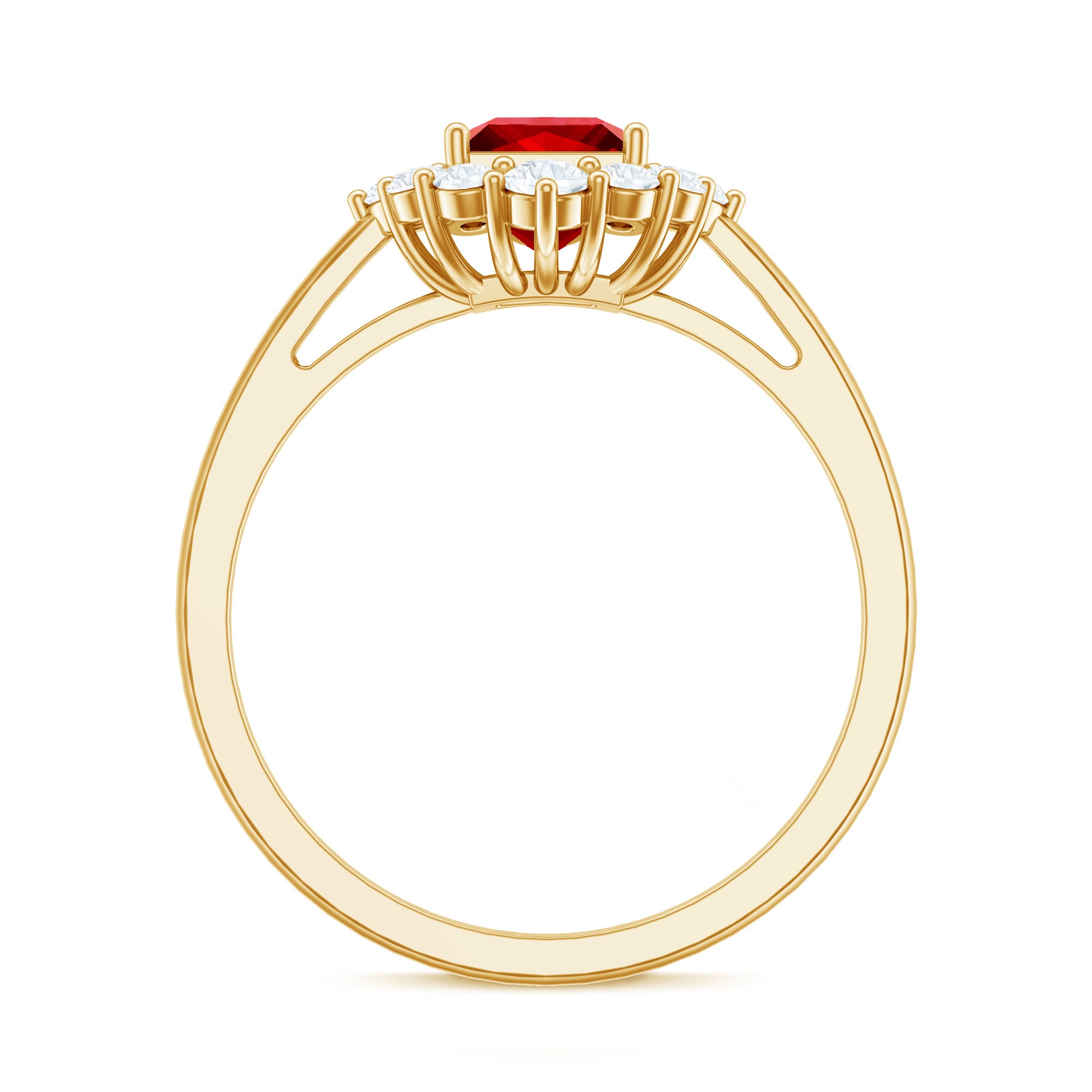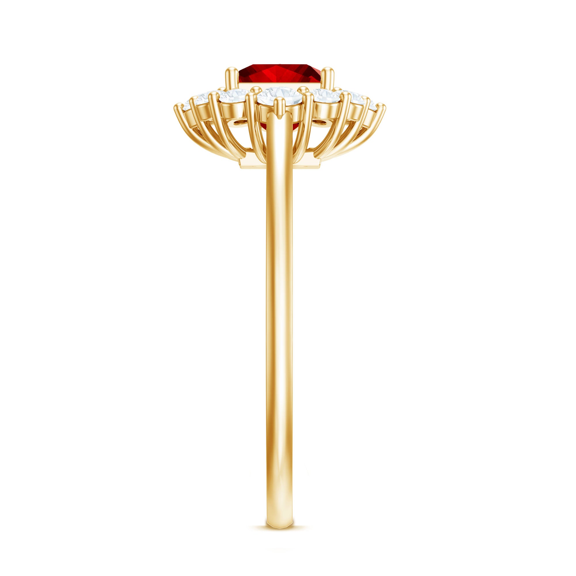This Lab Created Ruby Engagement Ring is a beautiful mix of elegance and modern charm. At the center sits a 6 MM princess cut lab created ruby, held securely in prong setting. Around the ruby, a shining diamond halo adds extra brilliance, creating a lovely contrast that catches the light from every angle. Each diamond is carefully placed to enhance the center ruby’s glow, giving the Princess Cut Engagement Ring a touch of luxury. The polished band adds a smooth and graceful finish, making this piece perfect for any occasion, whether it is an engagement, anniversary, or a special gift. Every stone in this Ruby and Diamond Ring is expertly crafted, and it comes with a certificate for quality and authenticity, so you can be confident in its lasting beauty. Available in a variety of ring sizes, it is designed to fit comfortably while maintaining its elegant look. Presented in a beautifully packaged jewelry box, this Halo Engagement Ring is ready to gift or cherish. With its timeless design and sparkling detail, it is a lasting symbol of love and commitment.