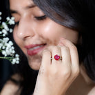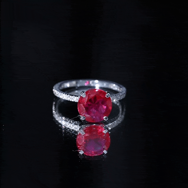 Enhance your allure with the enchanting elegance of this lovely Solitaire Engagement Ring embellished with Round Shape Created Ruby with Diamond side stones. This ring showcases the warmth of Created Ruby, imparting a satisfying radiance to your appearance.