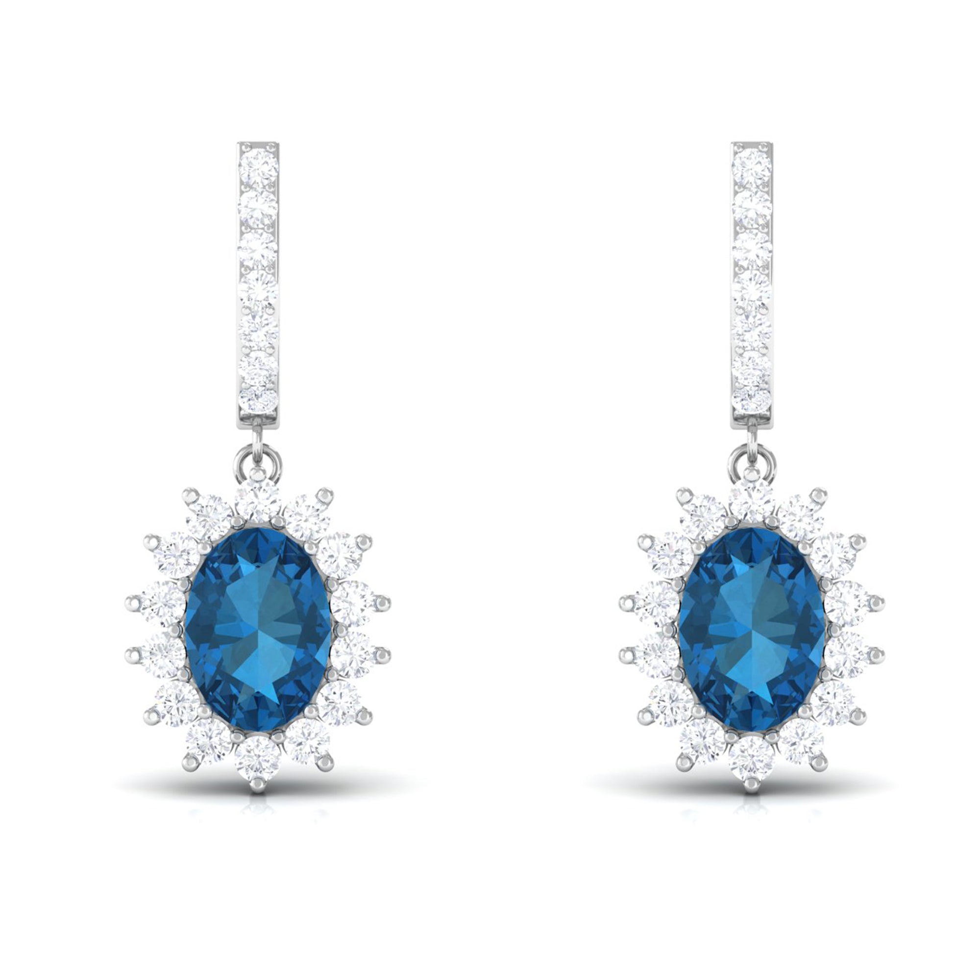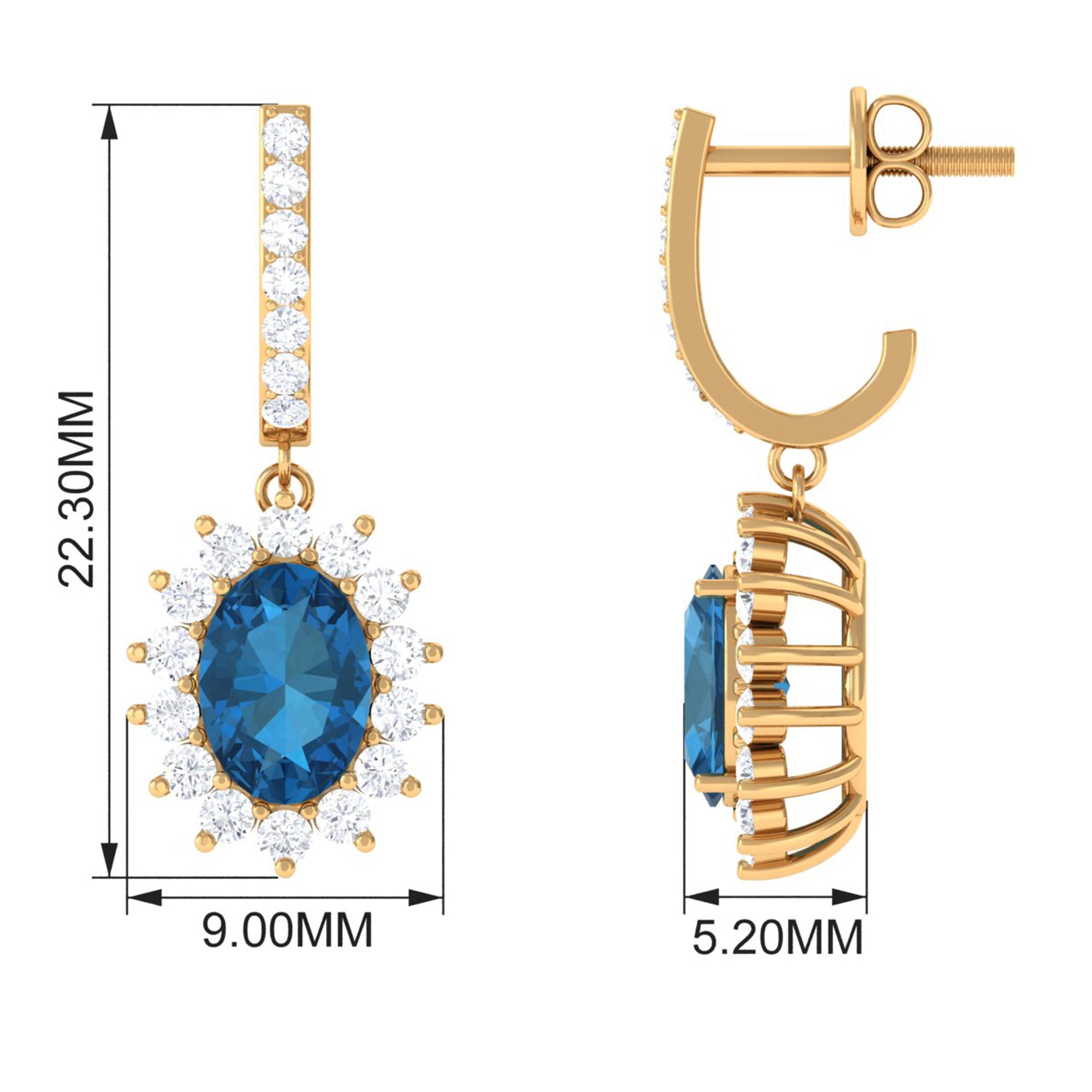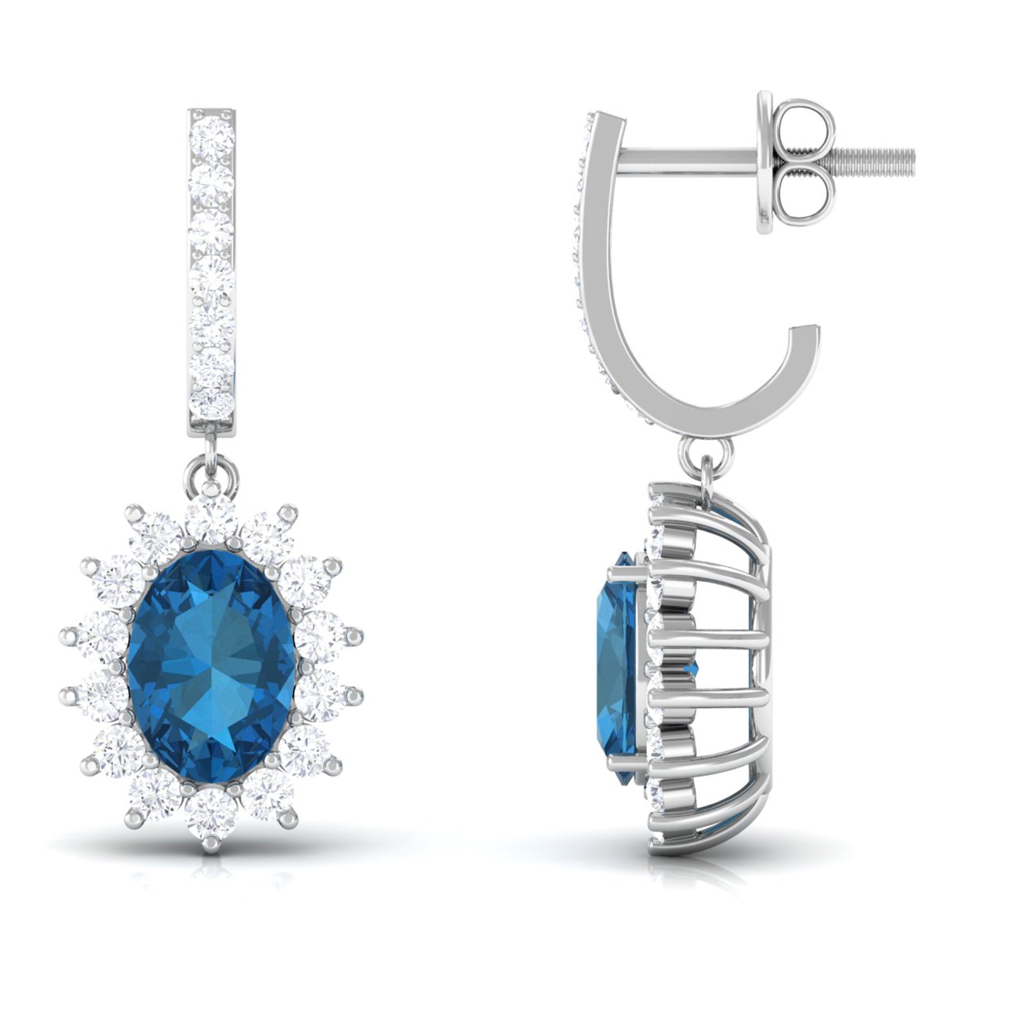 Jewelry has the power to be the one little thing that makes you feel unique. These J Hoop Drop Earrings are embellished with Oval Cut London Blue Topaz and Round Shape Diamond Halo in Prong Setting. These London Blue Topaz Earrings are available in various metal options. Tell your story by wearing these Beautiful Sunburst Earrings.