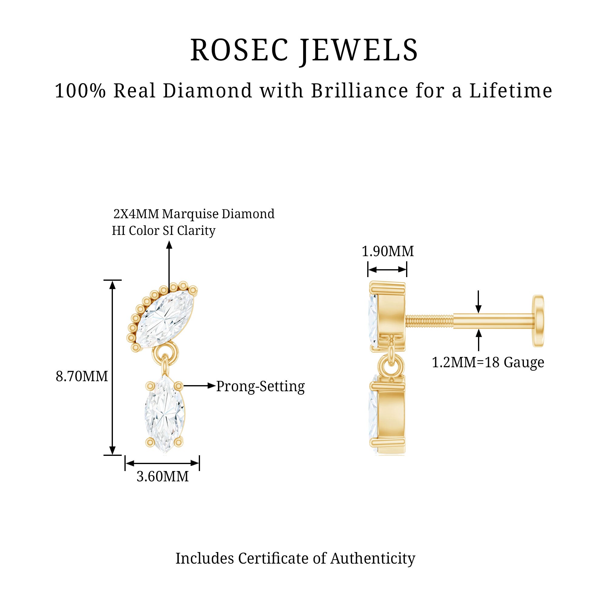 This Marquise Diamond Drop Earring is a must-have for any dainty piercing jewelry lover. Picture a sleek Marquise Cut Diamond with gold beaded detailing on top, with a Marquise Diamond hanging as a drop adding a hint of irresistible sparkle. This Diamond Earring is a style statement perfect for your Helix, Cartilage, Tragus, or Conch Piercing. Worried about it slipping off? Fret not! The flat back closure ensures it stays put, so you can flaunt it without a care. This Unique Earring is your go-to. Its a memory in the making that youll cherish forever. Grab it now and make the moment unforgettable!