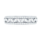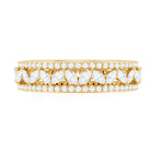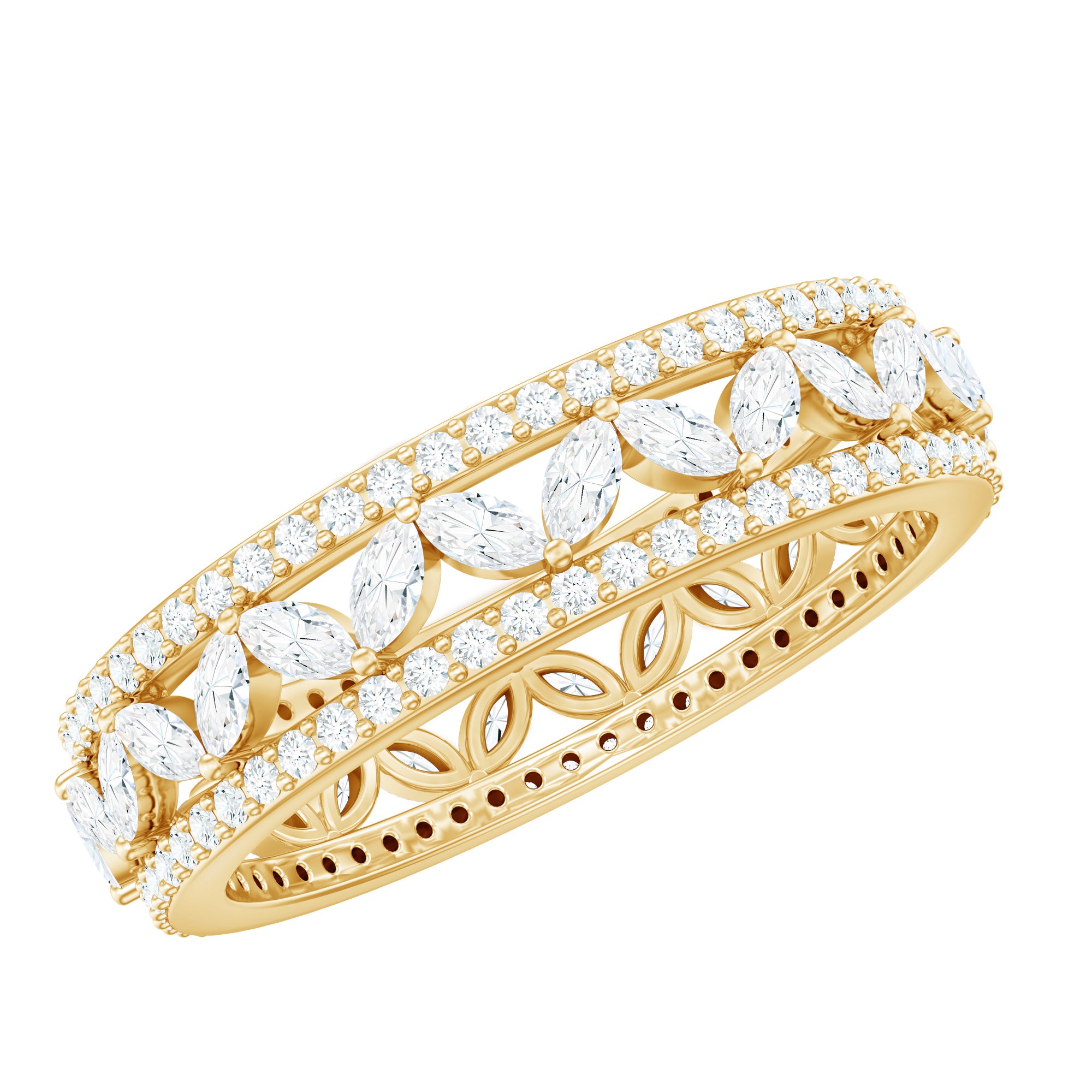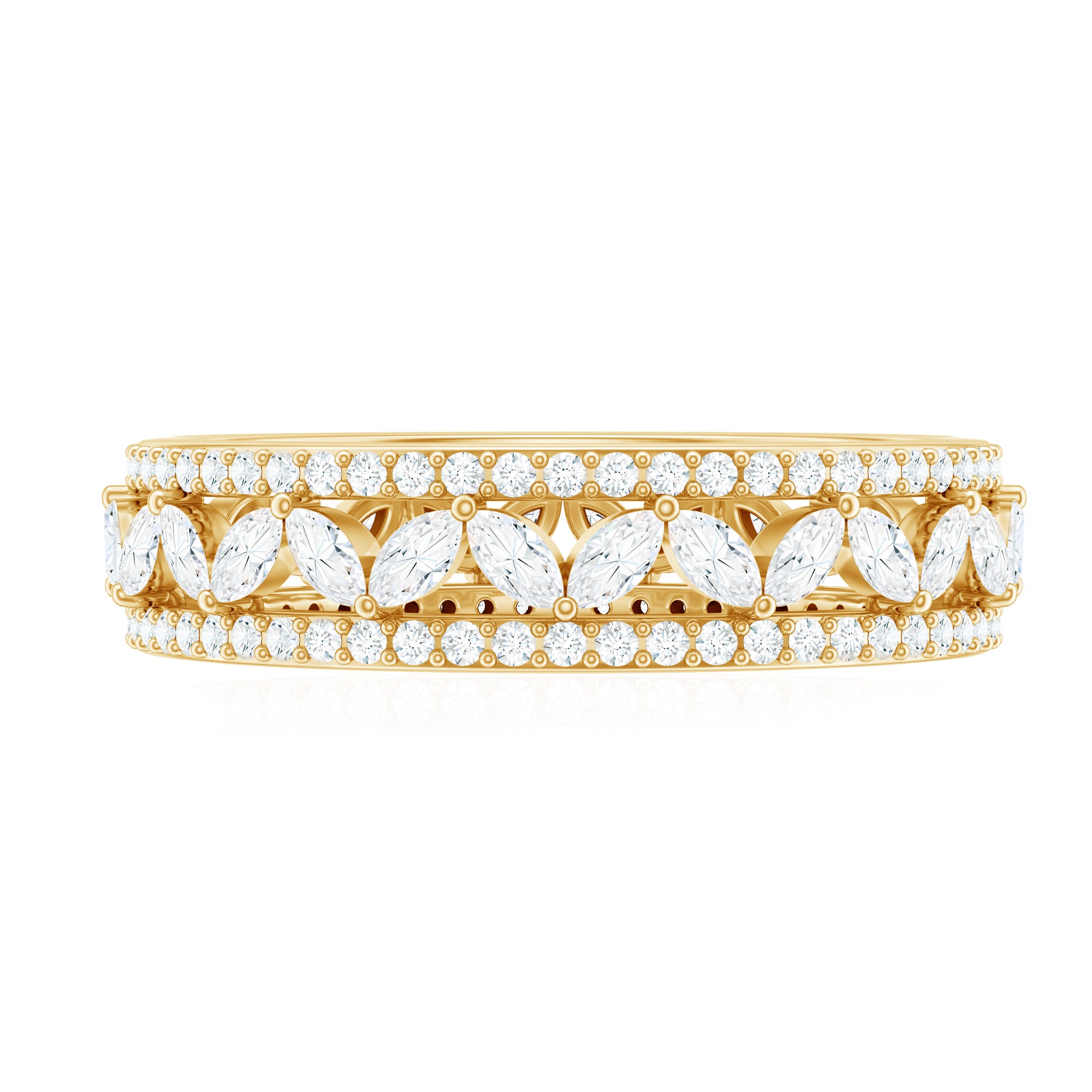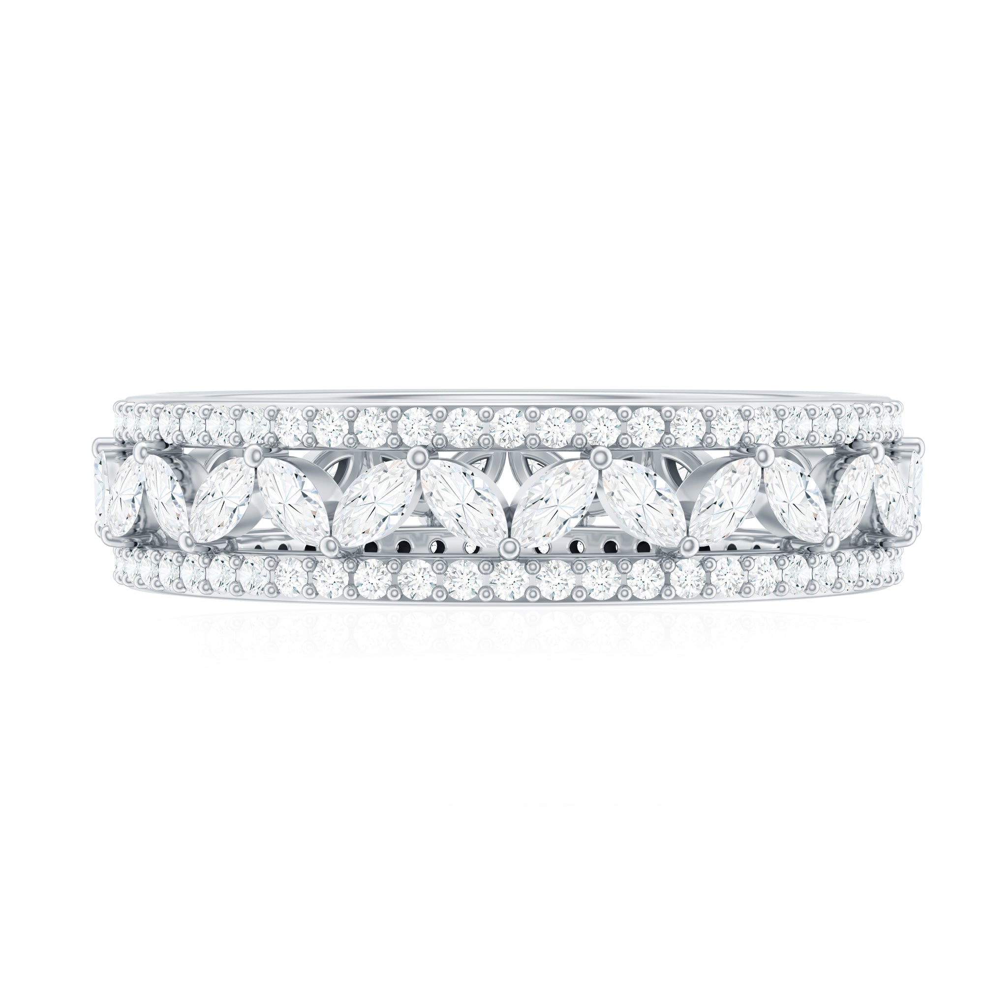 Slip on this certified marquise moissanite wedding band and let its brilliance shine as bright as your love. The elongated marquise cut moissanite is a stunning gemstone, flanked by small sparkling round moissanites in prong setting for a truly eye-catching look. This wedding band is perfect for the modern bride who wants a unique and stylish ring.