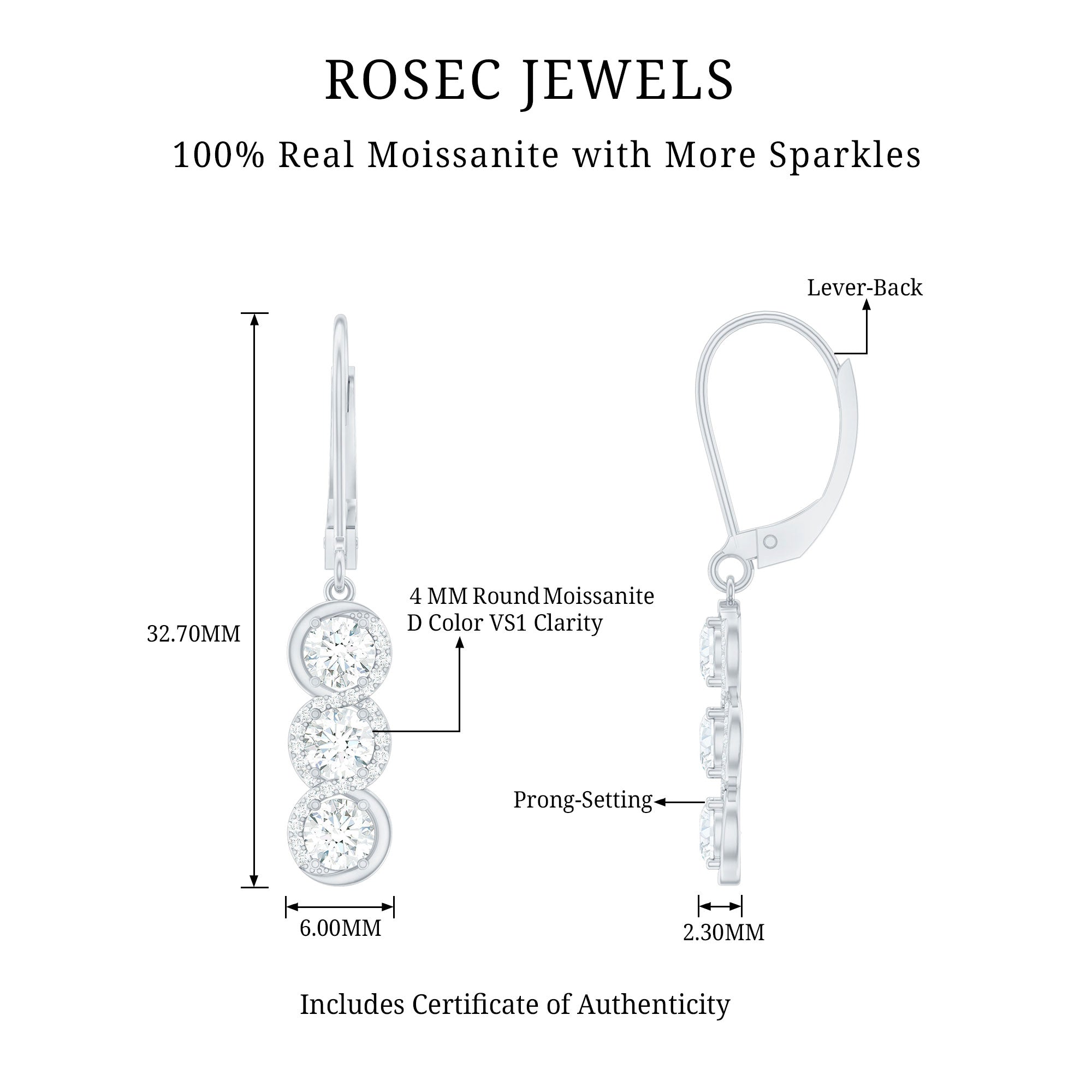 These stunning Moissanite Drop Earrings are designed to capture the heart of your most meaningful moments. Perfect for weddings, anniversaries, or any day you want to shine a little brighter, these Dangle Drop Earrings bring together timeless symbolism with a touch of modern sparkle. Crafted in 14k white gold plated silver, the elegant bar style drop design features three brilliant 4 MM round cut moissanites set vertically, each framed with a delicate halo of smaller moissanites. The shimmering frame enhances the center stones without overpowering them, allowing every detail to catch the light beautifully. The lever back closure ensures a secure and comfortable fit, so you can wear them confidently from the ceremony to the celebration. Known for its diamond-like brilliance and exceptional durability, moissanite adds a luxurious yet ethical touch. These Moissanite Bridal Earrings come with a certificate of authenticity and a beautiful jewelry box, ready for gifting or keeping as a cherished keepsake. Whether you are walking down the aisle or dressing up for a romantic evening, these Wedding Drop Earrings are a celebration of love that sparkles with meaning.