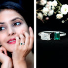 Celebrate the union with your lover with this Emerald Moissanite Ring, crafted with 14K White Gold Plated Silver for your big day. The ring features a 7X5 MM Emerald Cut Lab Grown Emerald and a 4X6 MM Emerald Cut Moissanite securely placed in Prong Setting. This Two Stone Engagement Ring is adorned with smaller Moissanite. This Toi et Moi Ring beholds the classic shine of D-VS1 Quality Moissanite and AAAA Quality Lab Created Emerald. This ring is the symbol of the union of two distinct personalities coming together for love, and that makes a perfect symbol to celebrate the big day with your special one.