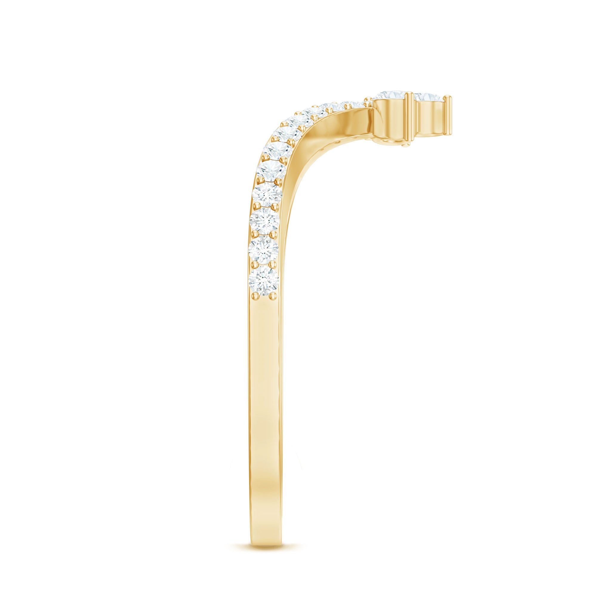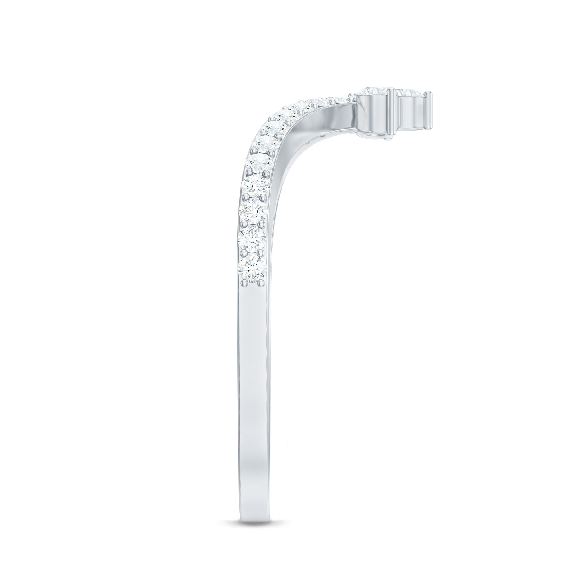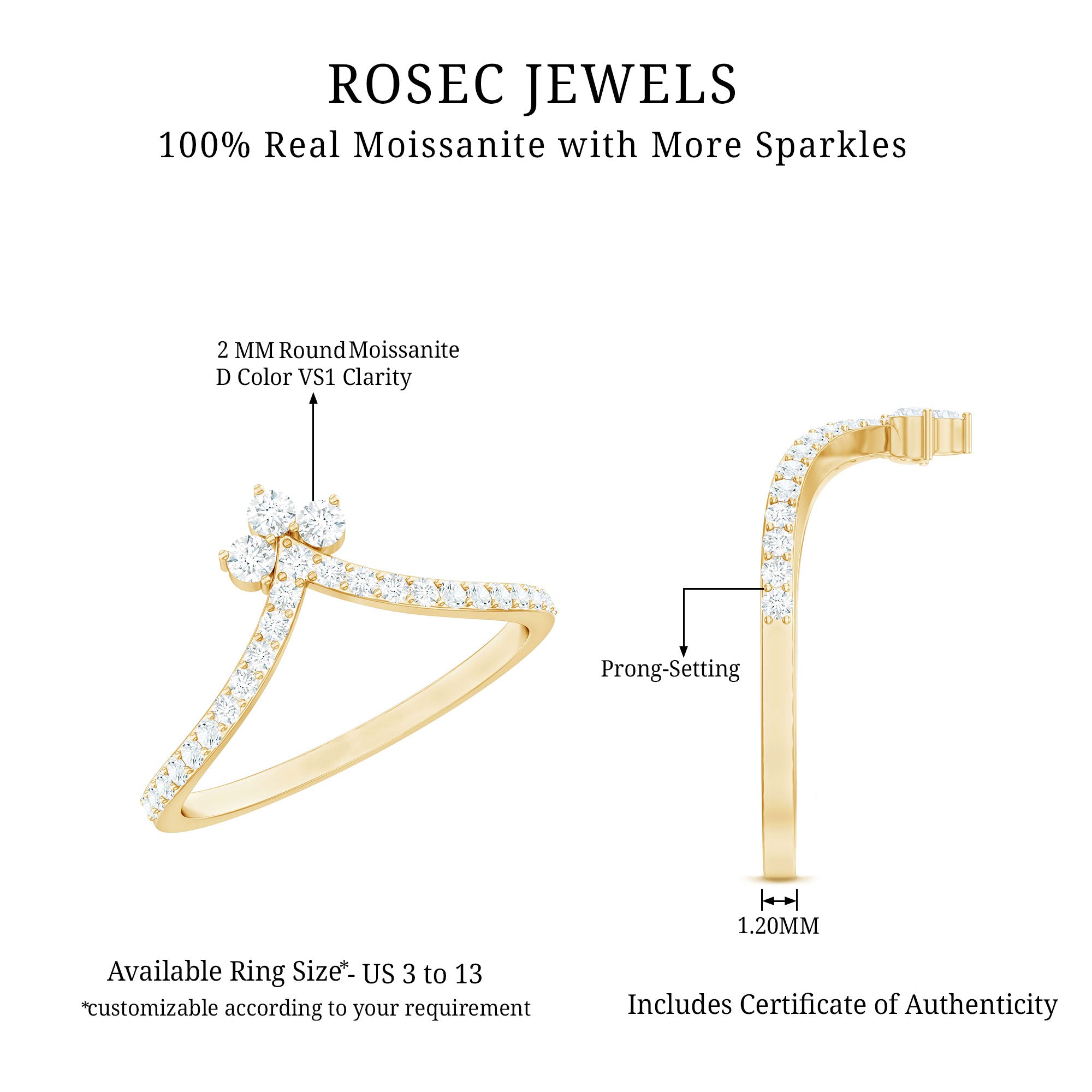 Revitalize your old engagement ring with this stylish V-shaped Moissanite Enhancer Ring. Crafted in a chic chevron design, this ring provides a contemporary and sophisticated way to accentuate your engagement ring or wear it alone for a subtle sparkle. This Chevron Ring features a line of stunning round cut moissanite stones securely set in prongs. Renowned for their exceptional fire and clarity, these moissanites are of D-VS1 quality, delivering the brilliance of diamonds while being ethical and budget-friendly. Each stone is meticulously placed to guarantee a smooth, continuous shine that follows the curve of the band. Whether you are stacking it with your engagement ring, celebrating an anniversary, or simply adding a touch of glam to your everyday look, this Chevron Stackable Ring is designed to shine while maintaining elegance. Its slim and comfortable design makes it easy to wear daily. Offered in various ring sizes, metal colors, and purities, this V Shaped Wedding Band can be customized to reflect your personal style. A thoughtful option for brides, anniversary gifts, or just to pamper yourself, this Engagement Ring Enhancer merges timeless brilliance with a trendy, modern twist.