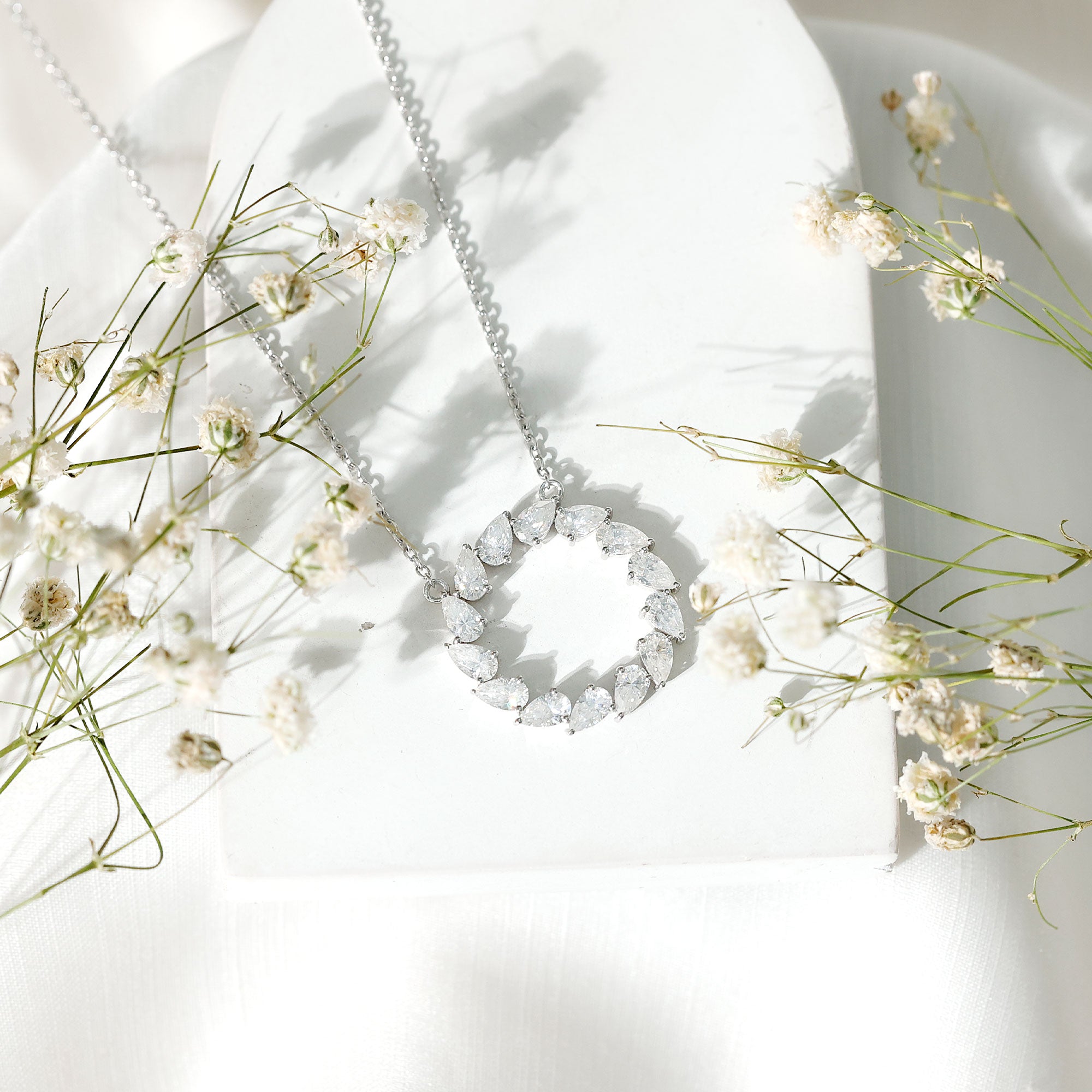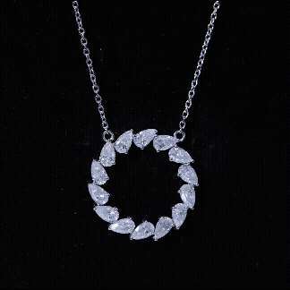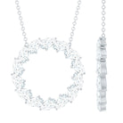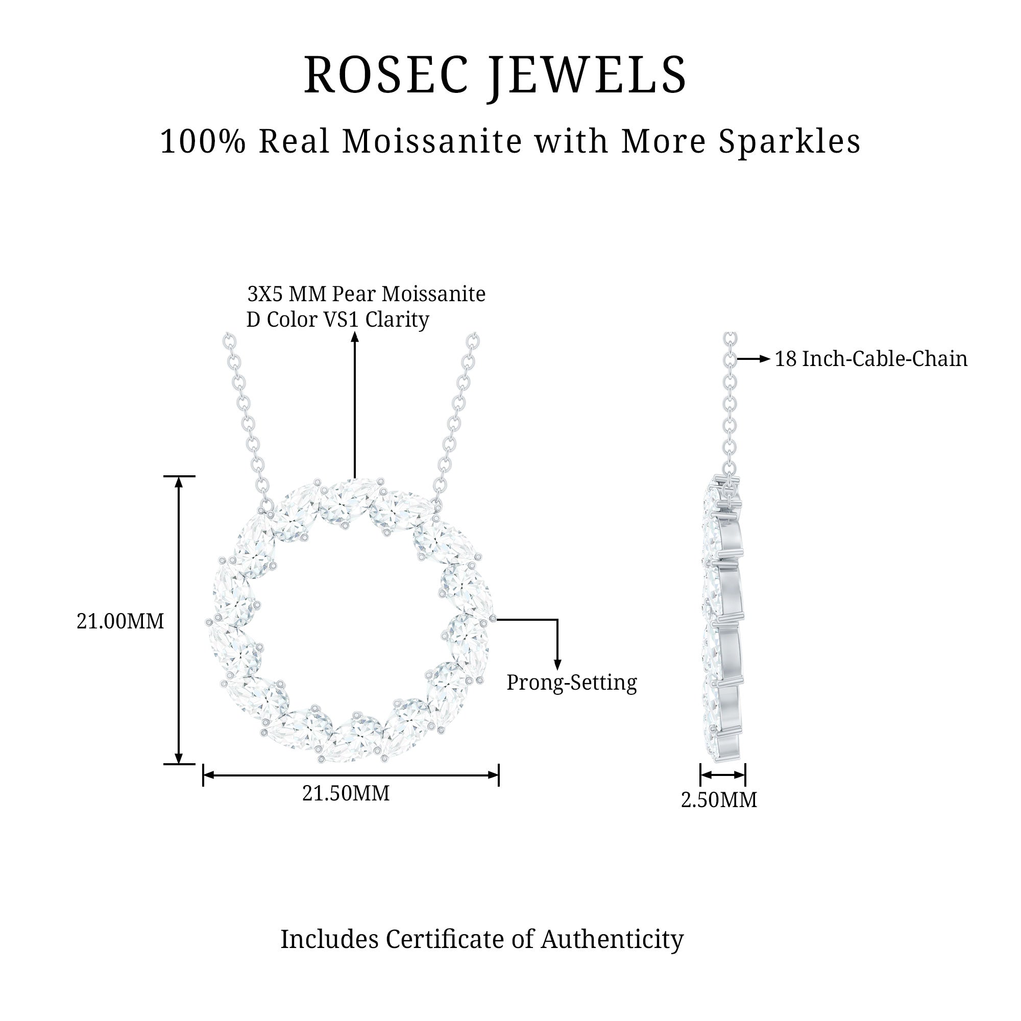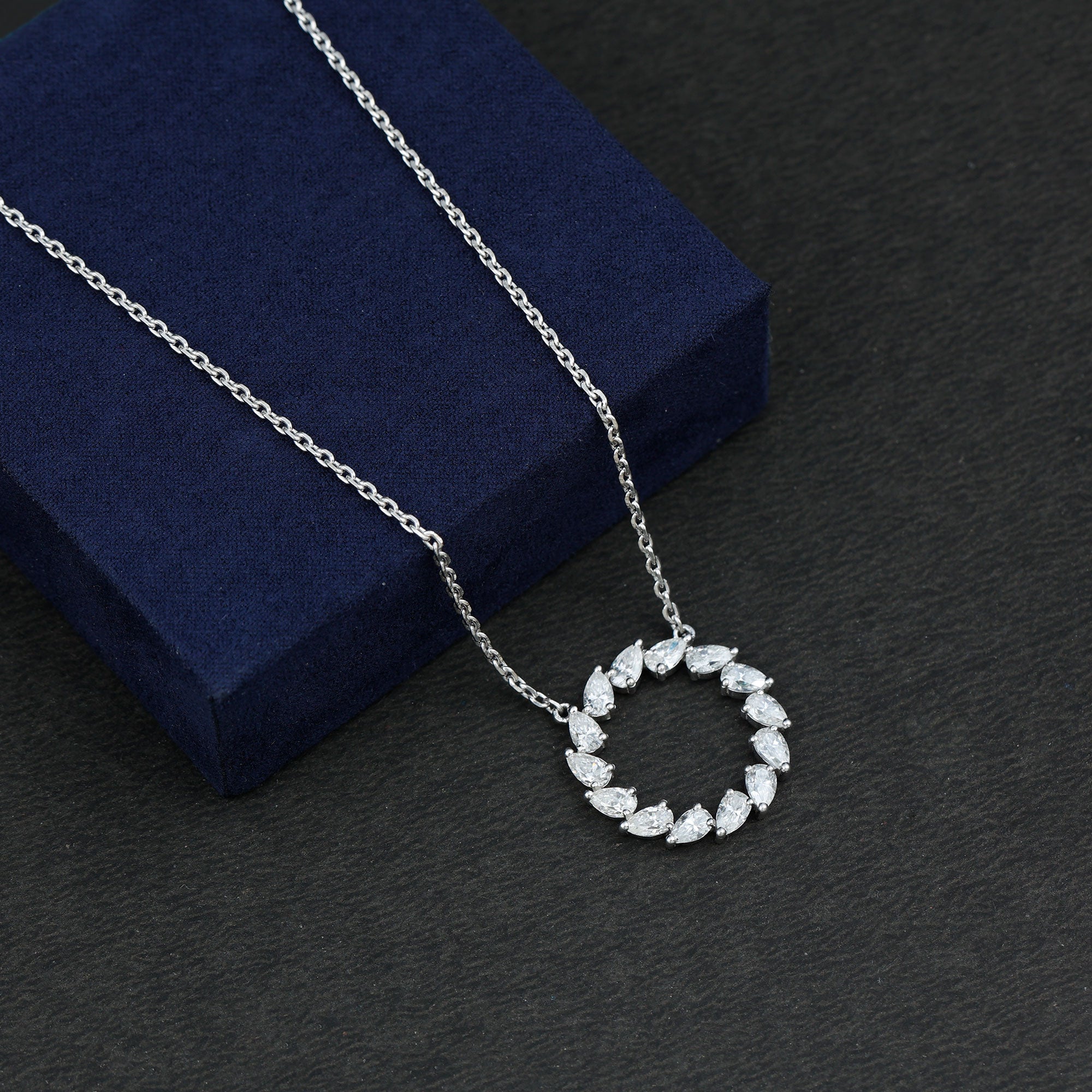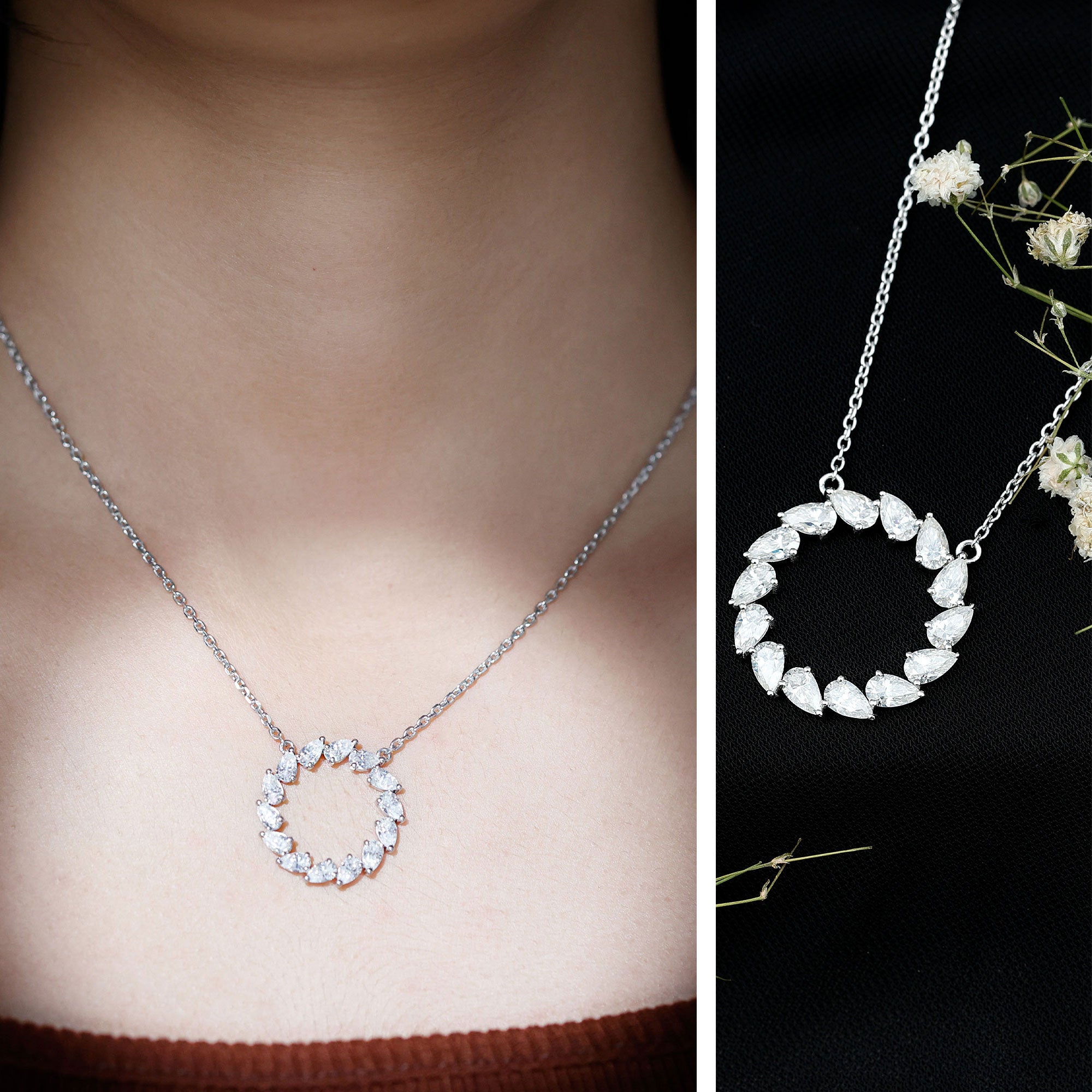 A stunning circle of moissanite stones symbolizes infinite possibilities while serving as a striking yet elegant accessory for any outfit. The Circle of Love Necklace is cherished not only for its understated charm but also for its profound meaning of everlasting love. Just as a circle has no start or finish, true love is also whole and unending. Gifting a loved one this Circle of Life Necklace beautifully conveys your feelings for them. It showcases 14 prong-set pear-cut moissanite stones that adorn the circles face, complemented by a cable chain, all crafted in 14 karat white gold plated sterling silver. This exceptional Eternity Pendant is a wonderful way to express your affection for your partner, making it an ideal choice for Valentines Day, Mothers Day, or anniversaries. Embrace your journey of life, love, and eternity with this exquisite Moissanite Stackable Necklace, perfect for your beloved. Its timeless beauty will never let her down. A true classic, this Silver Stacking Necklace is an ideal everyday accessory.