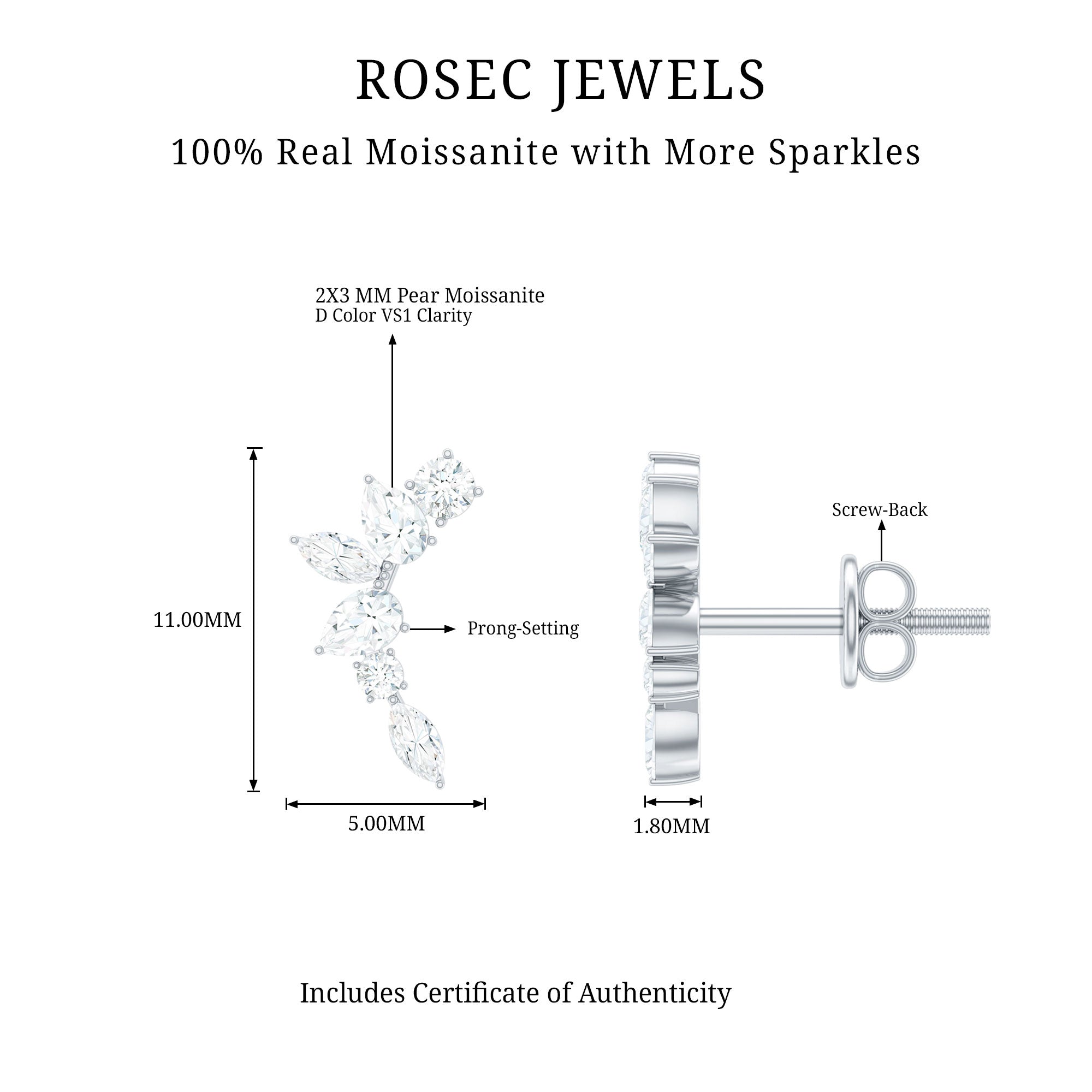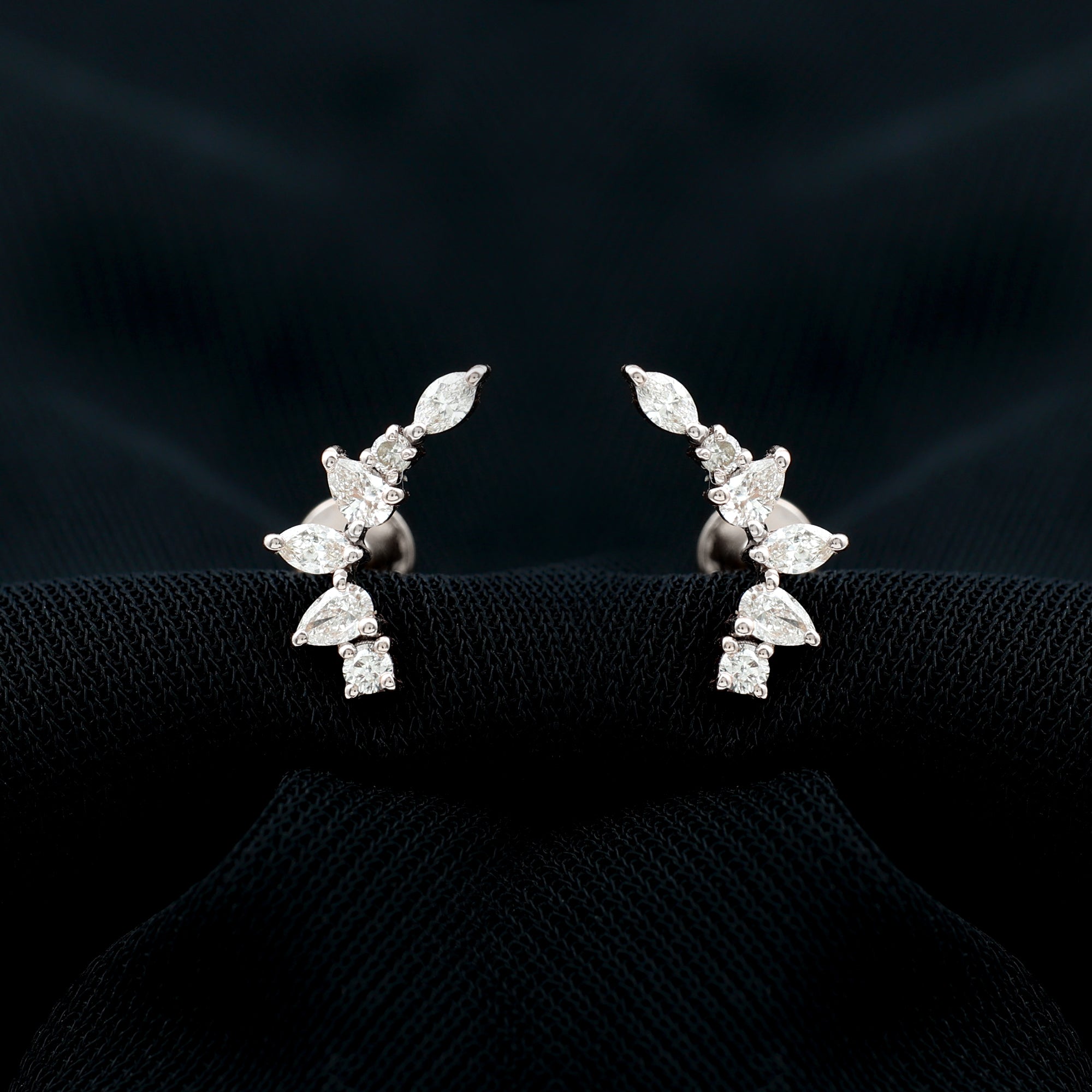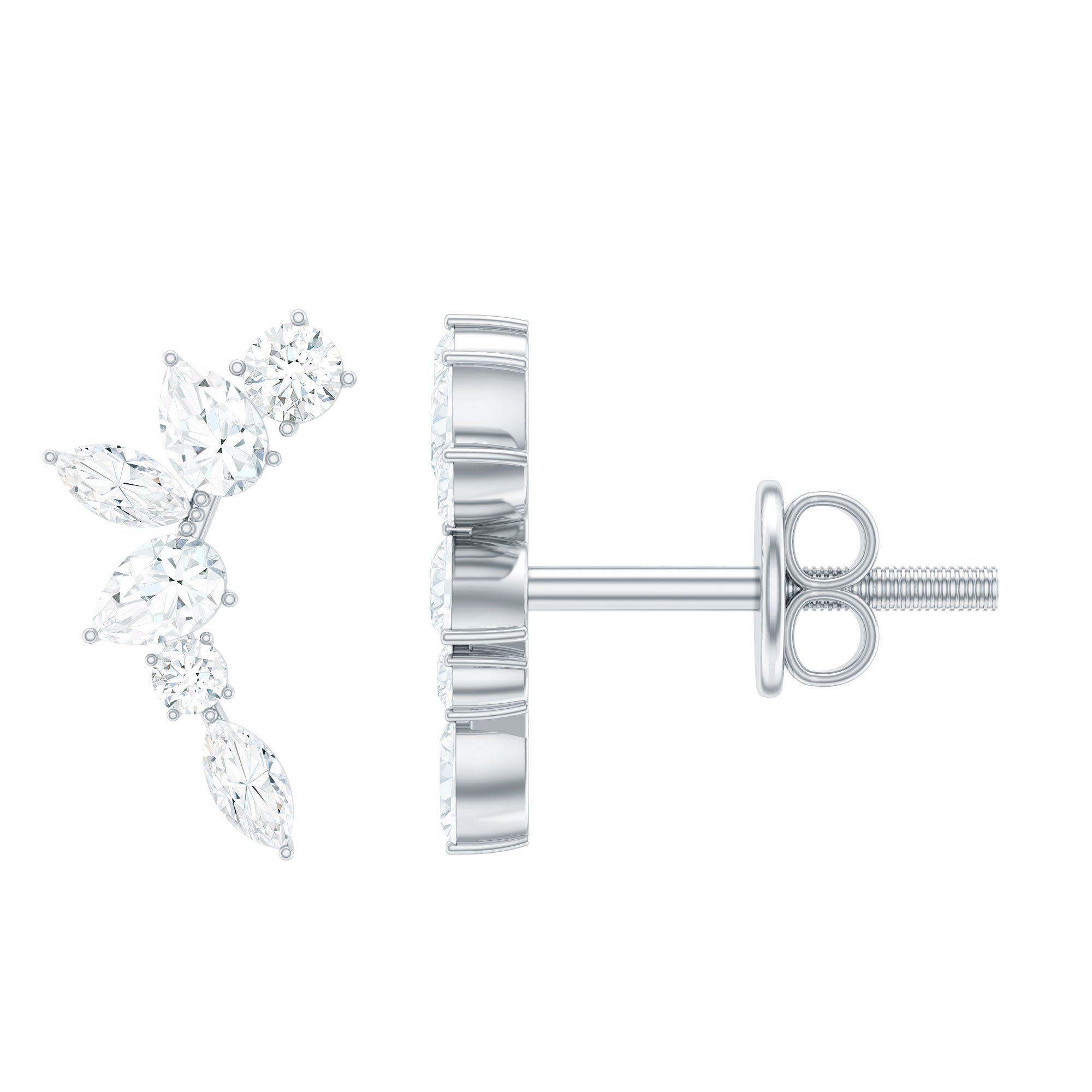 Get this alluring pair for your special one, these Climber Earrings are embellished with sparking moissanite exquisitely set in prong setting creating a beautiful leaf-style motif, exhibiting a dazzling charm. These moissanite earrings are designed with proper care and precision in sterling silver for casual and formal looks. Each earrings screw-back closures keep them safe and provides a comfortable fit during wear. Treat yourself or buy this pair for your wife, girlfriend or daughter and make them feel loved.