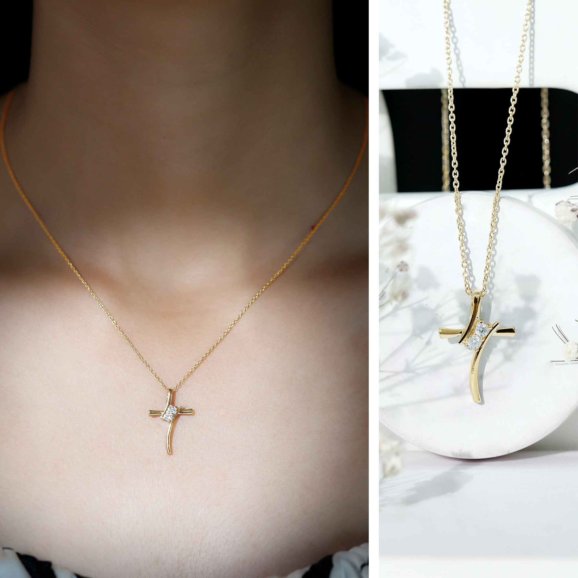 Faith and style come together beautifully in this elegant Moissanite Cross Necklace, designed to inspire and shine every day. This Religious Necklace features a modern cross with a graceful bypass design, highlighted by two sparkling round cut moissanite stones at its center. Hanging delicately from a fine chain, this piece offers a simple yet striking look that complements any outfit. More than just a piece of jewelry, this Christian Cross Pendant is a meaningful symbol of faith and hope. It serves as a reminder of love, forgiveness, and strength, keeping your beliefs close to your heart. Its modern design makes it perfect for everyday wear, whether you are dressing up for a special occasion or adding a subtle touch of elegance to your daily look. This Moissanite Pendant Necklace blends tradition with contemporary style, making it a thoughtful gift for yourself or a loved one who values faith and beauty. Lightweight and comfortable, it fits effortlessly into your life while carrying deep personal significance. Whether worn alone or layered with other pieces, this Cross Pendant offers timeless charm and inspiration that lasts beyond trends.