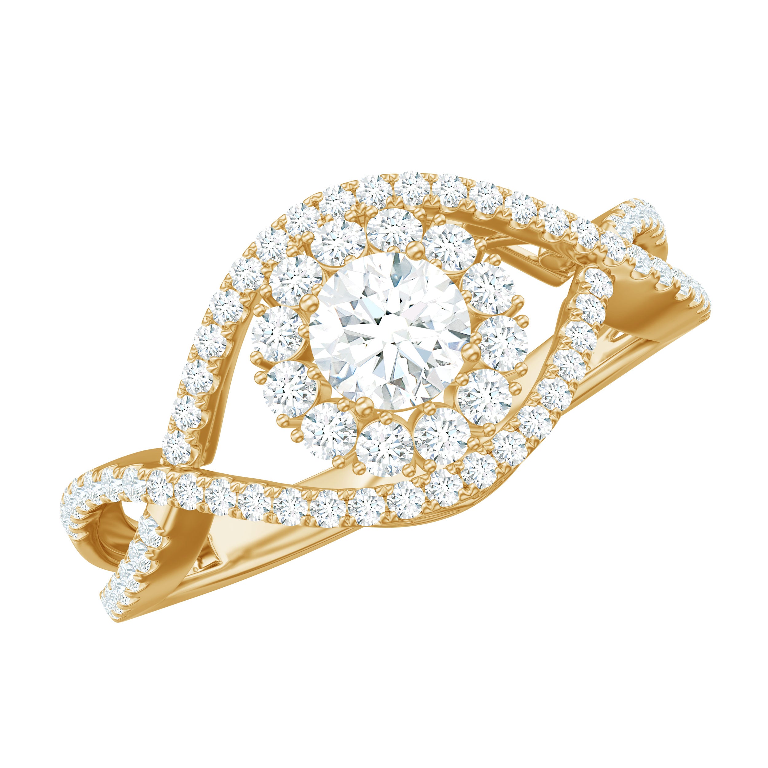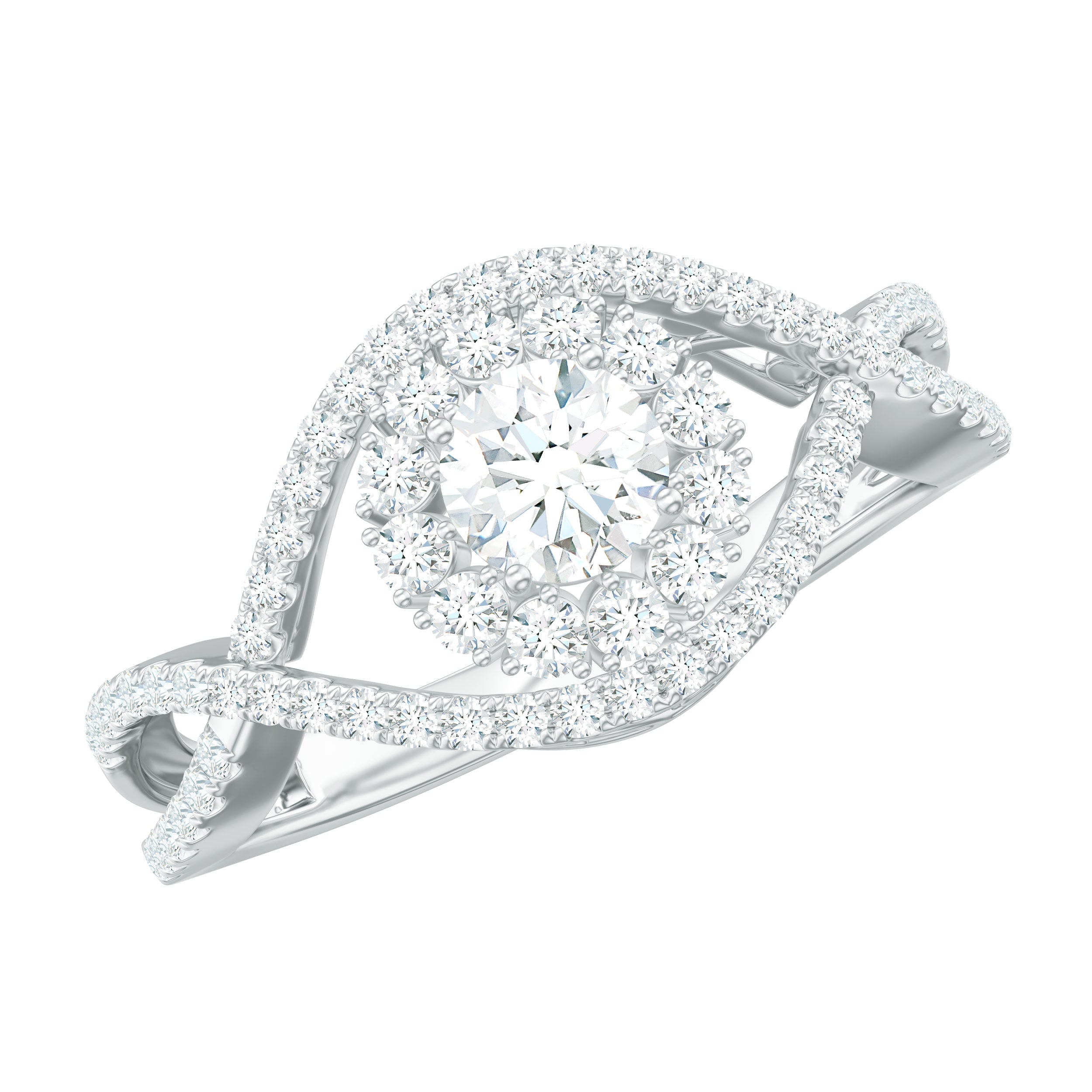 Embrace your uniqueness with this Halo Moissanite Engagement Ring, a stunning homage to modern love and classic sophistication. Crafted for the woman who values her individuality, this Criss Cross Engagement Ring merges unique design with significant symbolism, making it an ideal expression of your everlasting affection. At the heart of this enchanting piece is a 4 MM round cut moissanite, held securely in prong setting. A halo of small round moissanites surrounds the center stone, boosting its brilliance and providing a radiant shine that captures attention from all angles. The highlight of this Crossover Engagement Ring is its infinity shank, a beautifully designed feature adorned with sparkling moissanite accents that glimmer with every move. The band symbolizes the intertwining of two lives, embodying unity, balance, and the beauty of a shared path. Meticulously handcrafted and set with D-VS1 quality moissanites, this Round Engagement Ring guarantees maximum sparkle with ethical luxury. Its delicate yet bold design is perfect for the bride-to-be who loves both tradition and modern style. Delivered in an elegant jewelry box, this Halo Engagement Ring is all set to illuminate your forever moment.