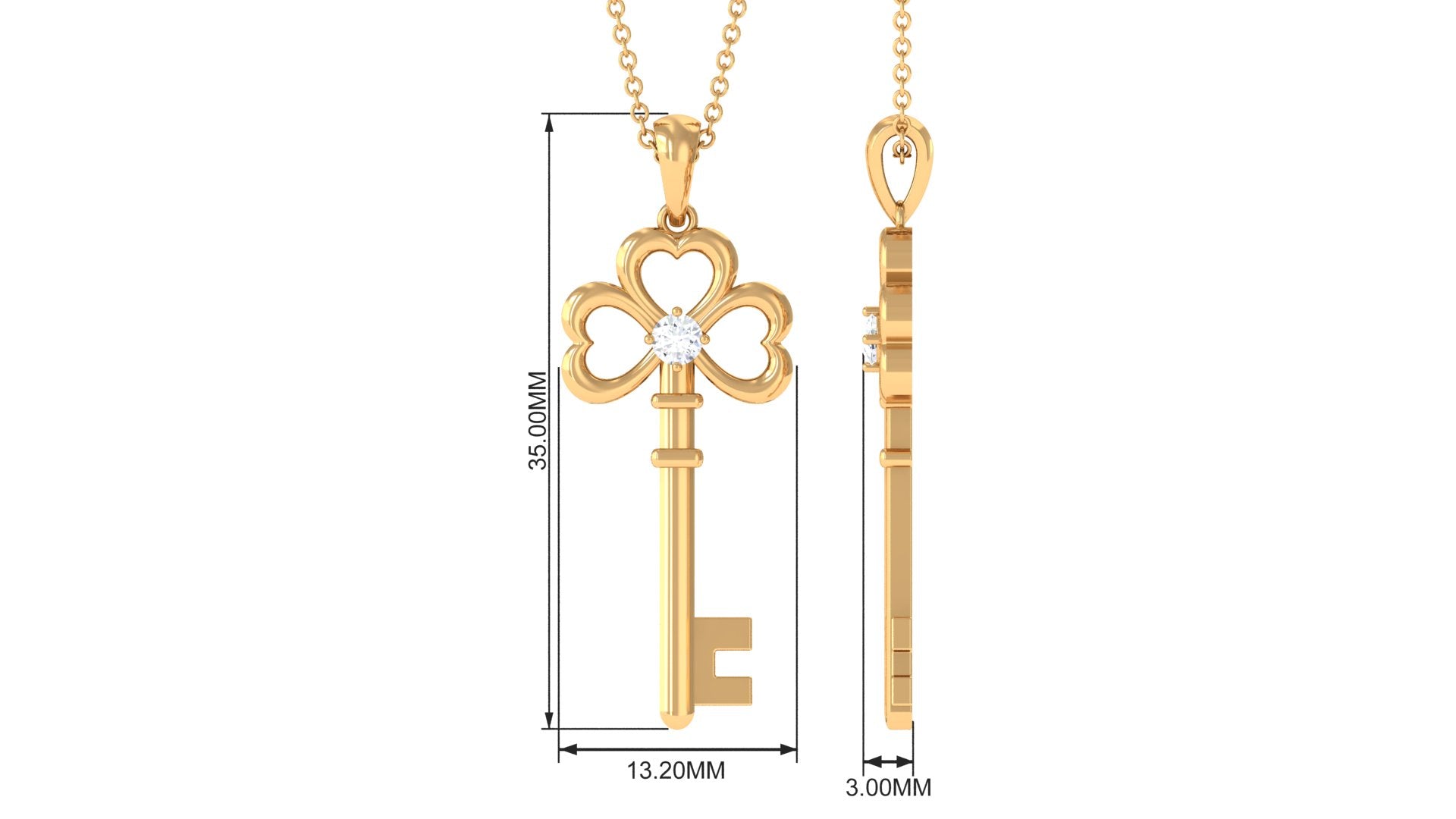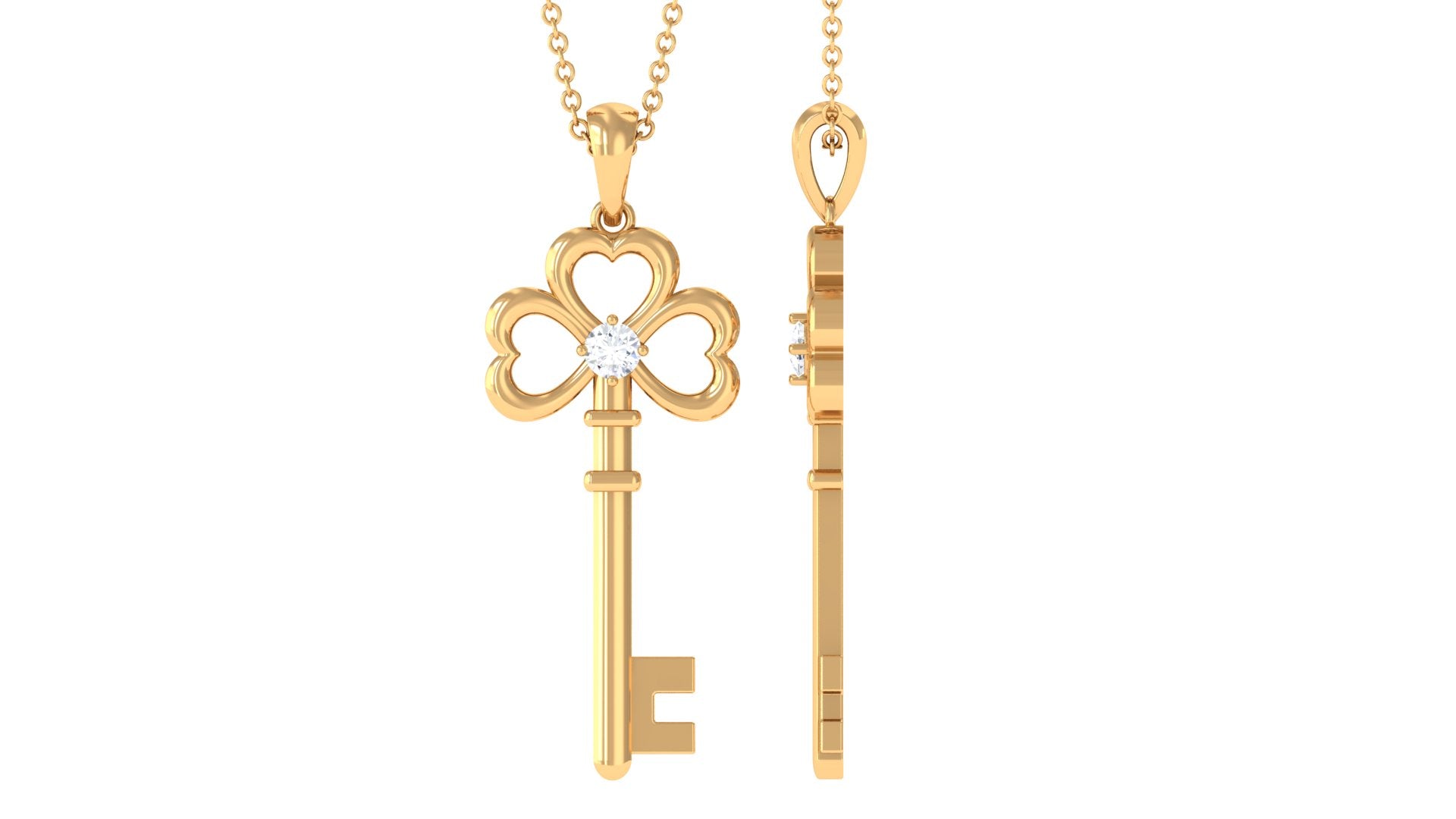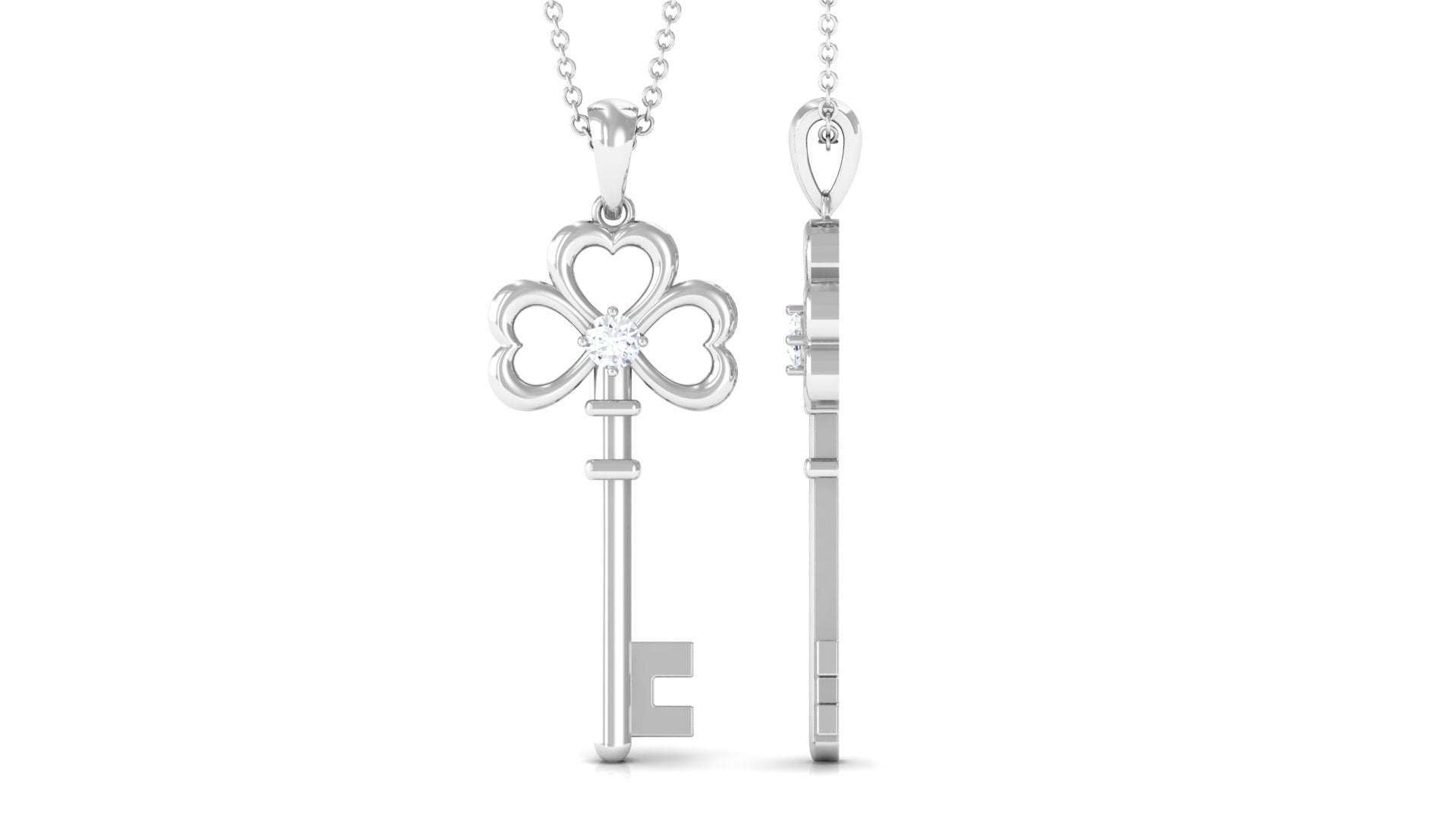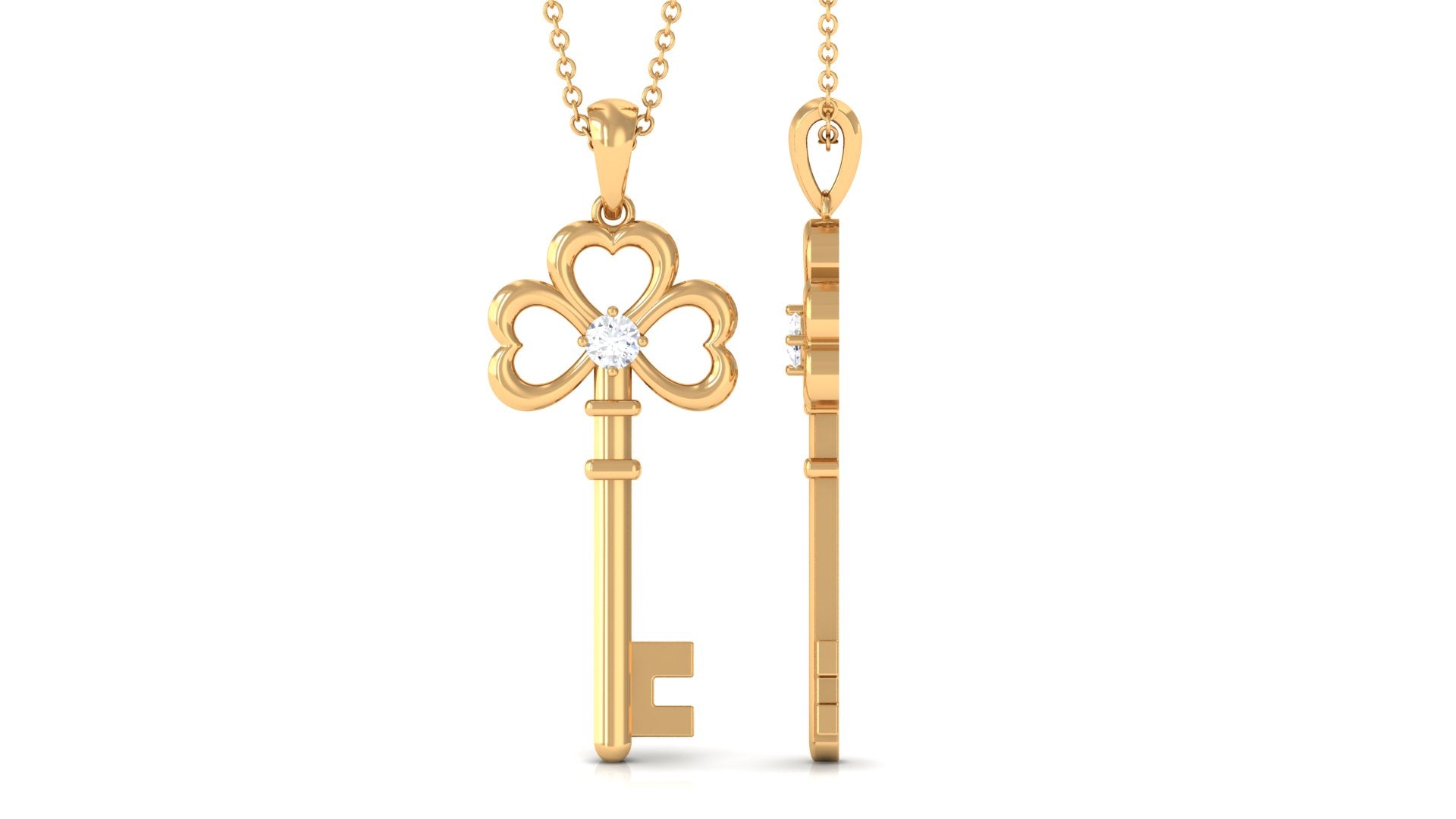 Our Heart Key Pendant has a heart element to grab your attention while a Natural Round Cut Moissanite sparkles delicately in the center secured by 4 Prong Setting. A vibrant symbol for all your styling possibilities, Key Pendant is given to symbolize the opening of new doors and have always been a classic statement piece for women of all ages.