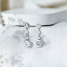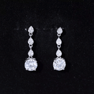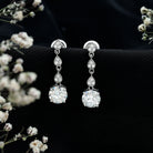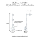 Ideal for any event, these exquisite Moissanite Hanging Earrings provide a sophisticated finishing touch to your ensemble. Crafted with a refined and classy appearance, their timeless design enhances their allure. These elegantly designed Dangling Earrings are made from 14k white gold plated silver. They showcase a 7 MM round cut Moissanite set in a prong setting, elegantly hanging from three pear-shaped elements, each embellished with round cut stones and linked by a silver chain. The captivating sparkle of these Bridal Earrings is sure to make a memorable impact. Experience the chic style and secure fit of the screw back closure, guaranteed to draw attention and spark conversations wherever you go.