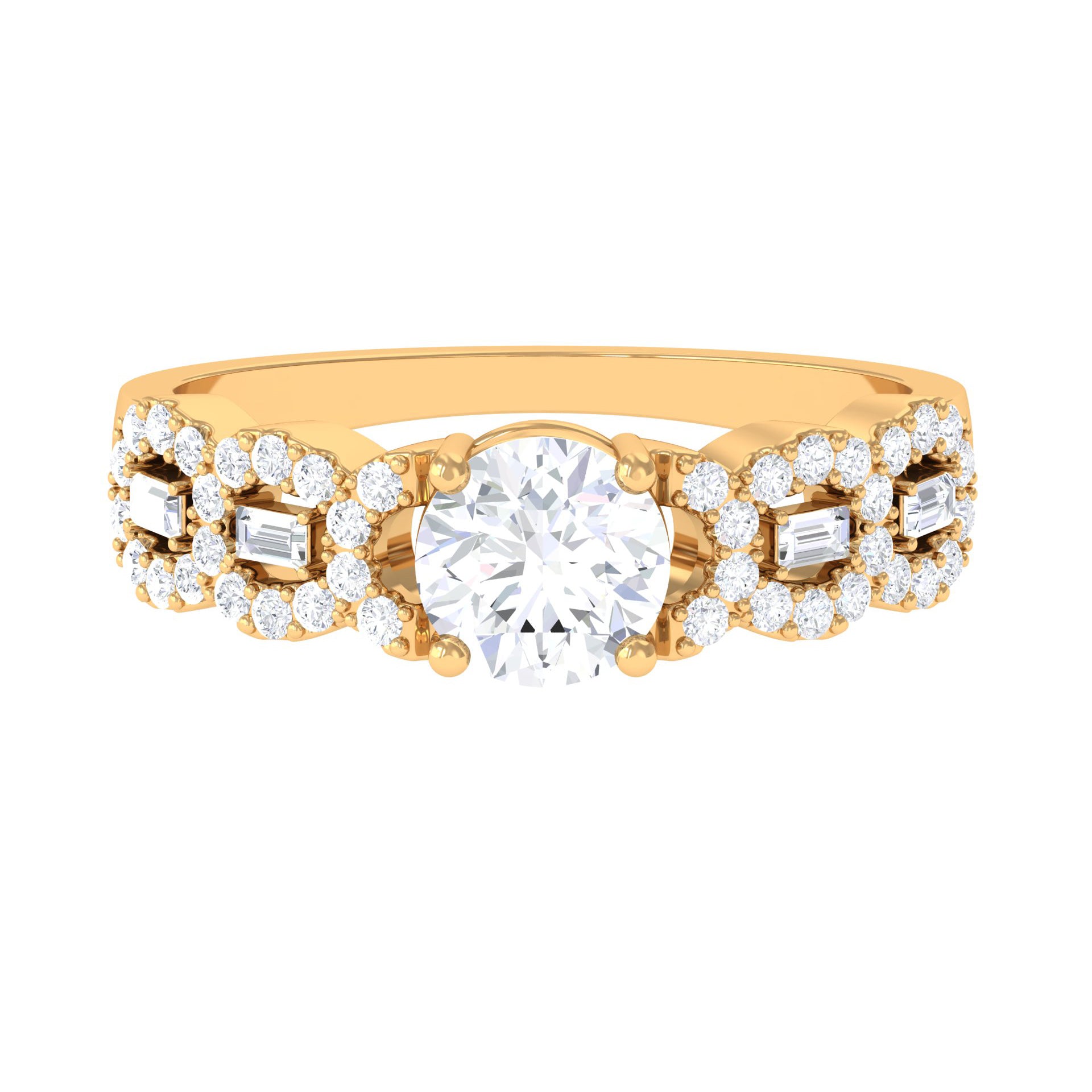 Why settle for an ordinary Moissanite Engagement Ring when you can have this masterpiece, full of sparkle and modern charm. At the center of this remarkable design rests a dazzling 6 MM round moissanite set securely in prong setting, radiating a fiery brilliance that captures attention from every angle. The central stone is beautifully complemented by an intricate arrangement of round and baguette moissanites along the band, creating a luxurious and balanced composition. This Designer Engagement Ring speaks of refined artistry and detailed craftsmanship. The timeless detailing and stunning sparkle makes it an ideal choice for someone who appreciates bold elegance and thoughtful design. Whether viewed from the top or admired from the side, the brilliance of the stones and the finesse of the setting offer an enchanting experience. Perfect for a proposal or a meaningful gift, this Round Cut Engagement Ring is more than just a symbol of love - it is a statement of sophistication and individuality, designed to be treasured for a lifetime.