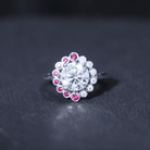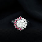 Looking for a perfect ring to make your lady happy, weve got your back with this Moissanite Ruby Designer Ring crafted precisely with 14K White Gold Plated Silver. The ring features an 8 MM Round Shape Moissanite securely placed in Prong Setting and encircled by smaller round shape Moissanite and Lab Grown Ruby secured in Bezel Setting. This Halo Engagement Ring beholds the classic shine of D-VS1 Quality Moissanite and AAAA quality Lab Grown Ruby, which makes it perfect for the celebration of love. This Large Engagement Ring will be delivered to you in a velvet pouch for storage, along with the certificate of authenticity.