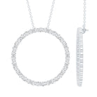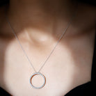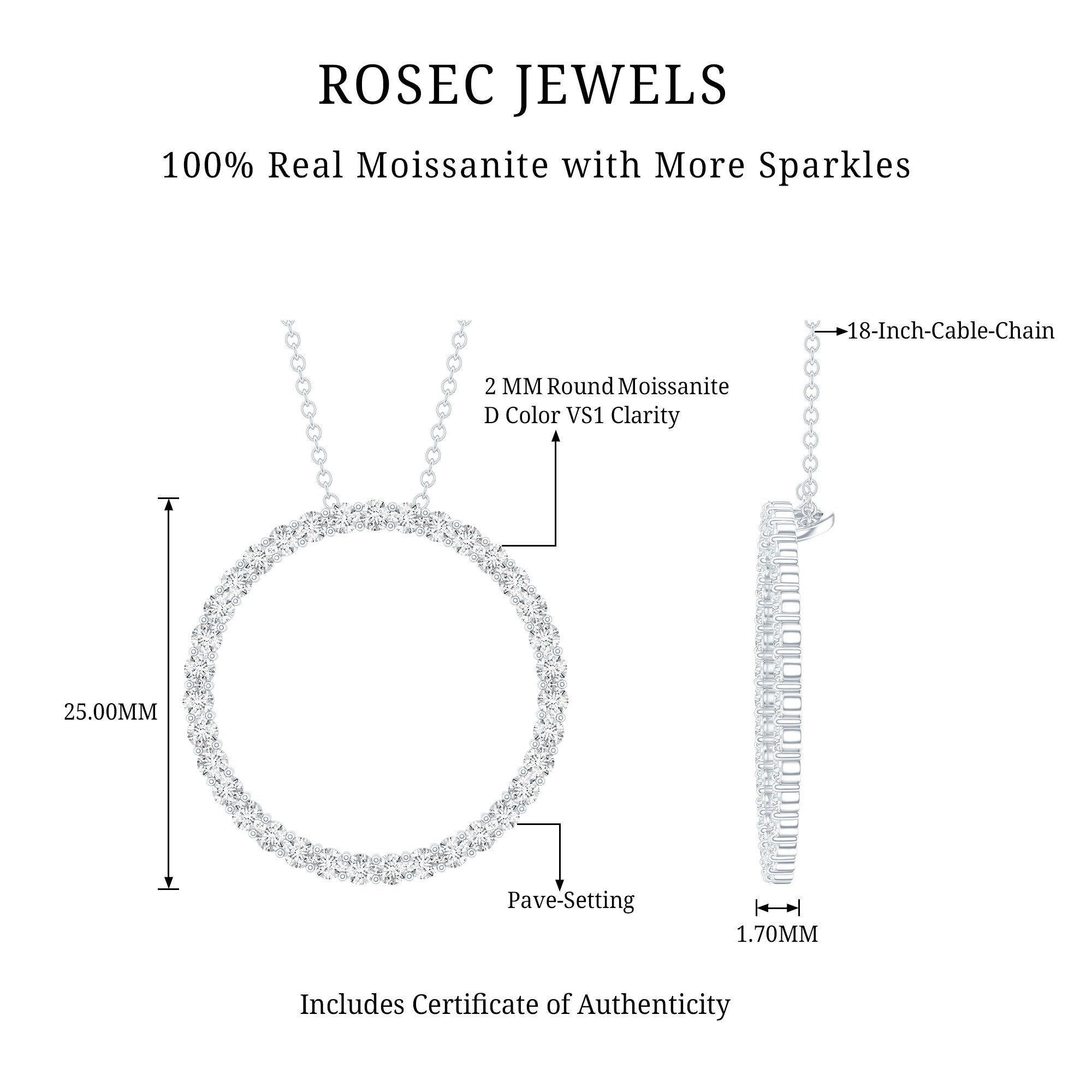 This Round Pendant Necklace is beautifully simple and stylish, providing the classic elegance you want for your special occasions. Made with care in 14K White Gold Plated Silver, this Circle Pendant Necklace can effortlessly elevate your everyday outfits. Adorned with round cut moissanite stones set in a circular metal frame in pave setting, the design represents your everlasting love. It hangs from a strong cable chain that allows you to adjust it to different lengths. Easy to style and perfect for everyday elegance, it brings a touch of charm to any outfit. Whether you are getting ready for work, meeting friends for a relaxed brunch, or dressing up for an evening out, this piece adds a soft sparkle that never feels too bold. Crafted with care, the D-VS1 quality moissanite stones offer brilliant shine while the smooth circle gives the piece a timeless feel. Our Moissanite Eternity Necklace is a symbol of forever love, perfect for gifting on special occasions such as Valentines Day, Anniversaries, Birthdays, New Years Day, Christmas, and many more. Your Open Circle Necklace arrives beautifully packaged in a jewelry box and includes a certificate of authenticity, offering both beauty and trust in one special piece.