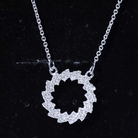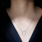 Our Eternity Pendant Necklace serves as a graceful reminder that true love lasts forever, beautifully and endlessly. It features a breathtaking display of timeless elegance. With its sleek open circle frame, the real allure comes from the delicate arrangement of sparkling Moissanite stones set over small curved bars. This design embodies the spirit of eternity - infinite and radiant. Made from 14K white gold plated silver, the Moissanite Circle Necklace is both lightweight and sturdy, making it ideal for everyday wear or to add a special touch for an occasion. It is classically stylish and utterly chic. This gorgeous Round Necklace offers a timeless appeal with its modern circle design. Accompanied by a fine cable chain, this Silver Circle Necklace sits gracefully on the neckline, infusing any outfit with a touch of everlasting love. Simple yet captivating, this piece honors eternal love, quiet strength, and beauty that endures through time.