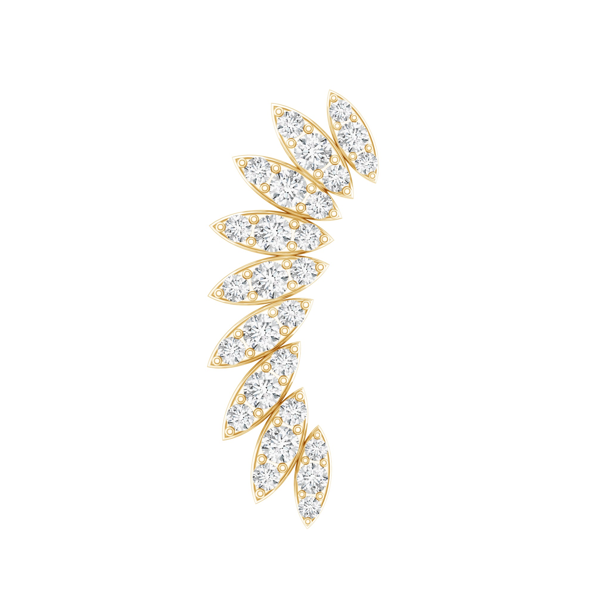Bring a free-spirited vibe to your ear stack with this Moissanite Climber Earring, designed to add sparkle with a unique and flowing look. Inspired by the natural shape of a feather, this piece features a graceful arrangement of round cut moissanites that shimmer beautifully as they follow the curve of your ear. The design creates a climbing effect along the cartilage, making it an instant stand out whether worn alone or paired with other earrings. This Feather Climber Earring is perfect for those who love expressive jewelry with a modern twist. The moissanites add eye-catching shine while keeping the look lightweight and easy to wear. Made for comfort and everyday wear, the Moissanite Cartilage Earring sits securely on the cartilage or helix and is finished with a flat-back closure that feels comfortable against the skin. It stays in place while you move, making it a great choice for long days or nights out. Stylish and full of personality, this Crawler Earring is a fun way to show off your individual style and add a little sparkle to your look.