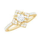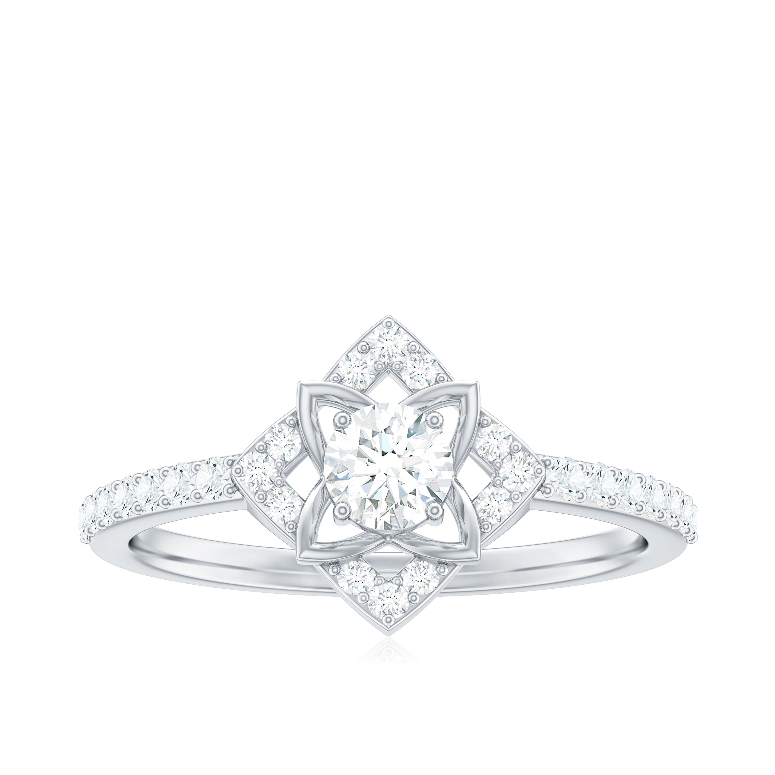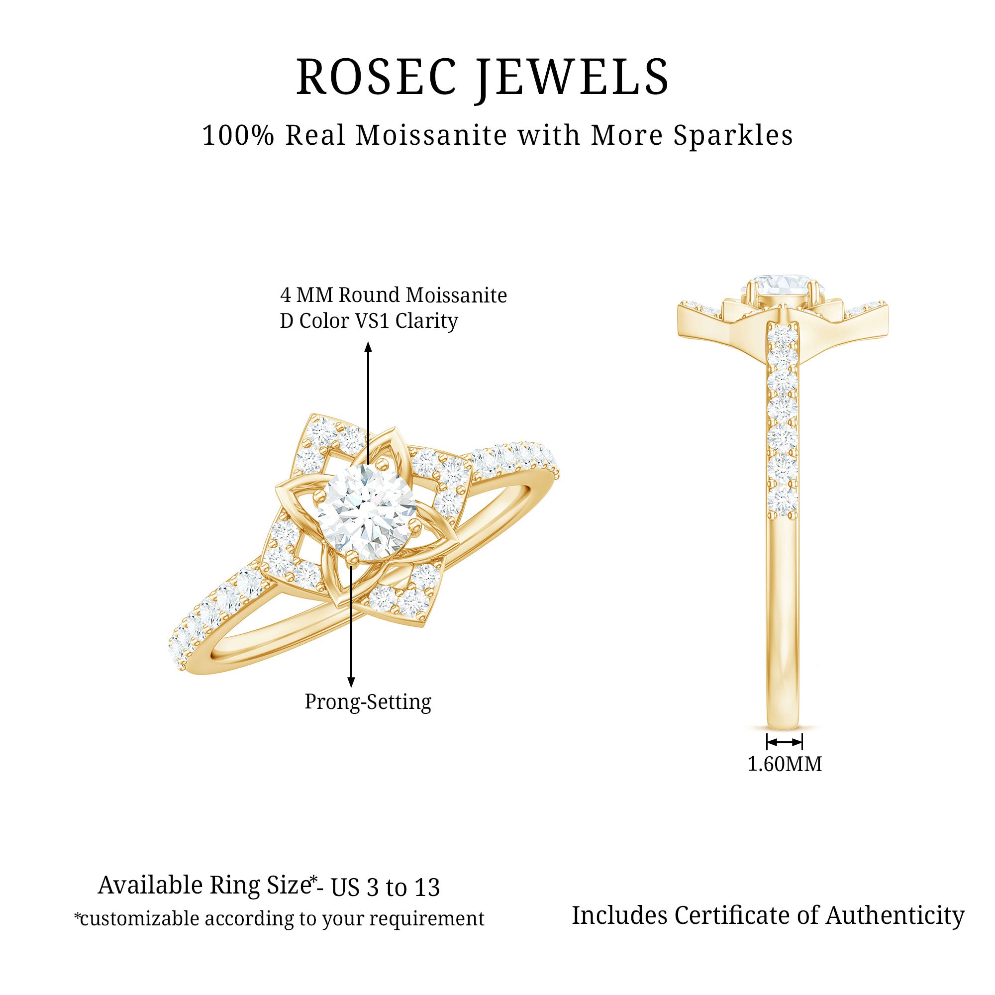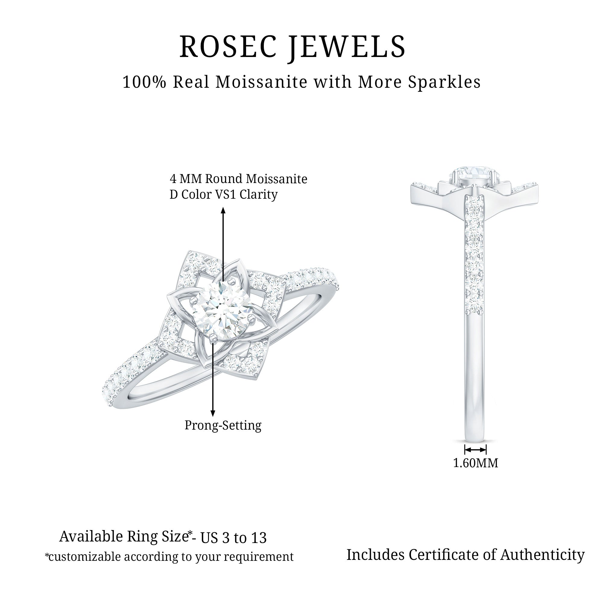 Experience the timeless elegance of this exquisite Flower Engagement Ring, featuring a dazzling 4 MM round cut moissanite at its heart. Expertly set in secure prong setting, this centerpiece stone radiates remarkable brilliance and fire, drawing the eye with its captivating sparkle. Surrounding the central moissanite is an intricate floral design crafted from a delicate arrangement of shimmering stones, forming a beautiful blossom that symbolizes love, growth, and new beginnings. Each moissanite in this ring is carefully selected for its exceptional quality, boasting a D color and VS1 clarity. The design gracefully combines classic sophistication with a contemporary floral motif, making it a perfect symbol of romance and individuality. Whether chosen as an engagement ring or a meaningful gift, this Moissanite Engagement Ring is a celebration of beauty, purity, and commitment. Its refined sparkle and elegant craftsmanship make it an heirloom-worthy treasure to cherish for a lifetime. Celebrate your unique love story with this stunning Flower Ring for Women, a harmonious blend of nature’s inspiration and enduring elegance, destined to shine bright through all of life’s most cherished moments.
