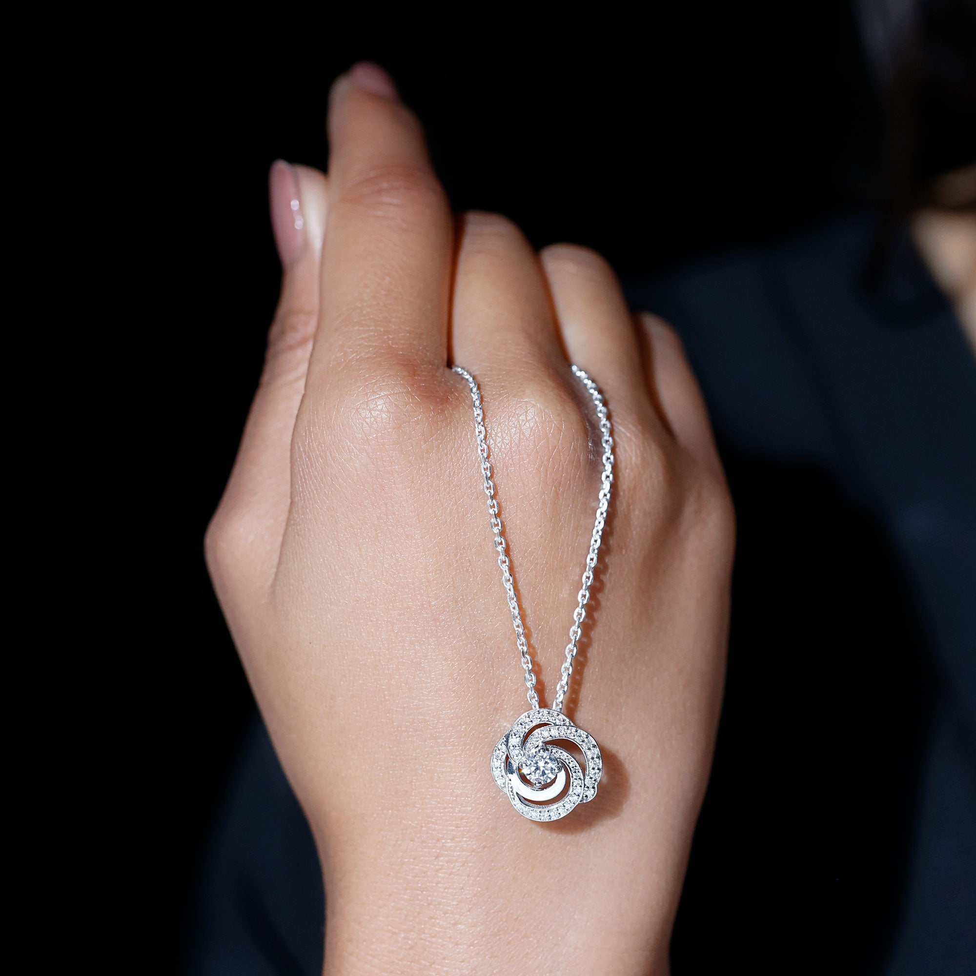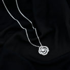 Make her go swirl in love over this Moissanite Pendant, crafted precisely with 14K White Gold Plated Silver. The pendant features a 5 MM Round Shape Moissanite secured in Prong Setting and placed between a metallic swirl frame adorned with smaller Moissanite stones. This Flower Pendant dazzles with the classic shine of D-VS1 Quality Moissanite stones and is accentuated with a Standard Bail. It dangles in a Sturdy cable chain, which allows you to flaunt this pendant effortlessly. This Floral Pendant Necklace will be delivered to you in the signature velvet pouch with a certificate of authentication.