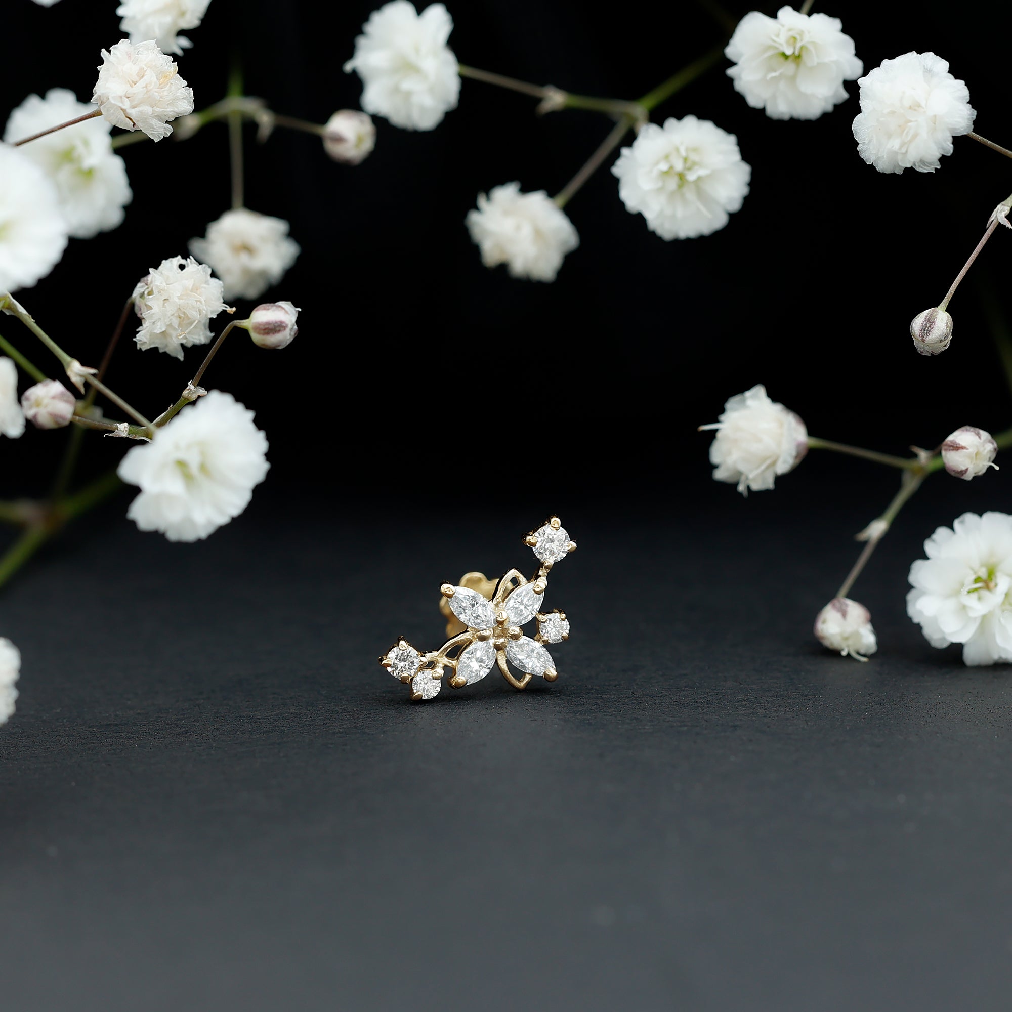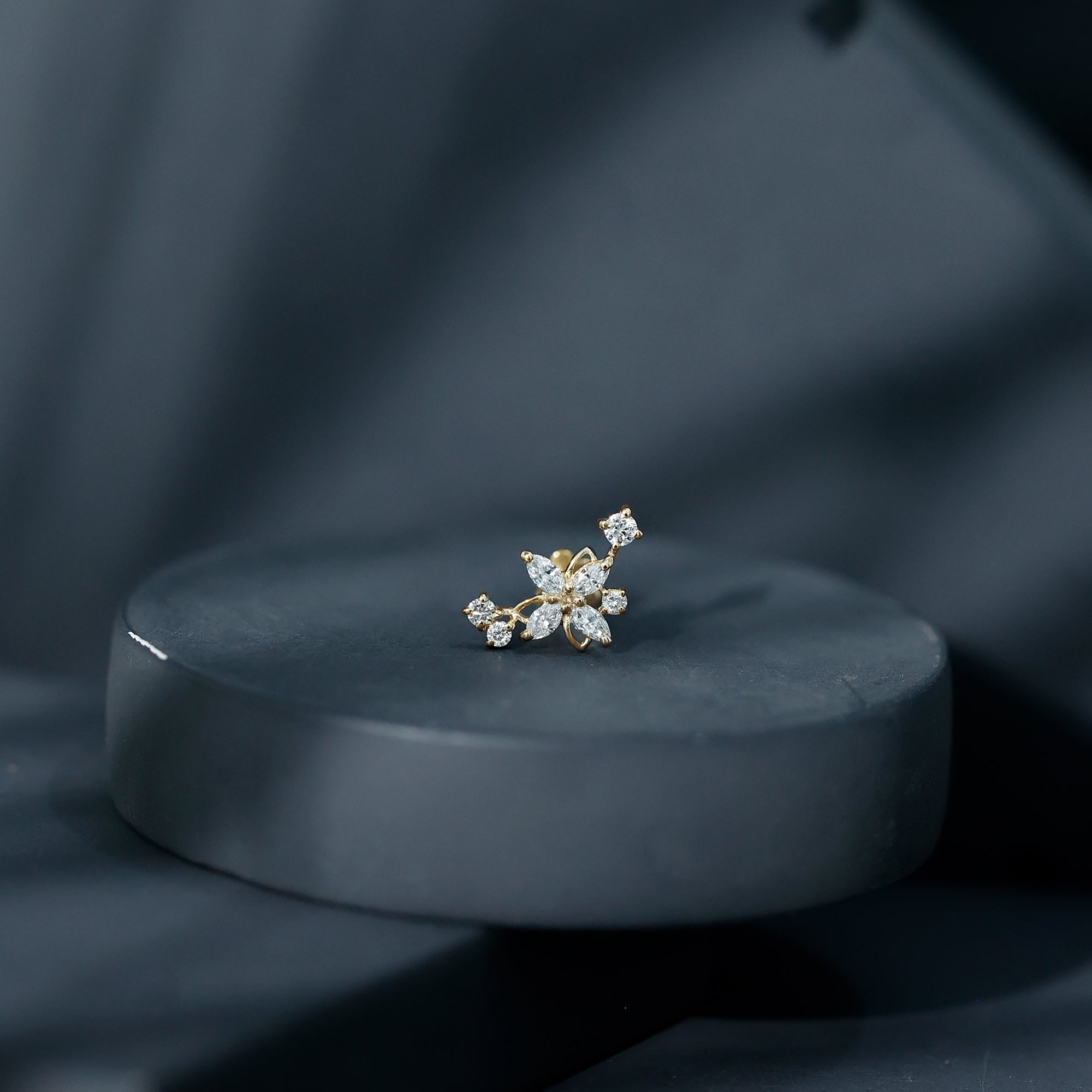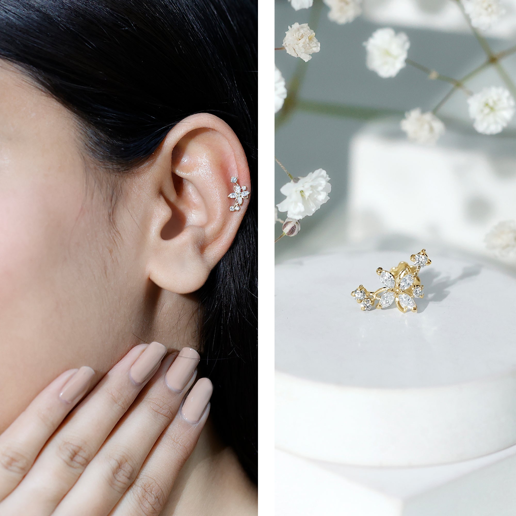 Artful design and a graceful sparkle unite in a Moissanite Crawler Earring, turning ear styling into a statement of elegance. Featuring a delicate flower motif at its center, this Cartilage Earring is thoughtfully enhanced with a combination of marquise and round cut moissanites. Each stone is held securely in prong setting, allowing for exceptional brilliance. Created for versatility, this piece is perfect for helix, upper lobe, or cartilage piercings, adding movement without overpowering your look. The floral detailing brings a romantic touch, while the diverse stone shapes contribute modern sophistication and visual appeal. Completed with a flat back closure, the Flower Helix Earring ensures a secure and comfortable fit, making it ideal for extended wear during special occasions or stylish everyday moments. Perfect for those who value unique body jewelry, this Moissanite Flower Earring pairs beautifully with minimalist studs or layered ear stacks for a chic, fashion-forward aesthetic. You can gift this Moissanite Helix Earring to someone you love, like your daughter, mom, friend, girlfriend, or wife, as a New Years, Birthday, Anniversary, or Christmas Gift. Whether you are dressing up for a special occasion or adding a touch of shine to your everyday outfit, it is a piece that instantly lifts your style.