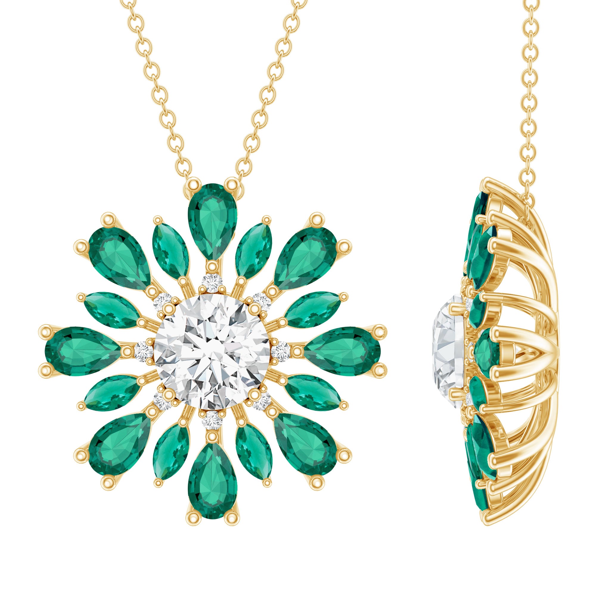 Bring floral elegance to life with this enchanting Statement Flower Necklace, a show-stopping piece inspired by the beauty of nature in full bloom. At the heart of this radiant design sits a brilliant 7 MM round moissanite of D Color and VS1 Clarity, meticulously set in prong setting. Encircling the center stone is a classy arrangement of round cut dainty moissanites and vivid green lab created emeralds, thoughtfully placed in a stunning combination of pear and marquise cuts. These emeralds mimic the elegance of flower petals, extending outward in a vibrant burst of color that evokes the look of a blossoming bloom. Every element of this Moissanite and Emerald Necklace has been crafted to reflect harmony, balance, and grace. The interplay between the vivid green emeralds and the brilliant cut moissanites gives this piece a luxurious look. Perfect for special occasions, glamorous evenings, or anyone looking to make a bold style statement, this piece effortlessly captures attention and admiration. Whether you are gifting it to someone who appreciates bold, beautiful jewelry or adding a floral flourish to your own collection, this Moissanite Necklace for Women is a celebration of beauty, sparkle, and timeless charm - designed to bloom forever.