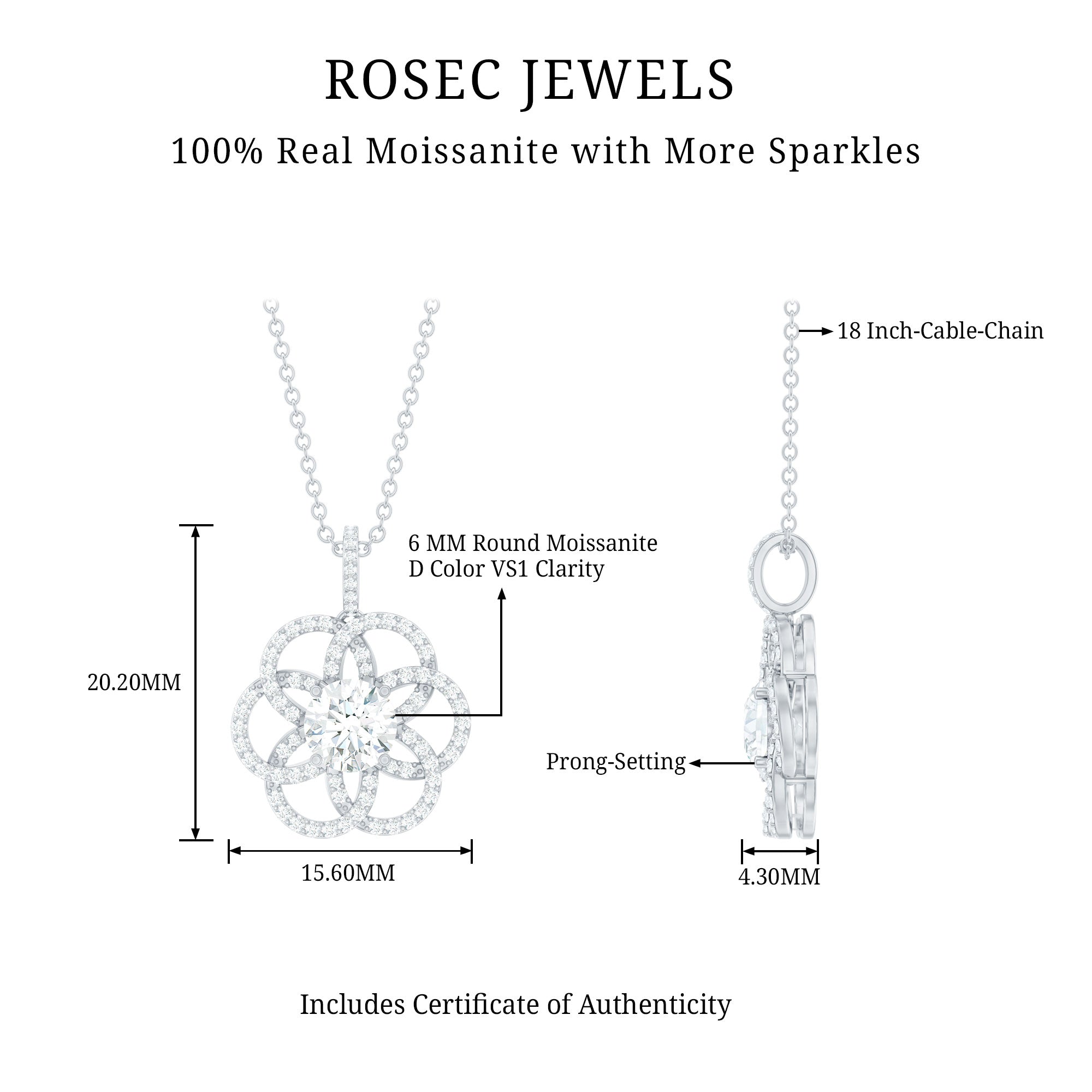 Let your style blossom with this Flower Pendant Necklace, designed to add a touch of natures grace to your jewelry collection. It features a 6 MM round cut moissanite in the center set in secure prong setting and surrounded by multiple intertwined open circles adorned with small sparkling stones creating a floral pattern. An accented bail connects the Moissanite Pendant with a secure and comfortable cable chain, the adjustable fit allows you make it a truly personalized piece with a perfect length. This Floral Pendant is created in 14K White Gold Plated Silver, making it a versatile addition to your jewelry. It is perfect for everyday wear, cocktail parties, or any celebrations - wear this and watch every eye in the room turn to you.