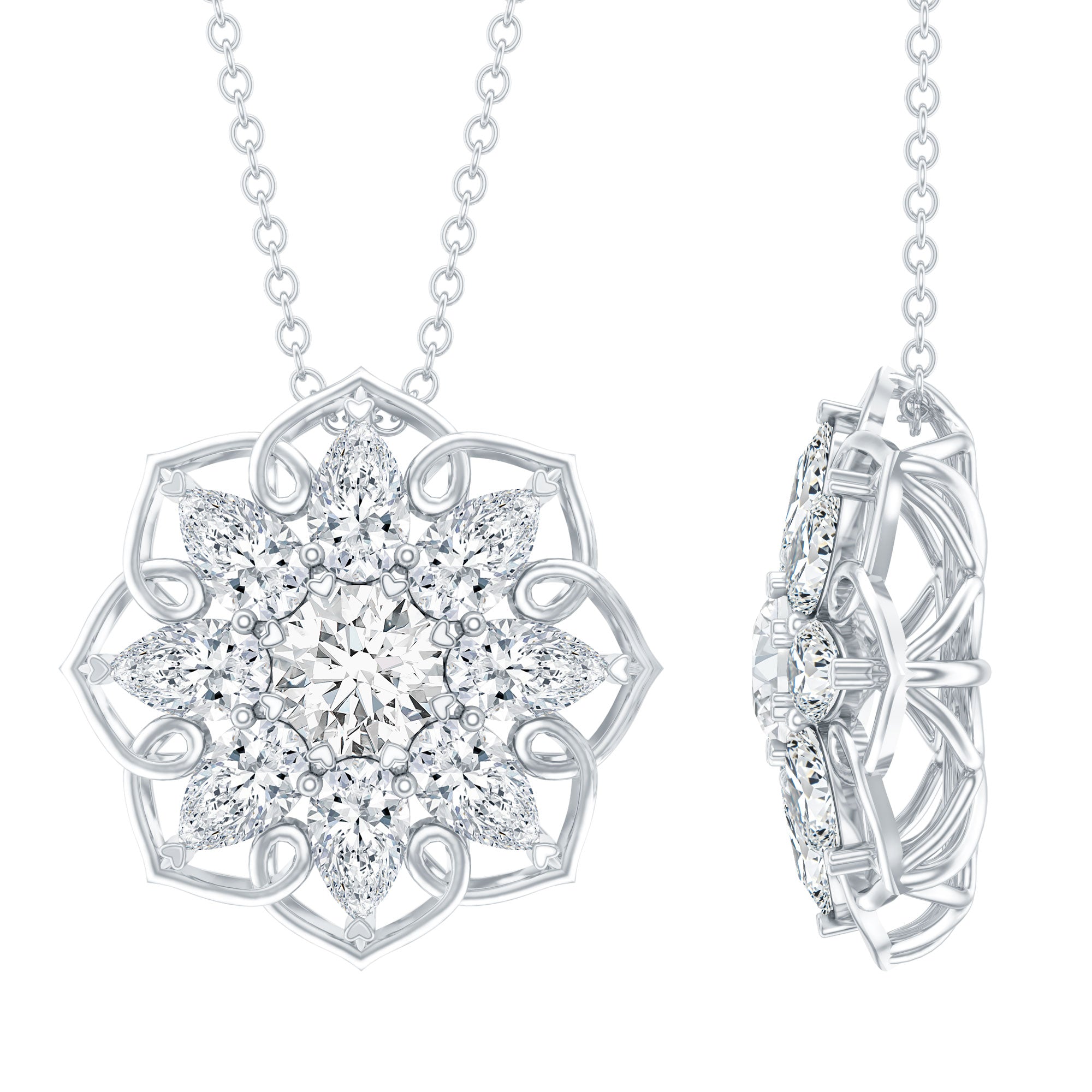 Embrace your neckline with this Moissanite Flower Necklace, precisely crafted with 14K White Gold Plated Silver. The Pendant features round and pear shaped Moissanite placed in flower patterns. This pendant shines brightly with D-VS1 Quality Moissanite. This Statement Necklace dangles with a sturdy chain, which beautifully makes it sit on the neckline. This pendant has an elegant look which makes it a perfect option for your special occasion as it represents strength, love, and beauty. The Moissanite Necklace is a classic jewel worn solely or stacked with another minimal pendant to achieve a more appealing look. The Floral pendant will be delivered to you in a signature jewelry box for storage when not in use, with the certificate of authenticity. The pear and round shaped stones provide the Moissanite Cocktail Necklace with a classic sparkle that catches the eye while remaining easy to wear. The hidden bail ensures the design remains the focal point and lets the pendant rest perfectly along the neckline. It is comfortable, fashionable, and rich in detail, making it a piece you will want to wear repeatedly. Whether you wear it every day or save it for special occasions, it brings charm, brilliance, and character to any jewelry collection.