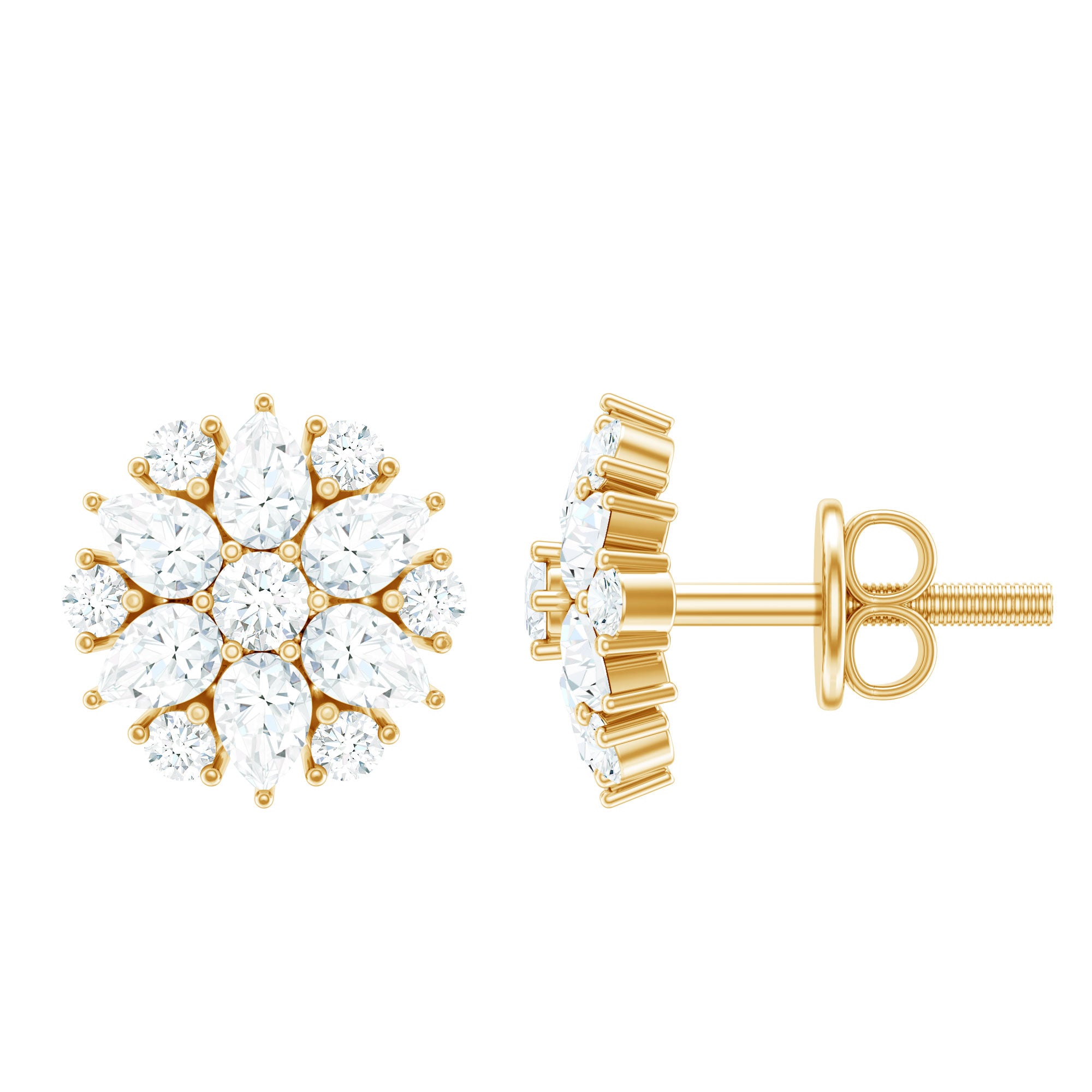 Elevate your look with these Flower Stud Earrings as they are a piece of attention-grabbing jewelry for you. Bejeweled with Pear and Round Moissanites as a cluster in Prong Setting. Make everyone stop and stare at our statement pair of Cluster Earrings when you flaunt them with your party outfits. Celebrate your wonderful years of togetherness by giving this delightful pair of Moissanite Earrings to her as an anniversary gift.
